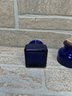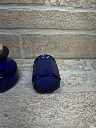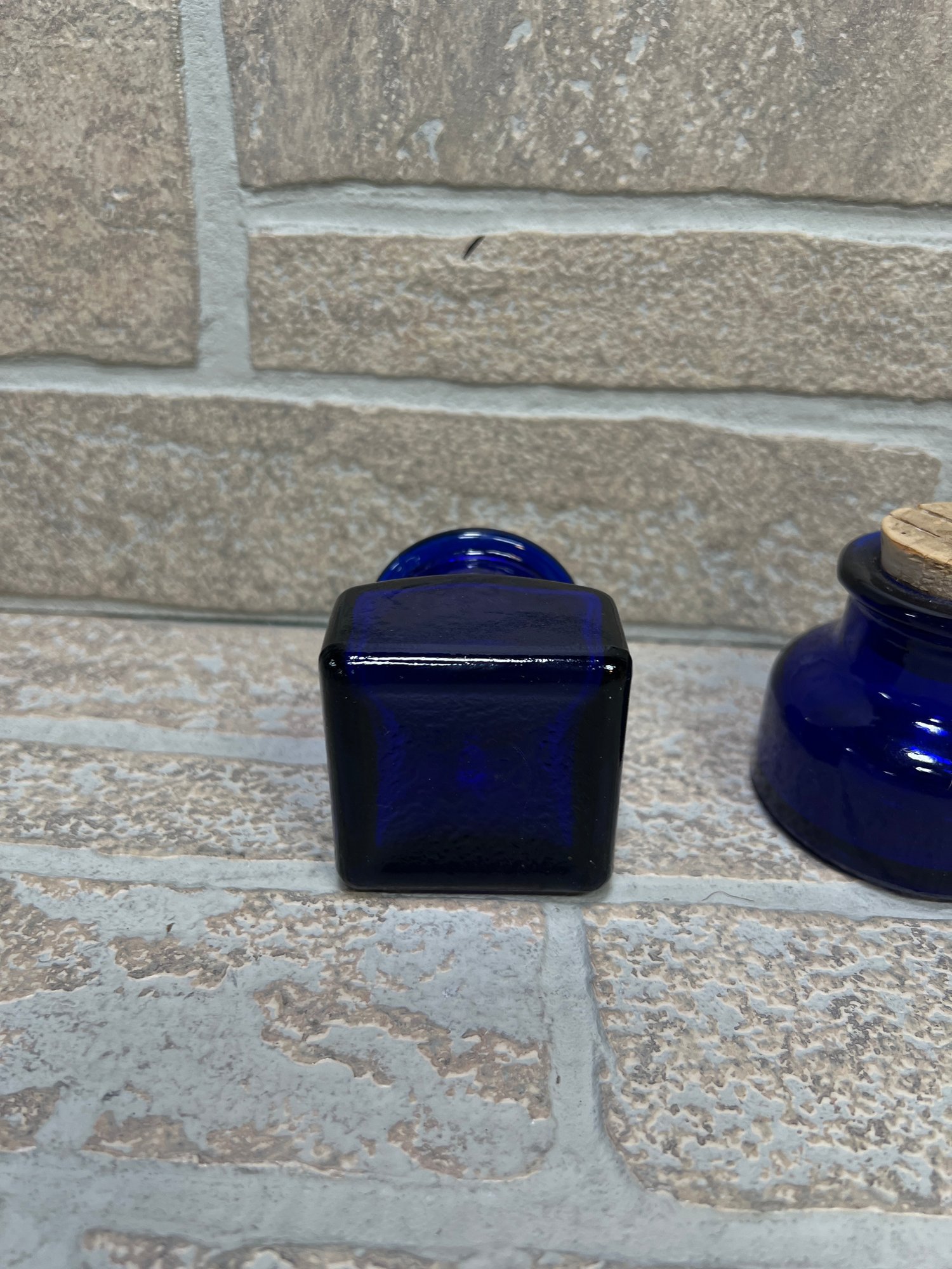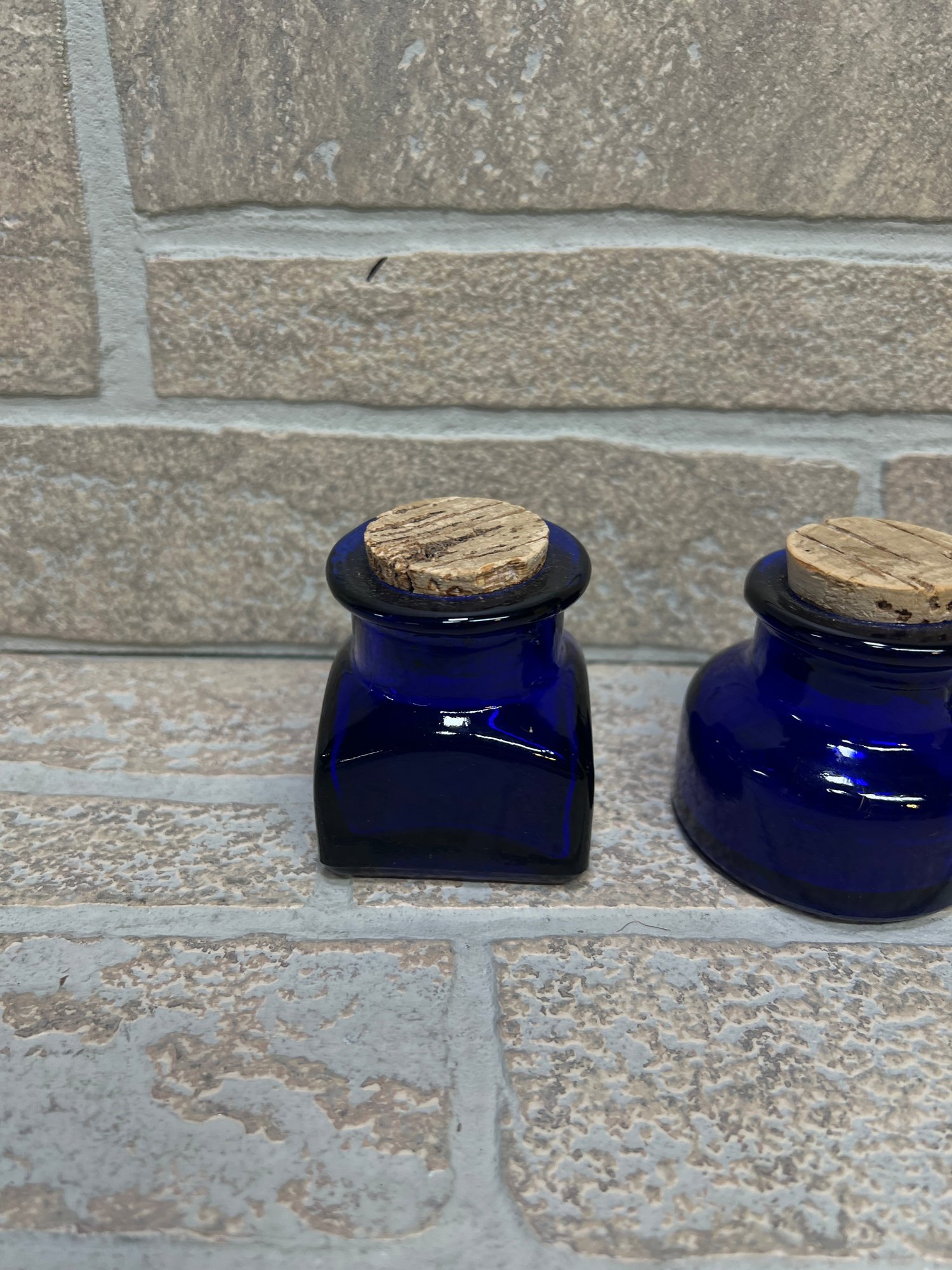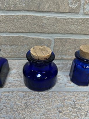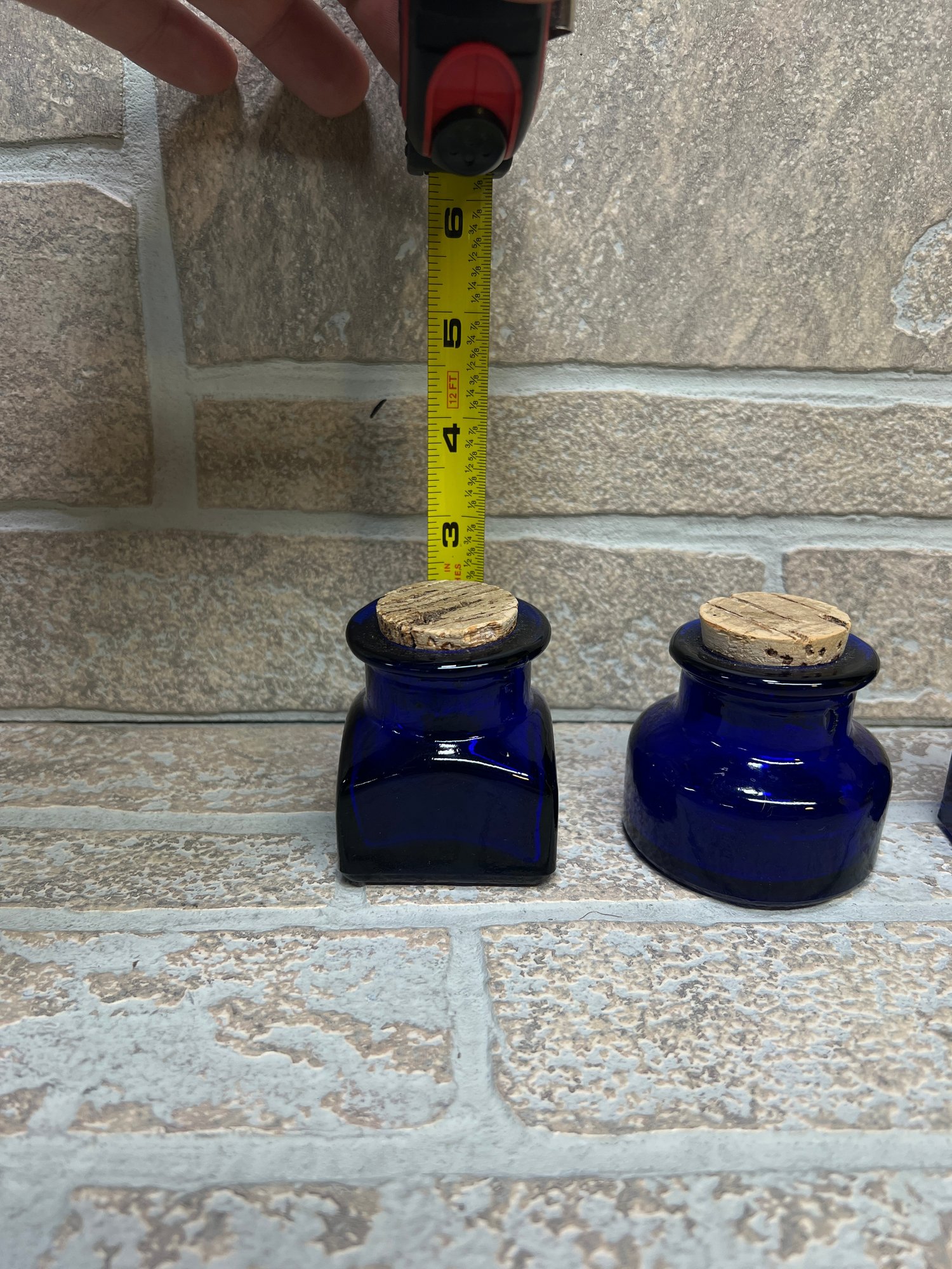 Set of three cobalt blue glass apothecary-style bottles with cork stoppers. These feature a rich deep blue color and classic shapes, perfect for display, storage, or decorative use.