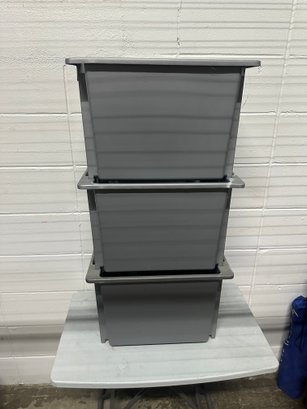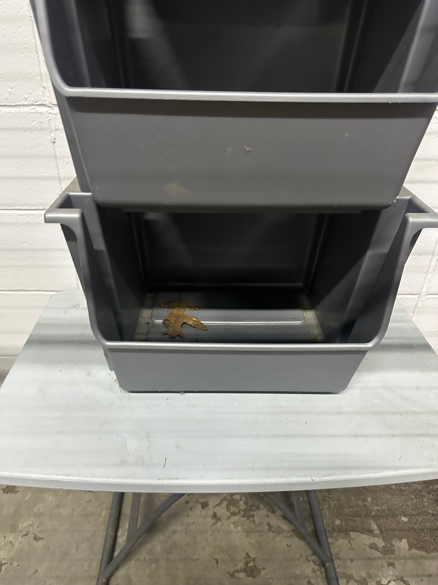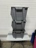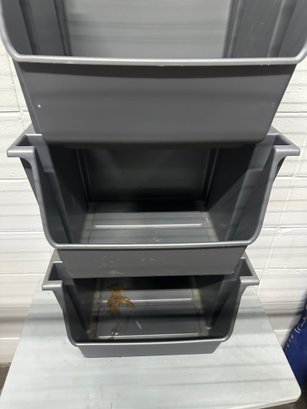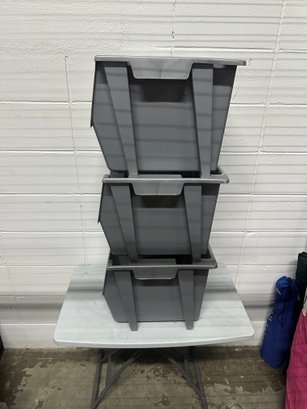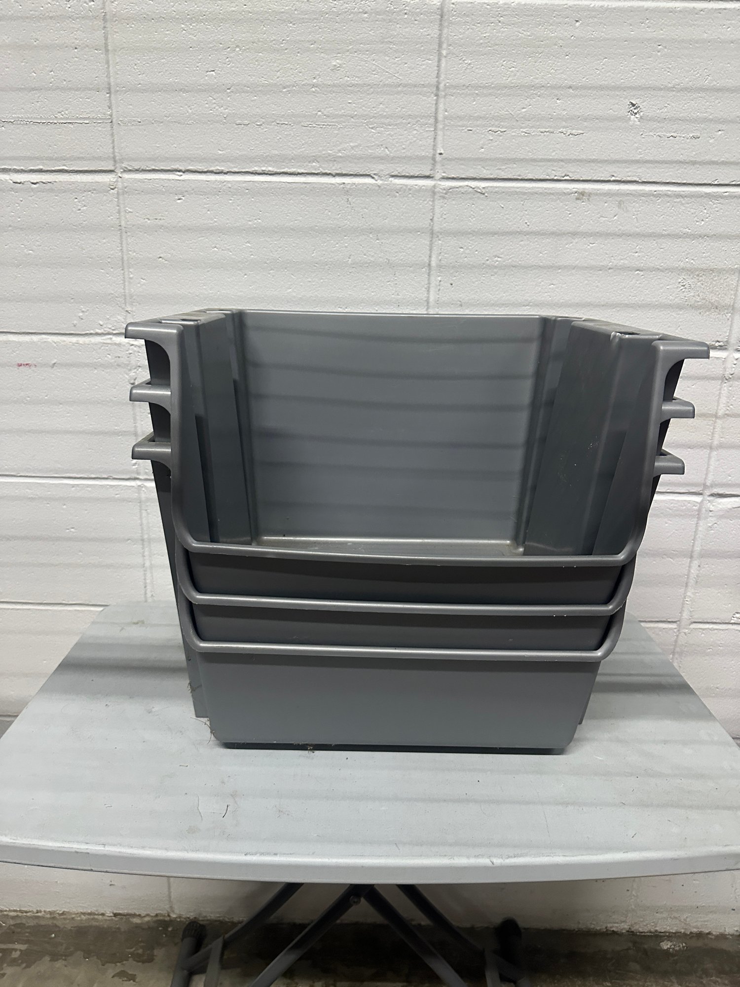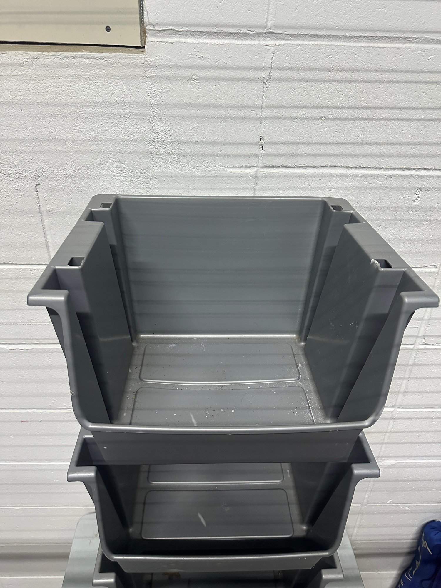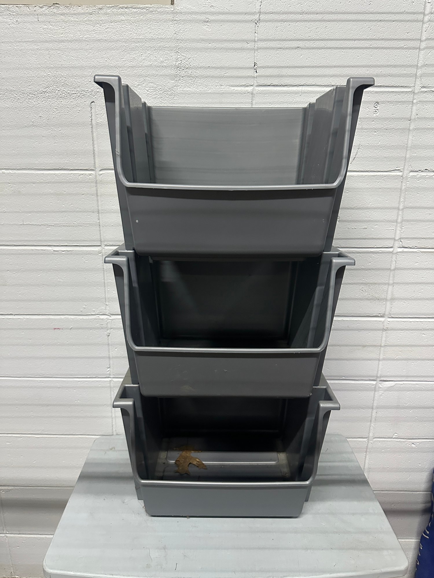 These bins feature integrated side supports that allow them to securely stack, making them great for organizing tools, garage items, inventory, or household storage.