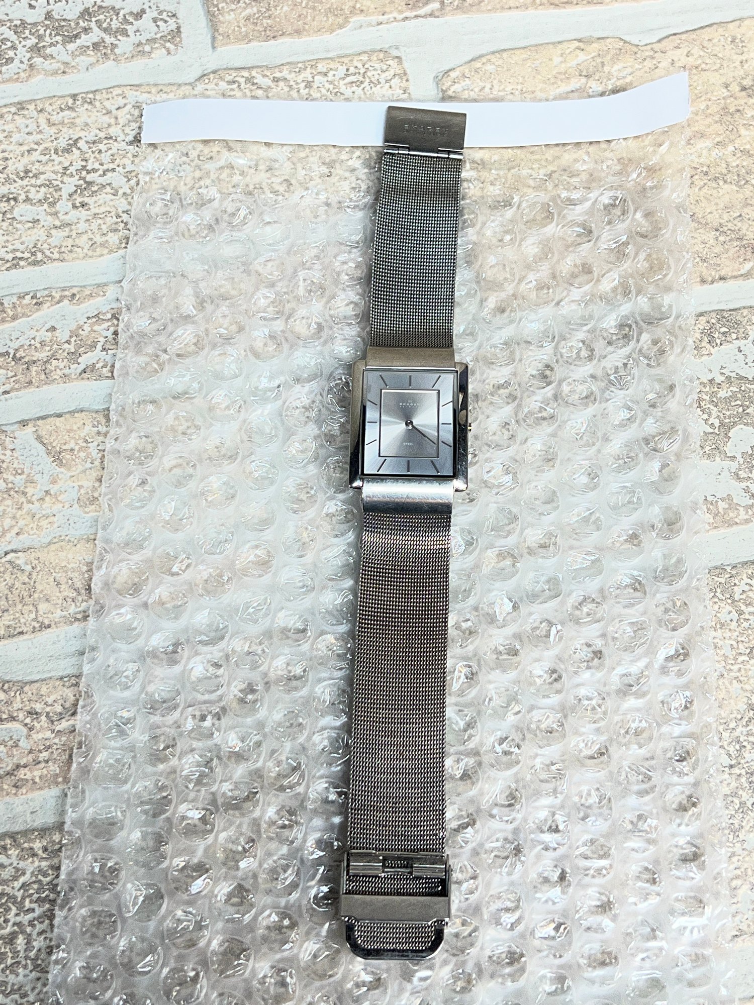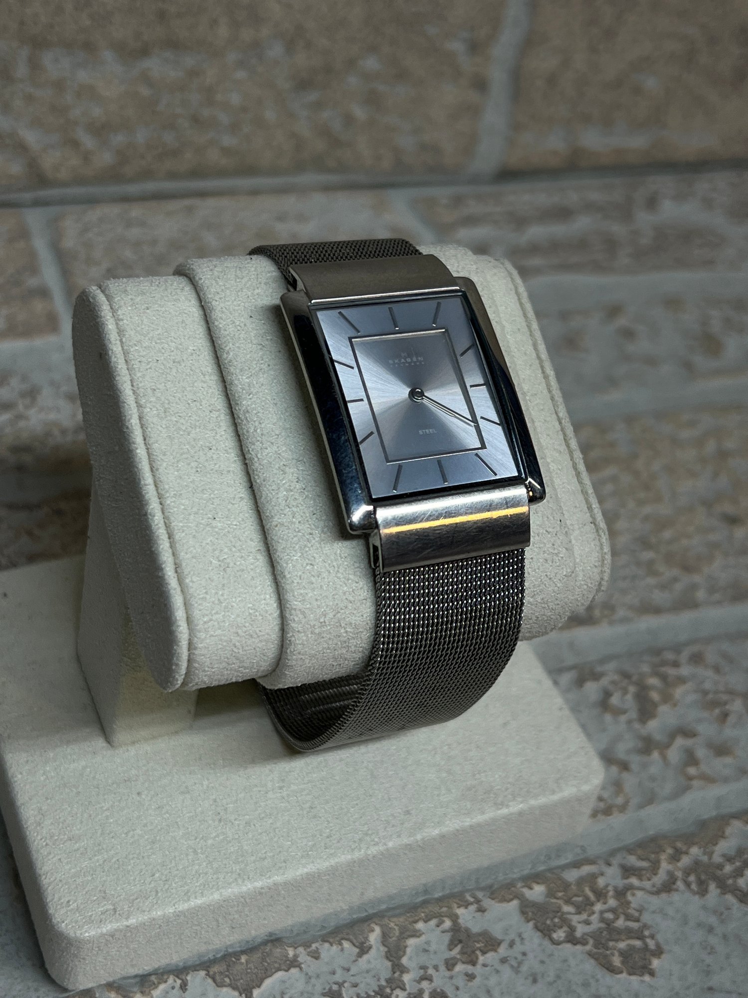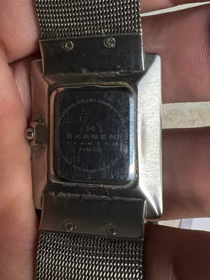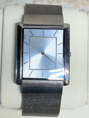 Sleek and minimalist Skagen Denmark rectangular wristwatch featuring a modern stainless steel design and mesh band.