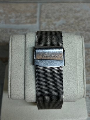 This watch showcases Skagen’s signature Scandinavian style with a clean silver-tone dial, slim profile, and elegant rectangular case. The fine mesh band provides a comfortable fit and a polished, contemporary look.