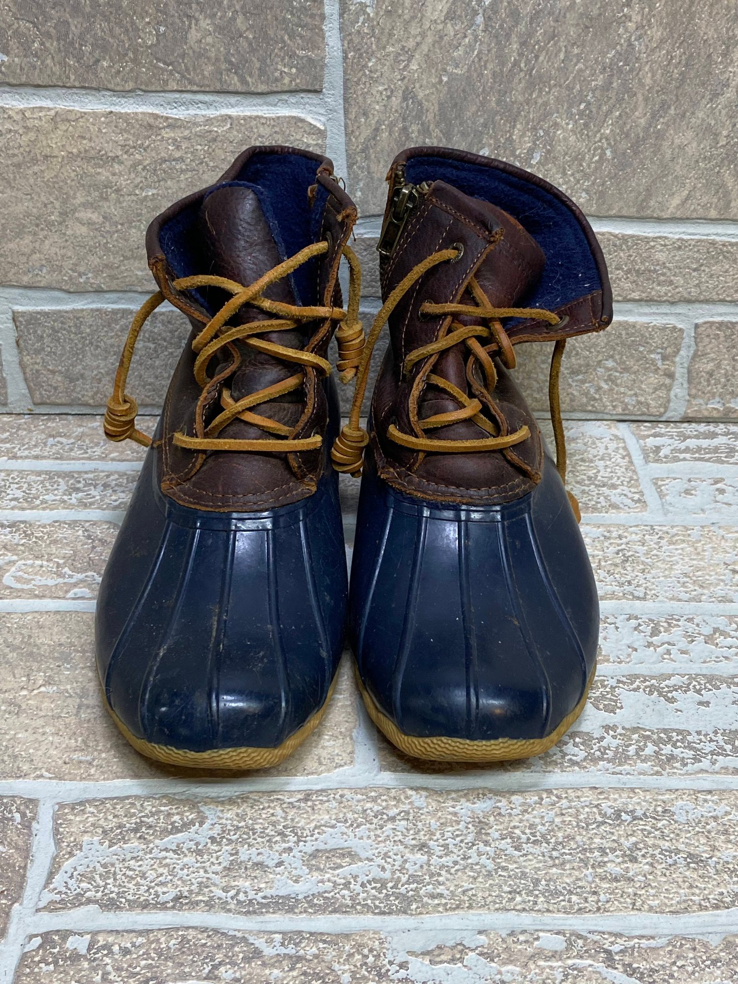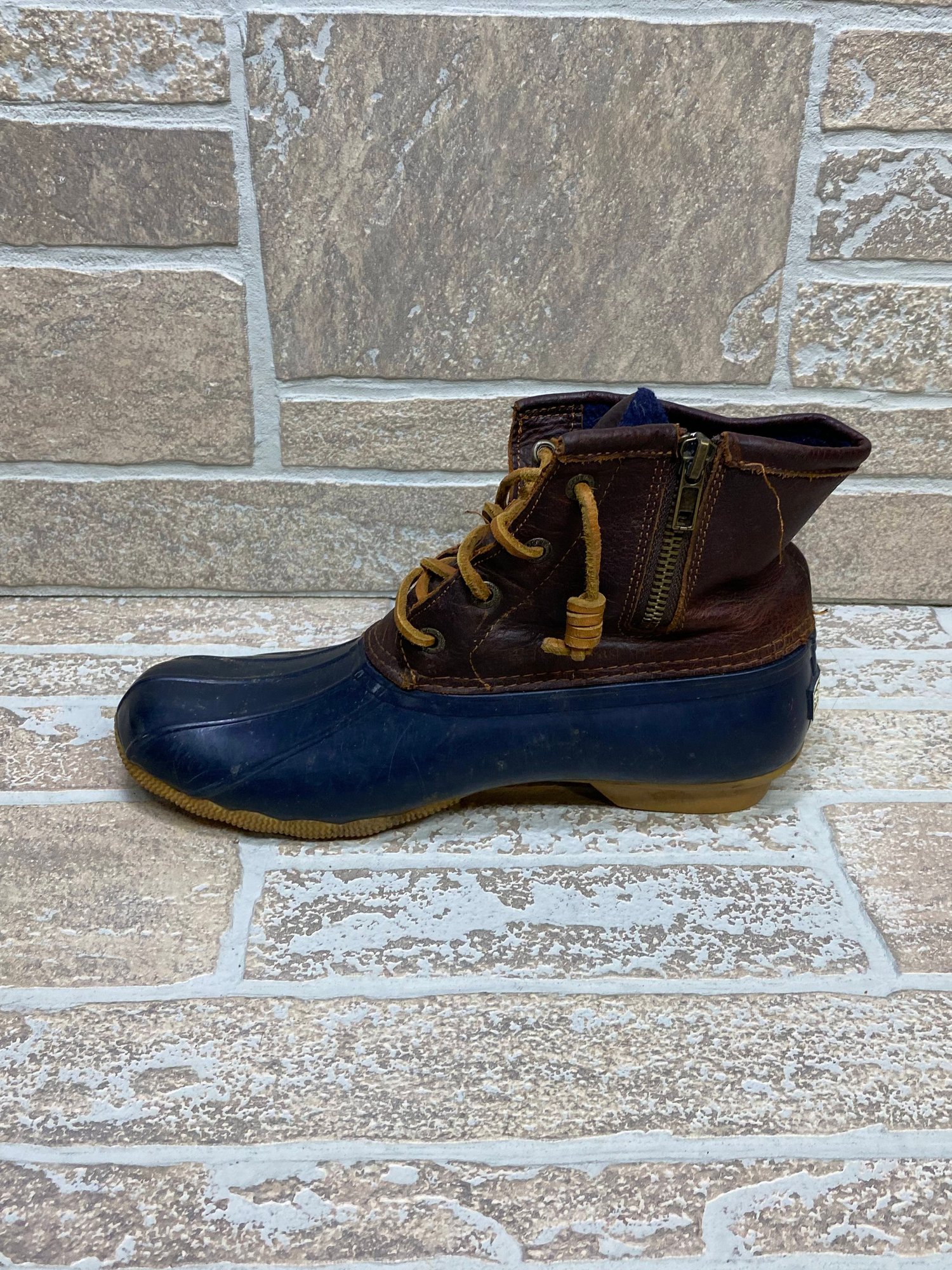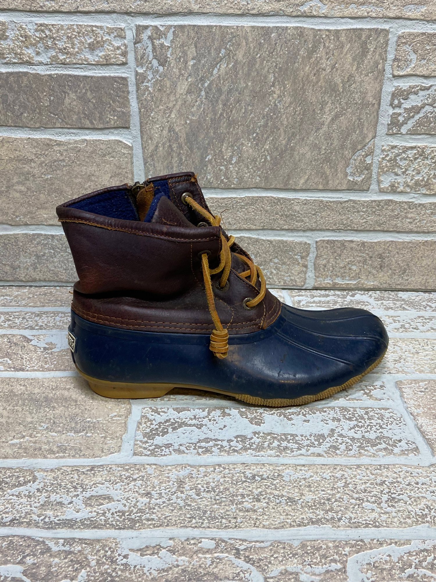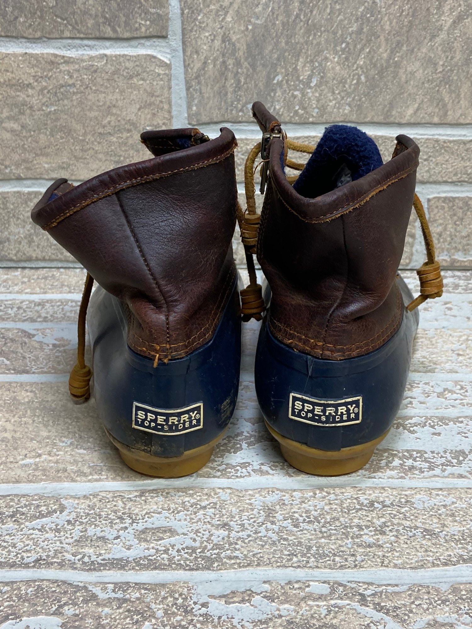 Classic pair of Sperry Top-Sider duck boots featuring a durable blue rubber lower and brown leather upper. Designed for wet weather with a waterproof rubber shell and warm interior lining.