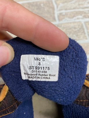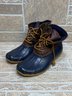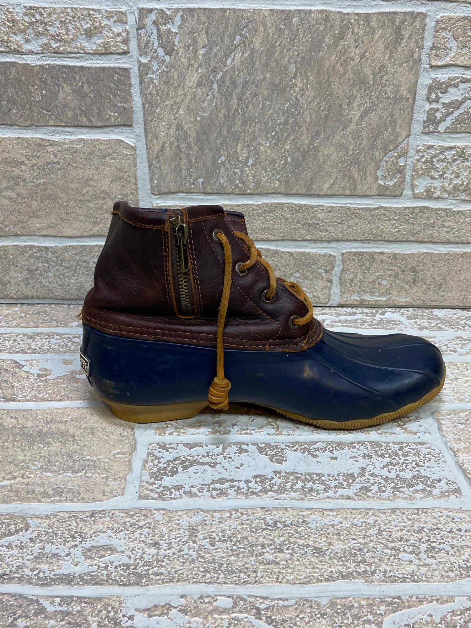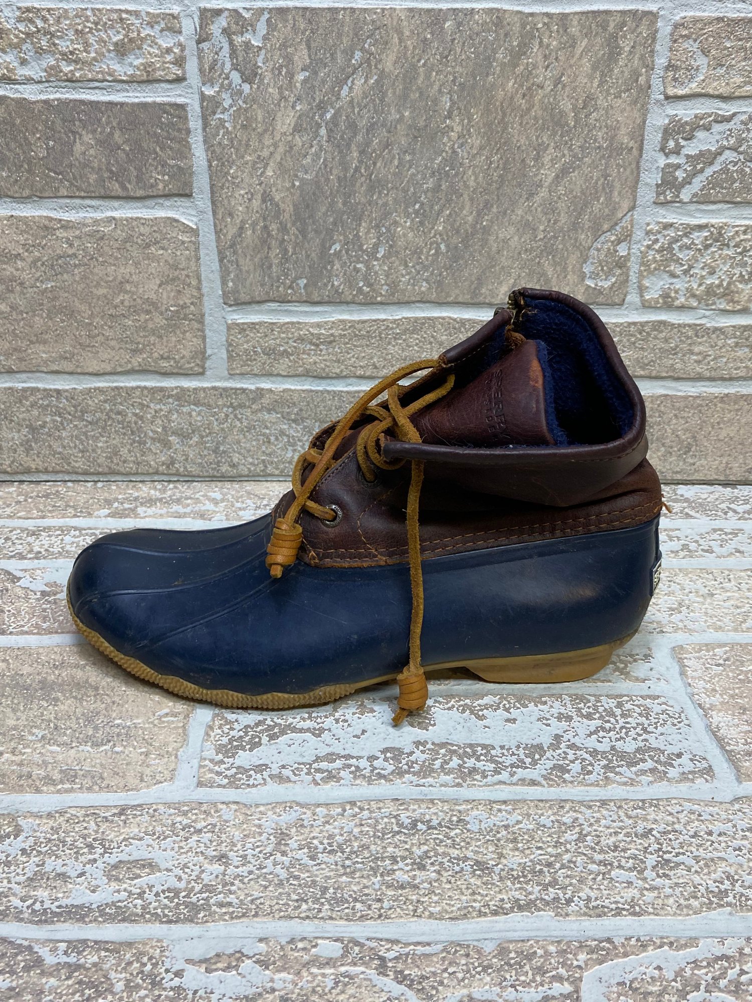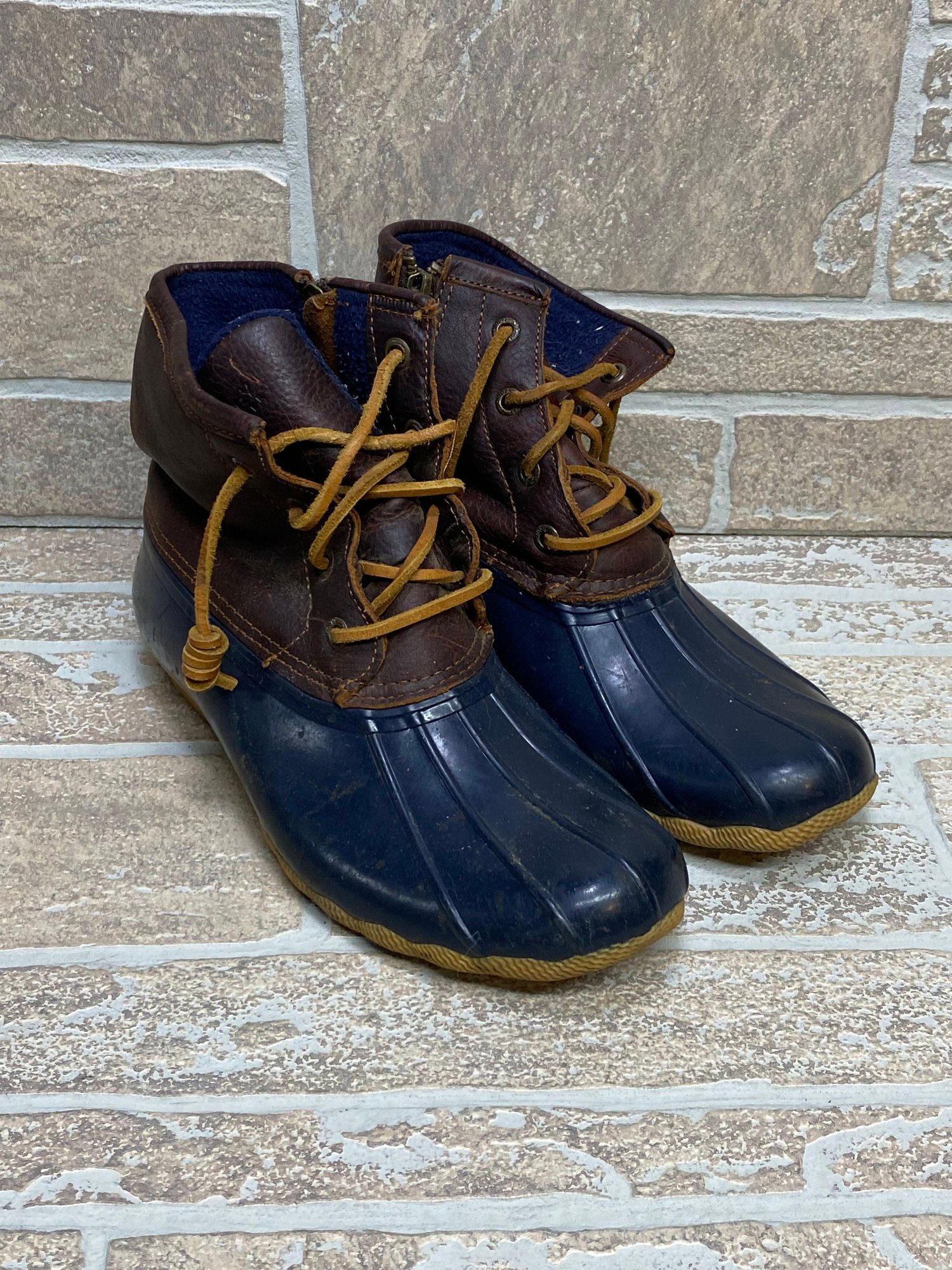 Classic pair of Sperry Top-Sider duck boots featuring a durable blue rubber lower and brown leather upper. Designed for wet weather with a waterproof rubber shell and warm interior lining.