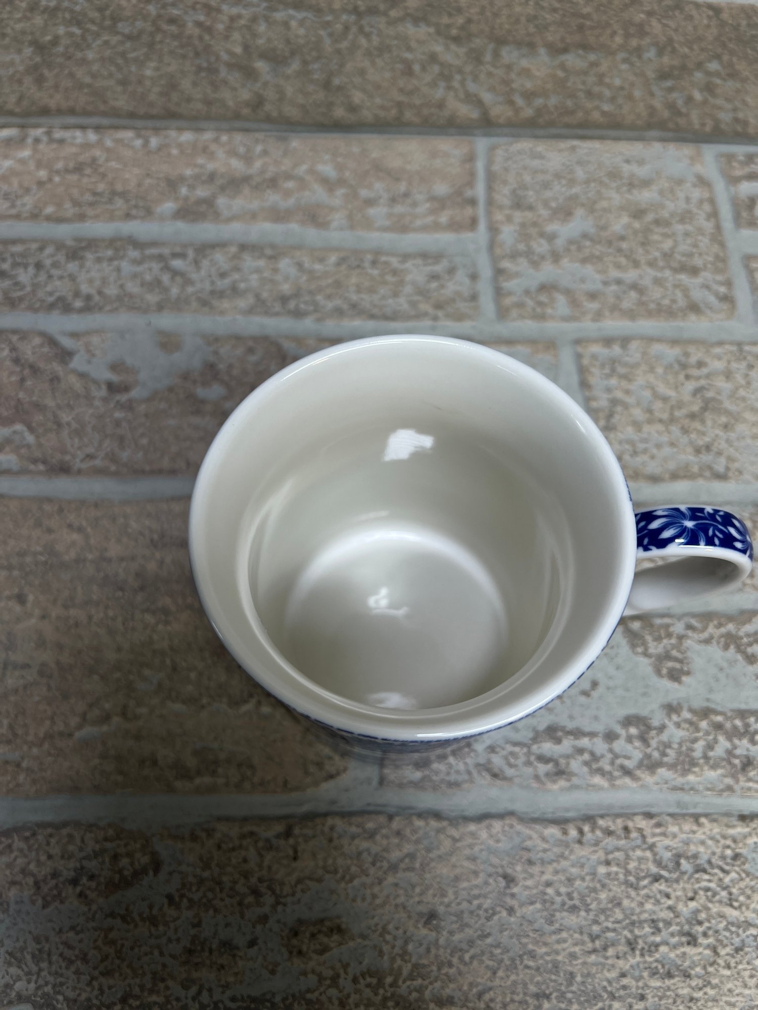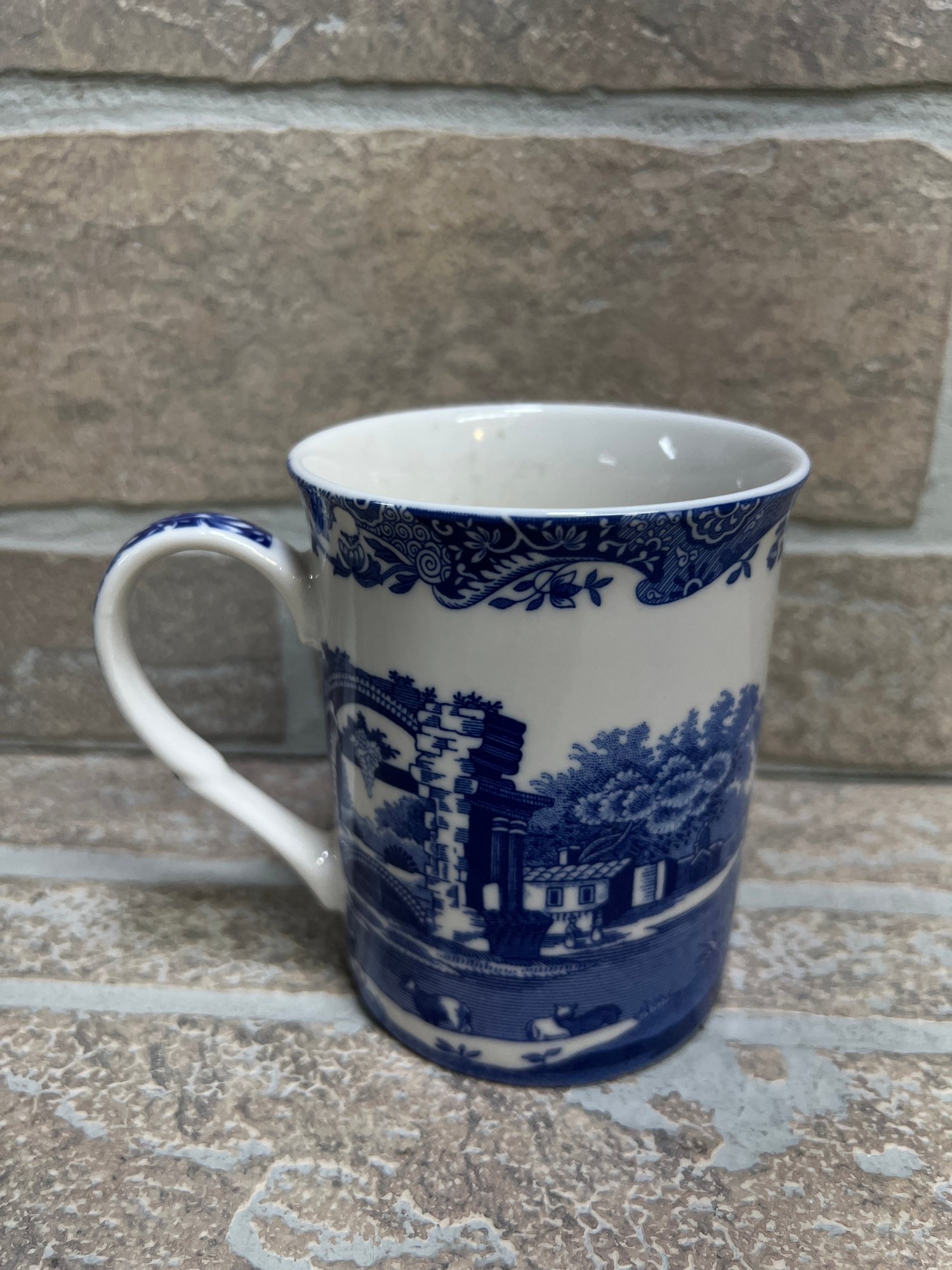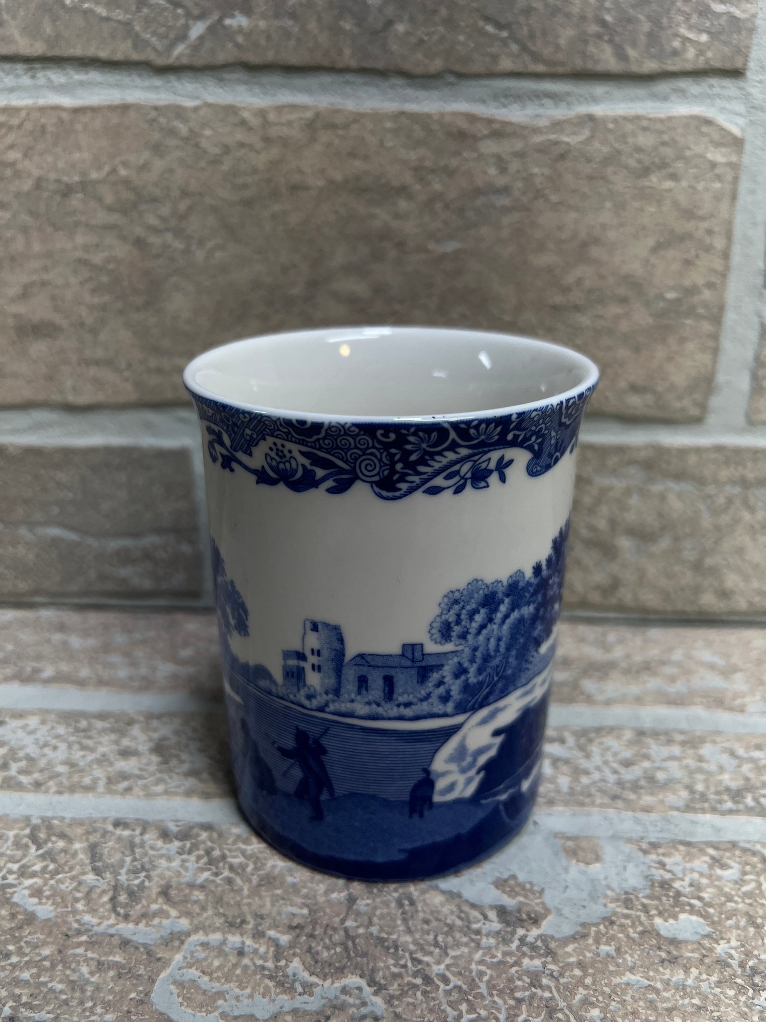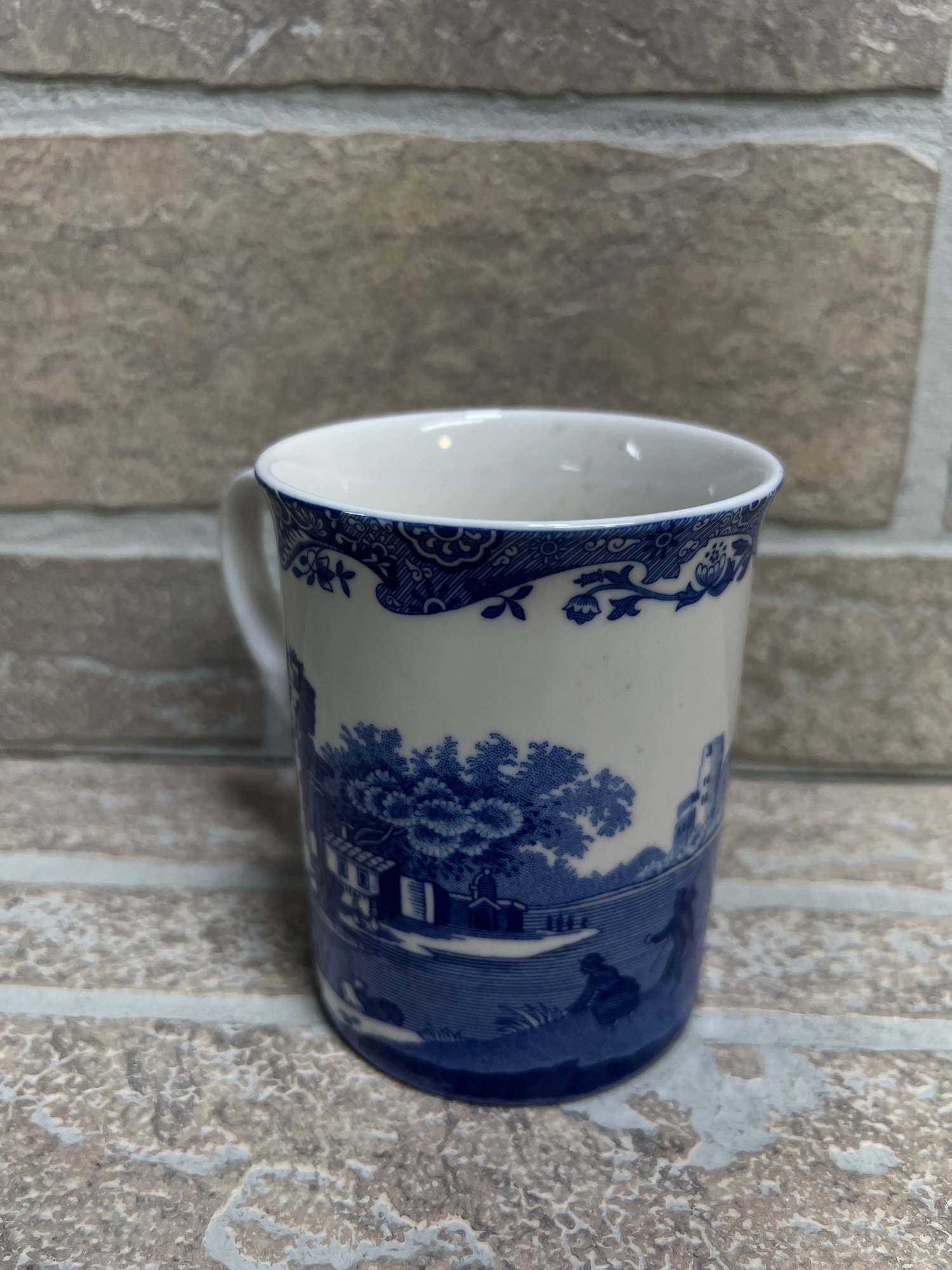 Classic Spode “Italian” pattern blue and white coffee mug featuring detailed scenic transferware design.