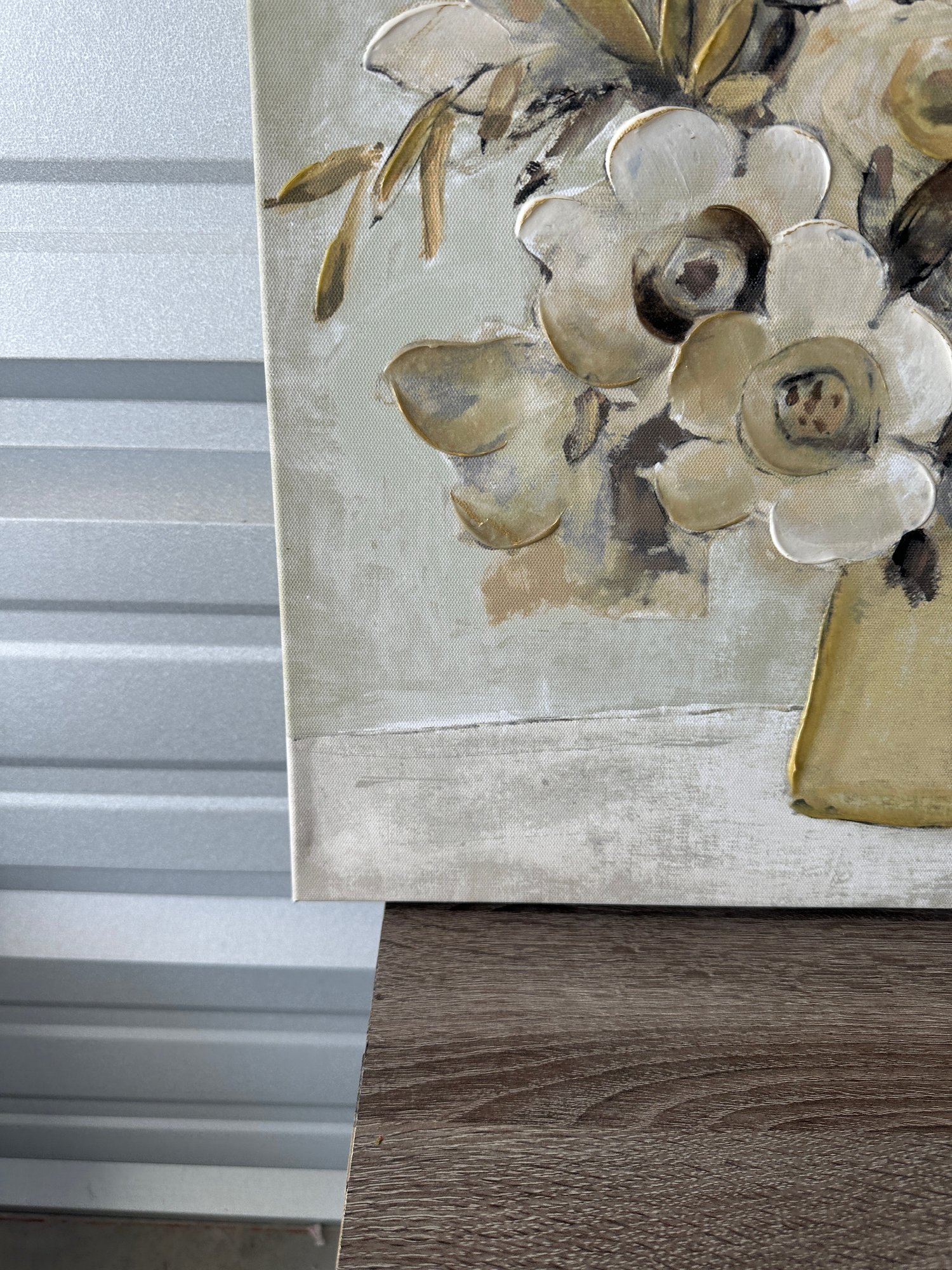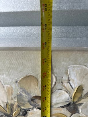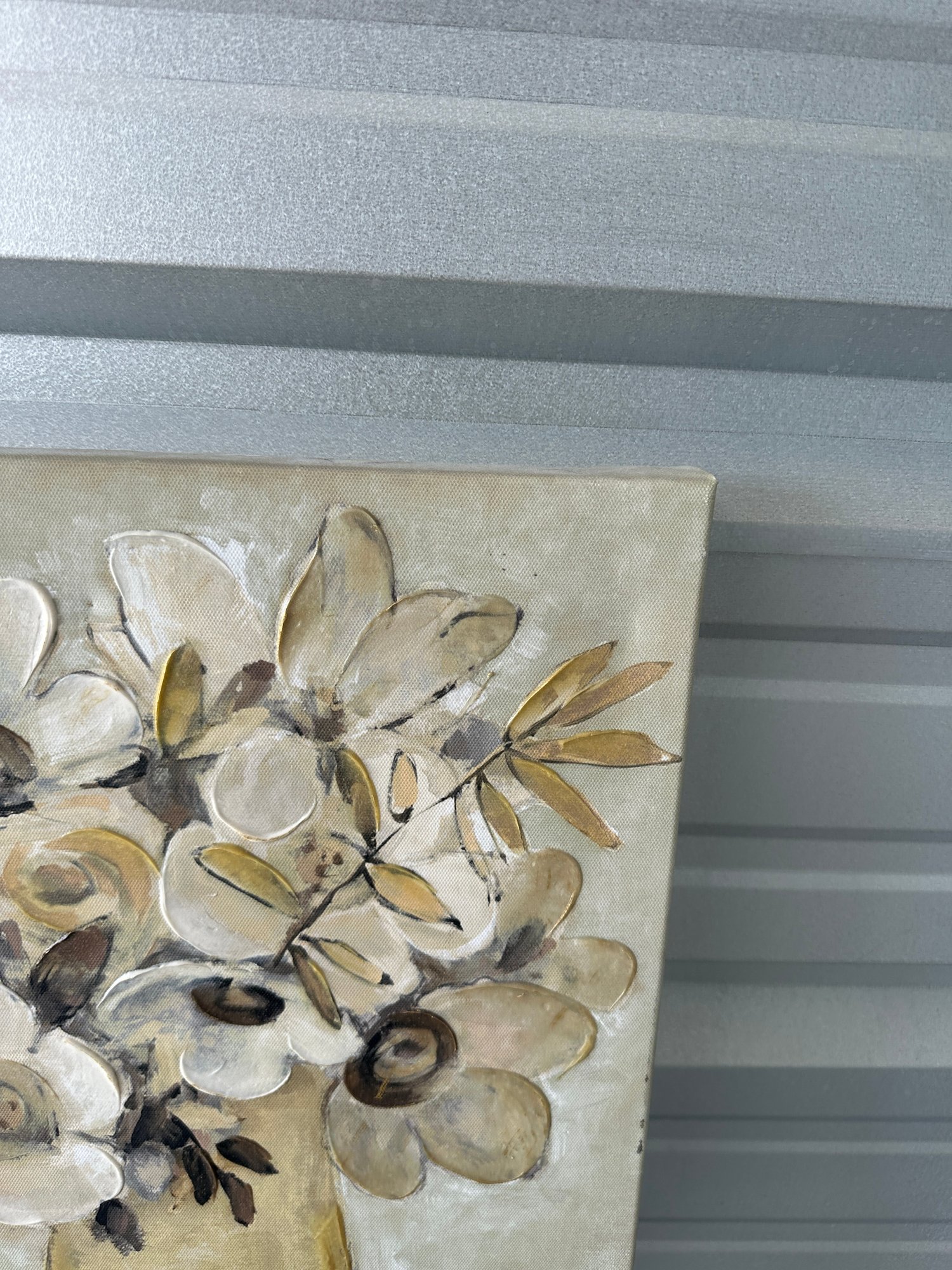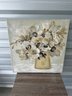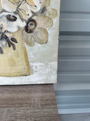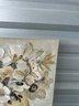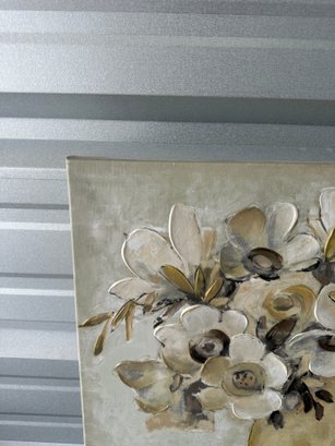Decorative floral canvas wall art featuring a neutral-toned bouquet in a vase. This piece has a soft, earthy color palette with cream, beige, taupe, and gold accents, along with subtle raised/textured elements that add depth and visual interest.