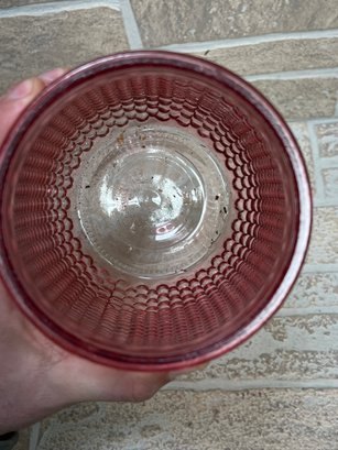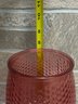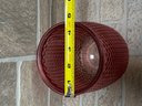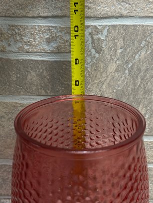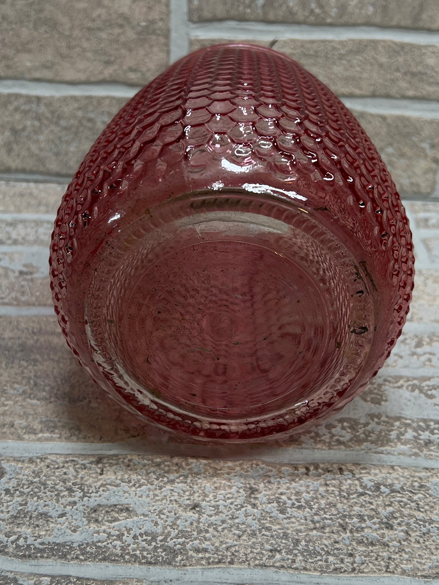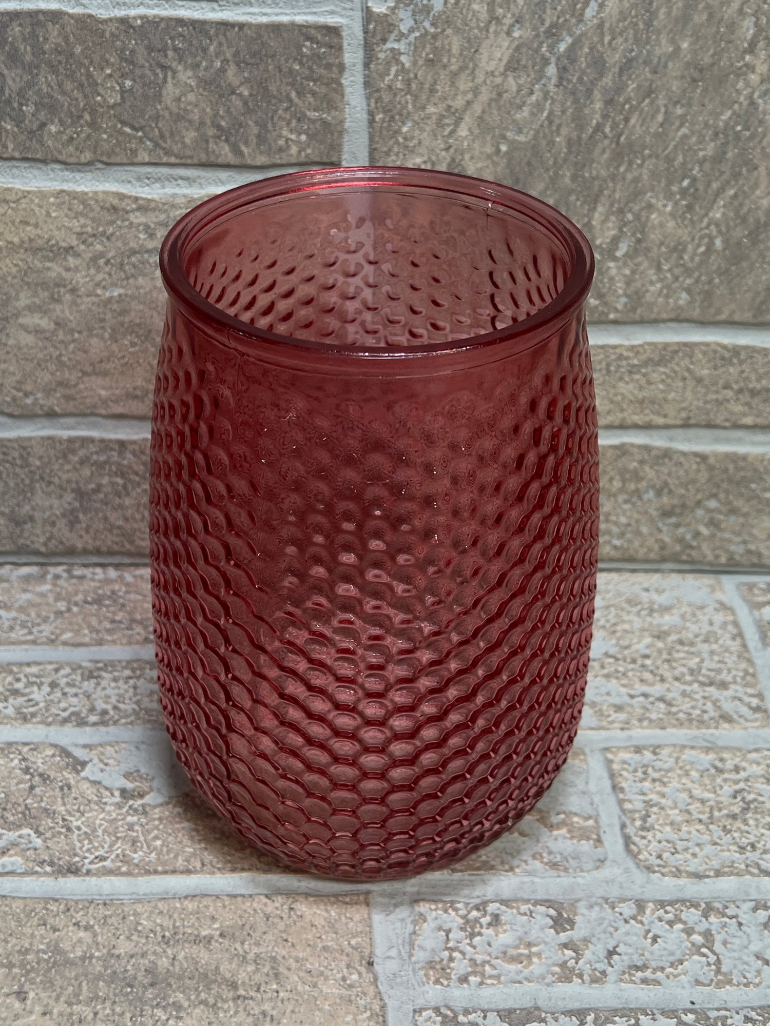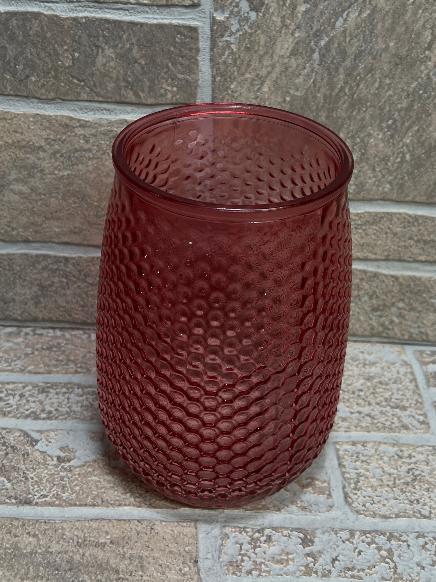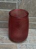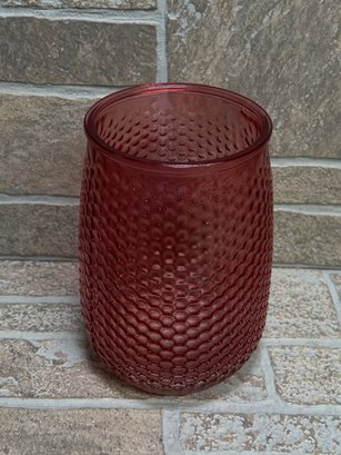 Stylish red glass vase or hurricane candle holder featuring a unique honeycomb / textured pattern throughout. The deep translucent red color gives it a warm, modern look that works great as a centerpiece or accent piece.