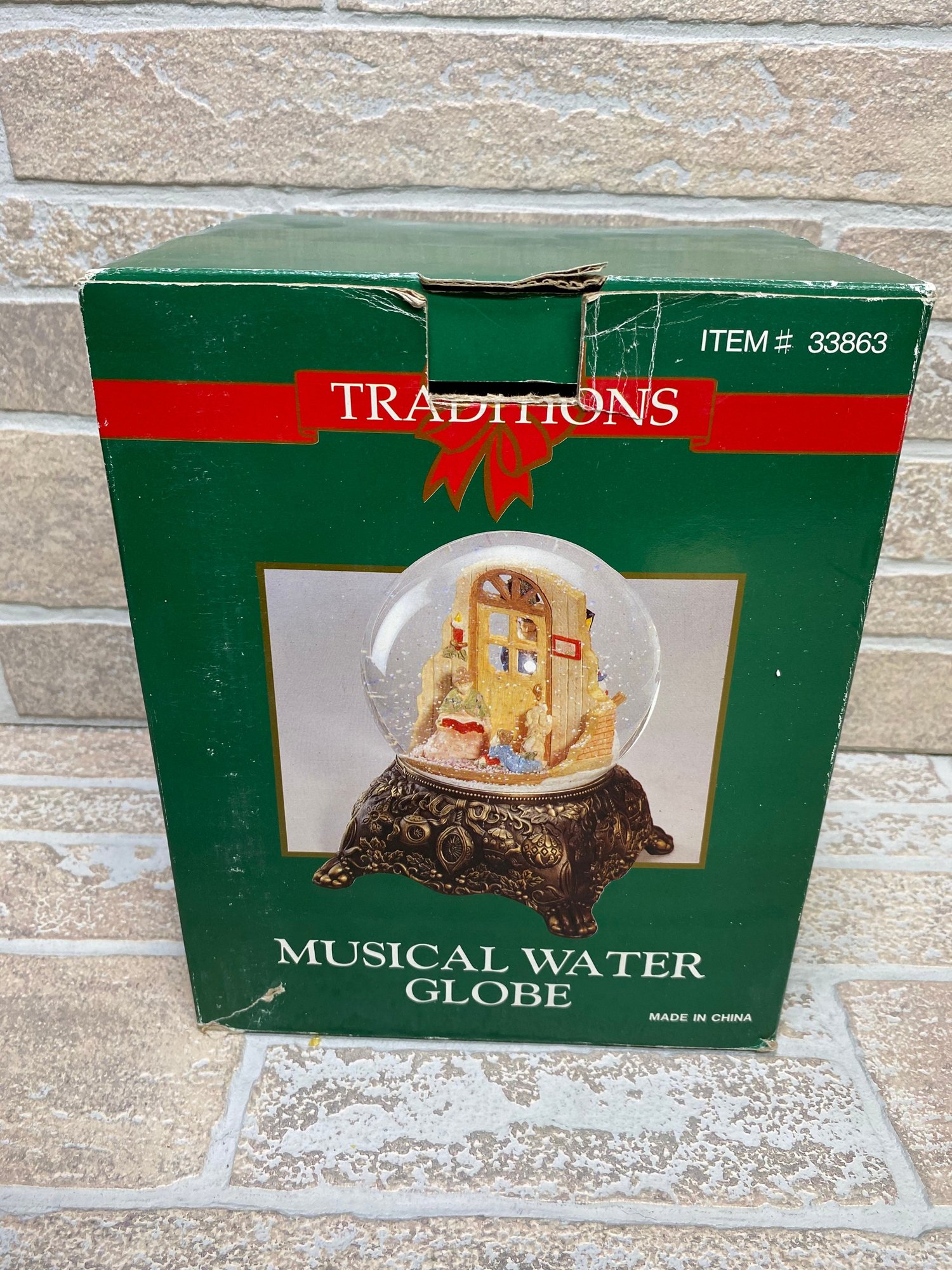 Beautiful Traditions Musical Water Globe featuring a detailed Christmas doorway scene with children, wreath, and festive winter accents inside a glass globe.