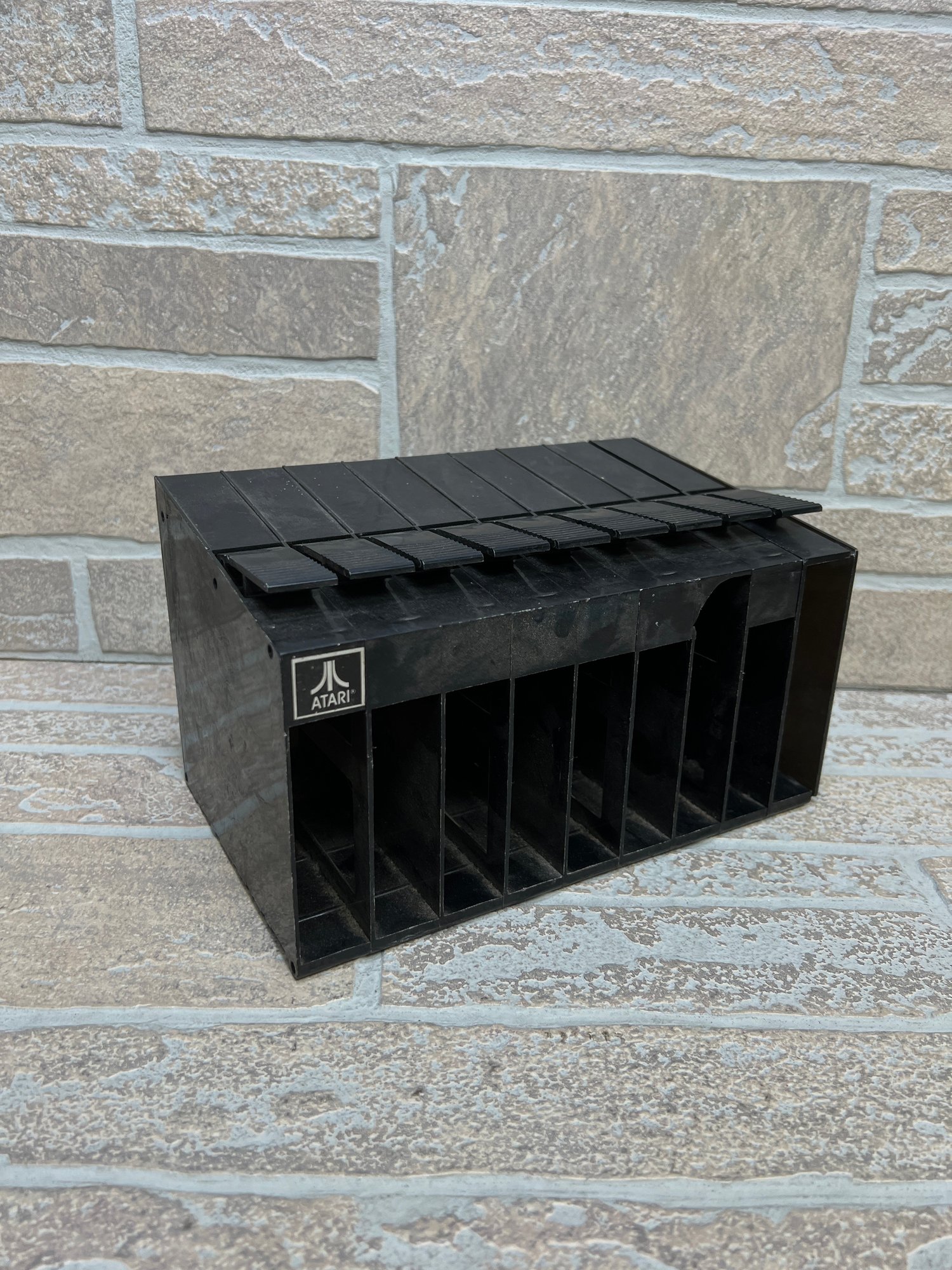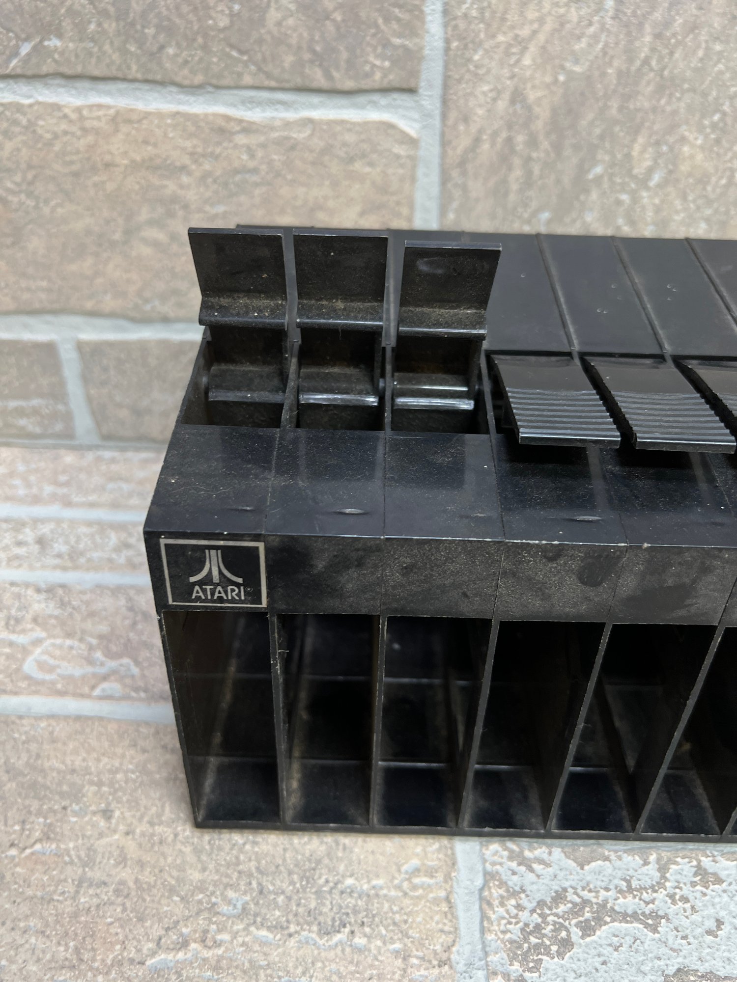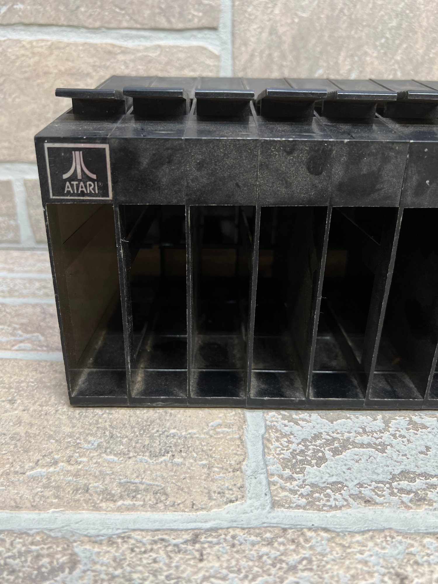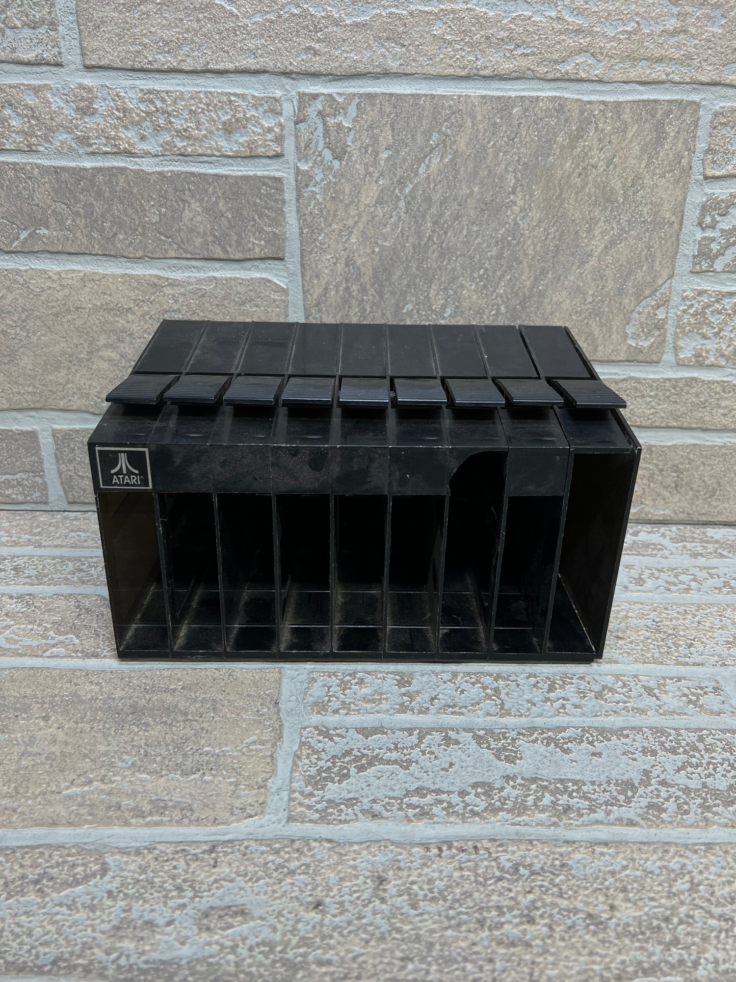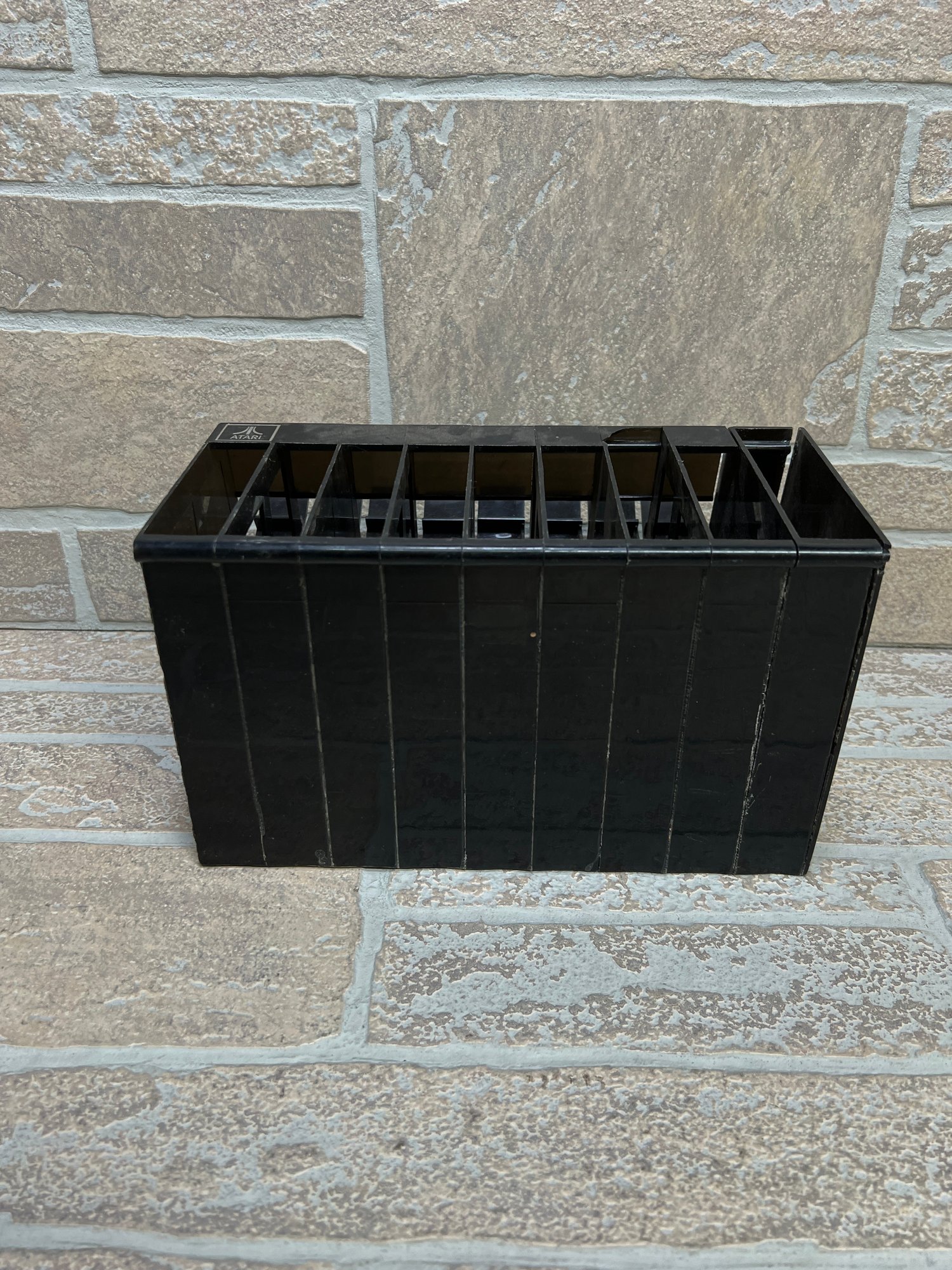 Vintage Atari cartridge storage rack in classic black plastic, designed to neatly organize and store multiple game cartridges.