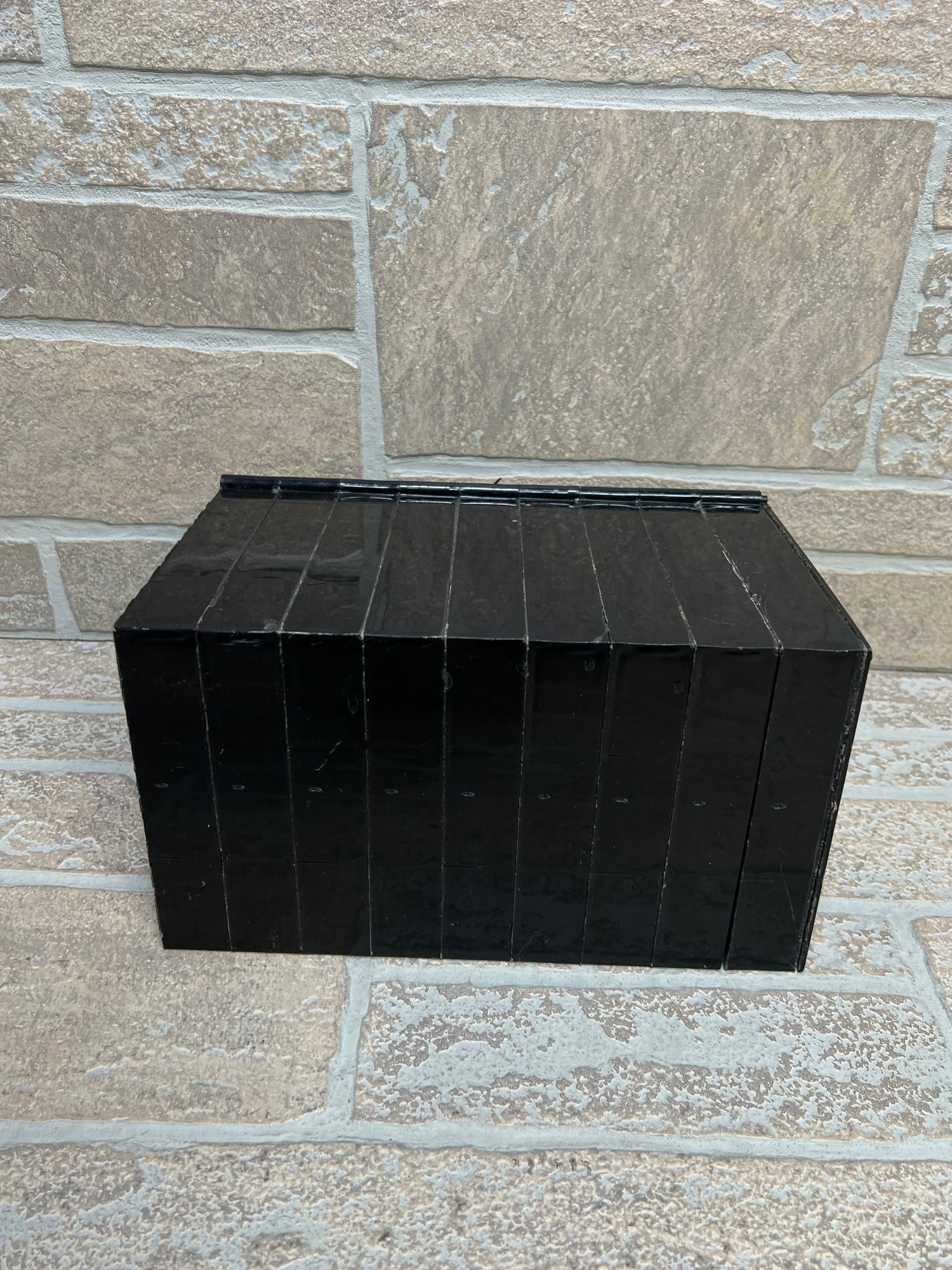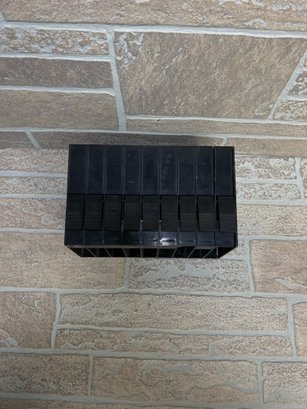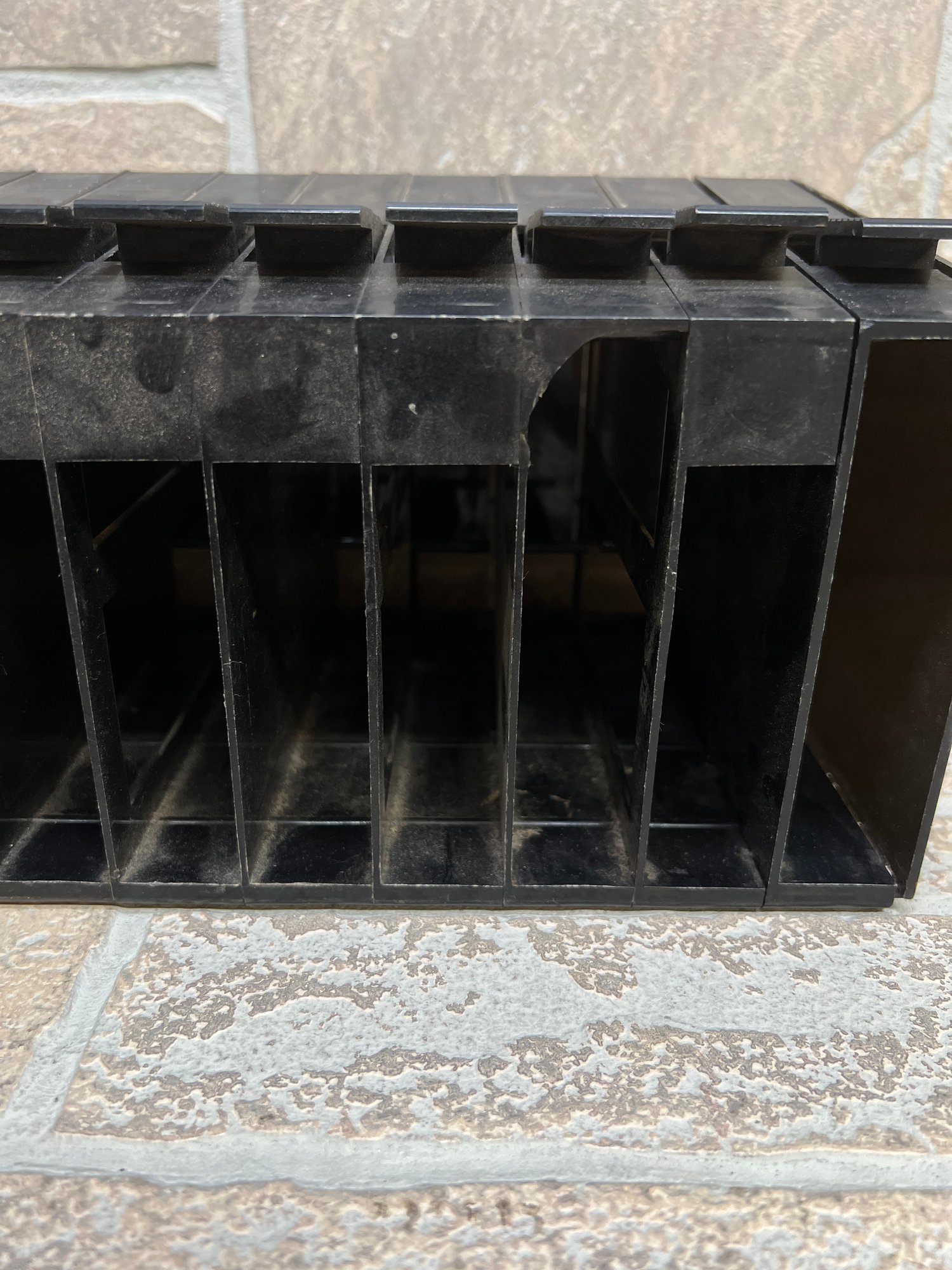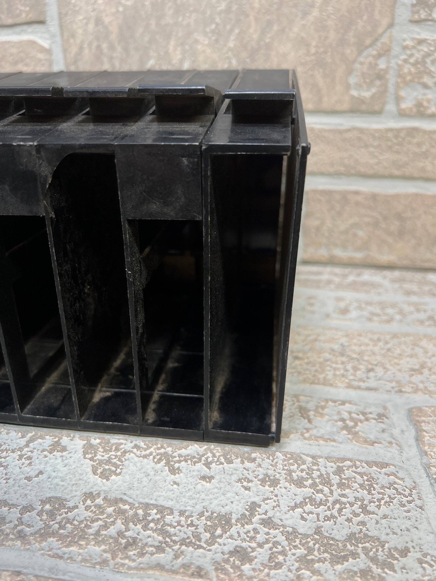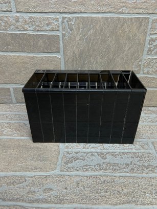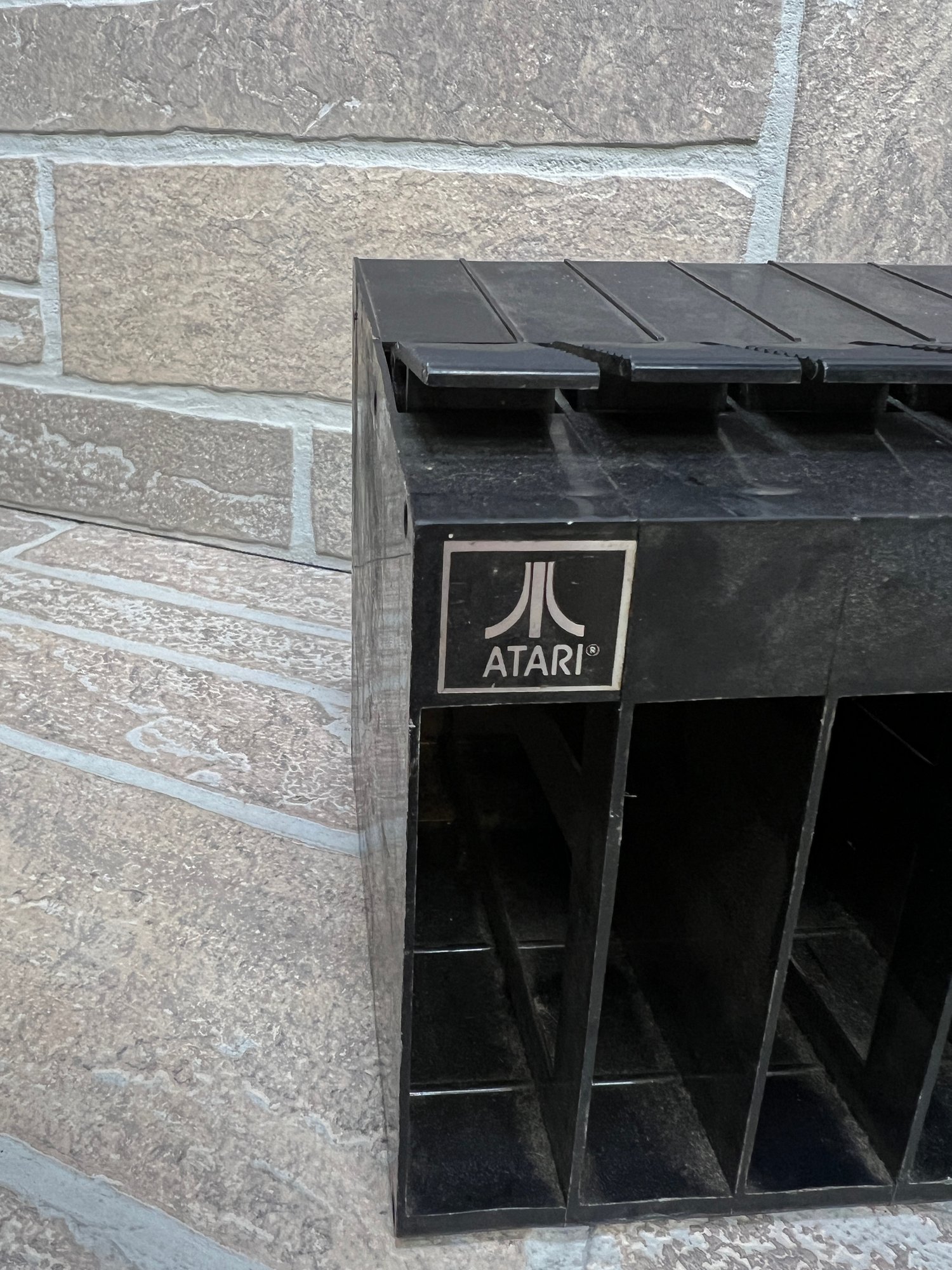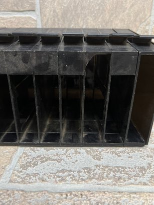 Vintage Atari cartridge storage rack in classic black plastic, designed to neatly organize and store multiple game cartridges.