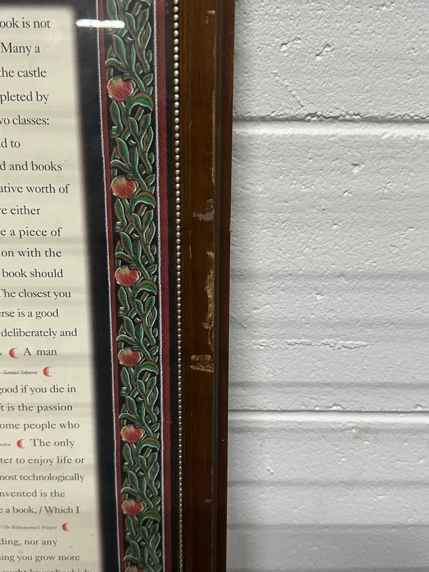 This tall, narrow piece has a decorative border with fruit and vine motifs and comes in a wood frame with beaded inner trim, making it perfect for libraries, reading nooks, offices, or classrooms.
