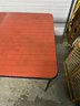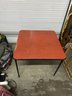 Vintage folding card table featuring a woodgrain laminate top and black metal folding legs. Great for extra seating, game nights, crafts, or utility use.