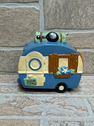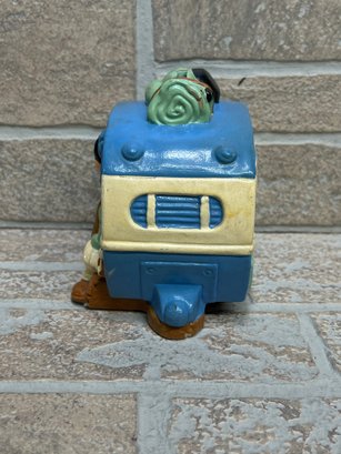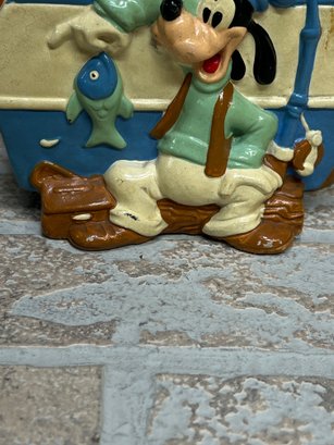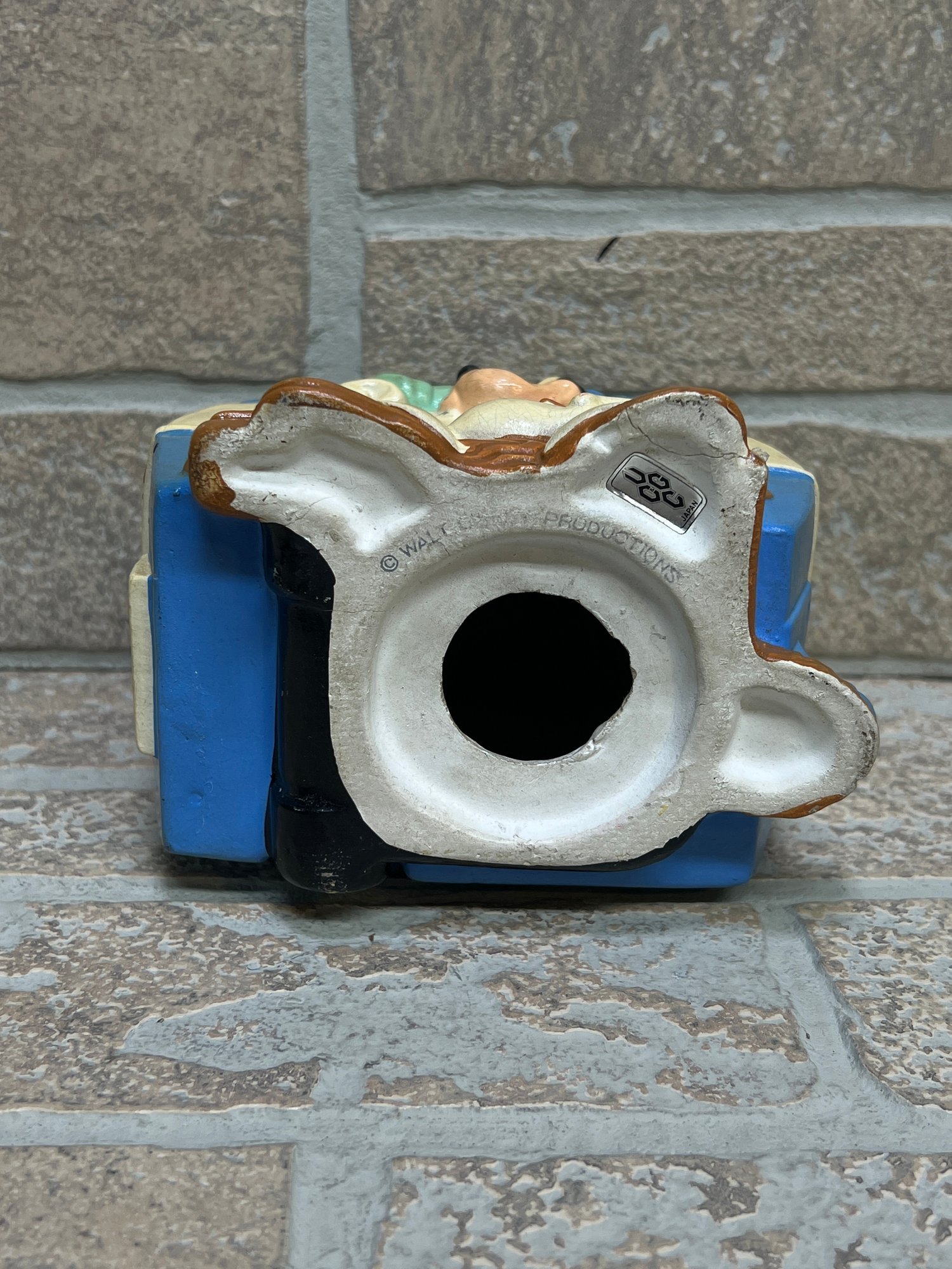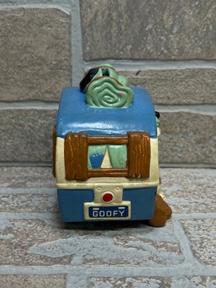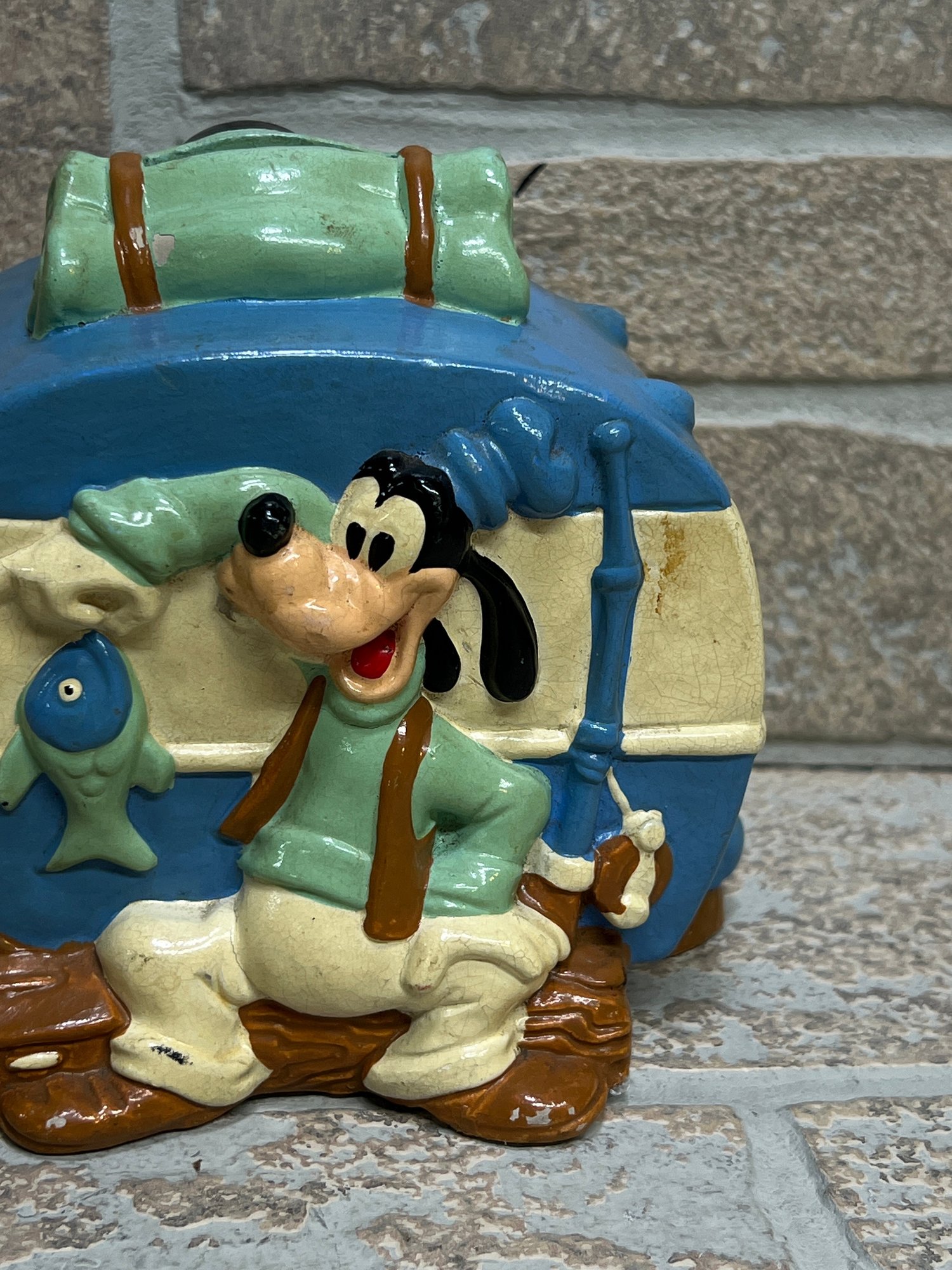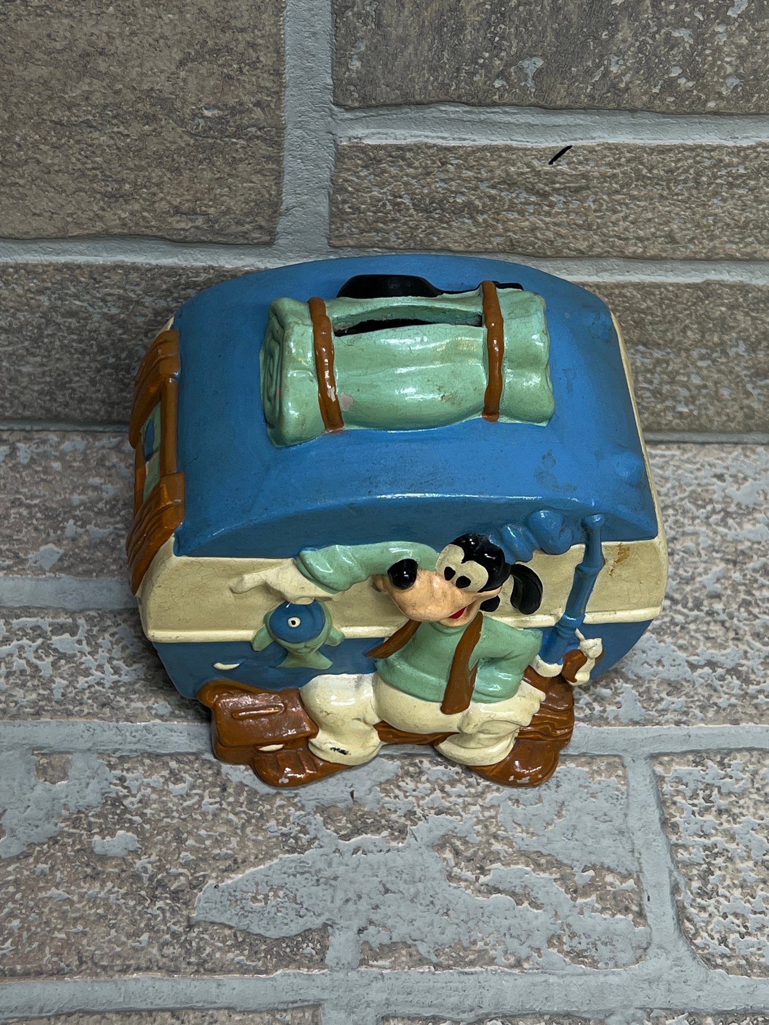 Vintage Goofy ceramic piggy bank featuring Goofy leaning against a retro-style camper trailer. Bright, detailed design makes this a fun and collectible Disney piece.