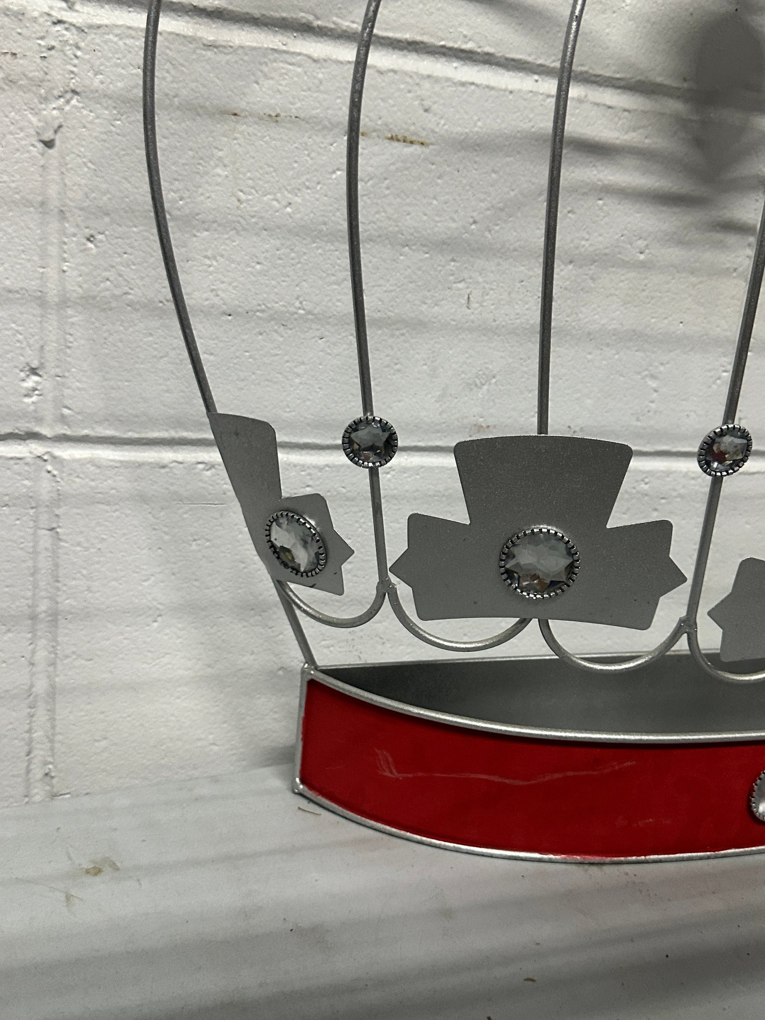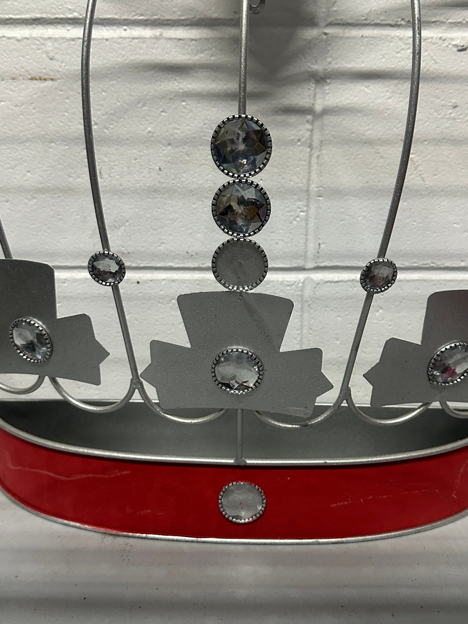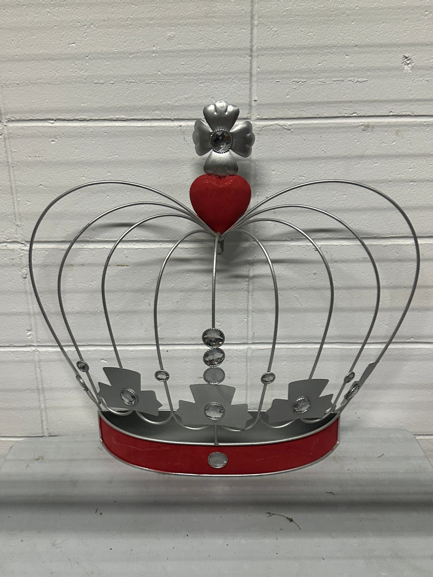 Unique vintage metal crown-shaped wall shelf / display rack featuring a whimsical royal design with faux gem accents and a red enamel-style base. This decorative piece adds a bold statement to any room and can be used as a small display shelf, wall décor, or themed accent piece.