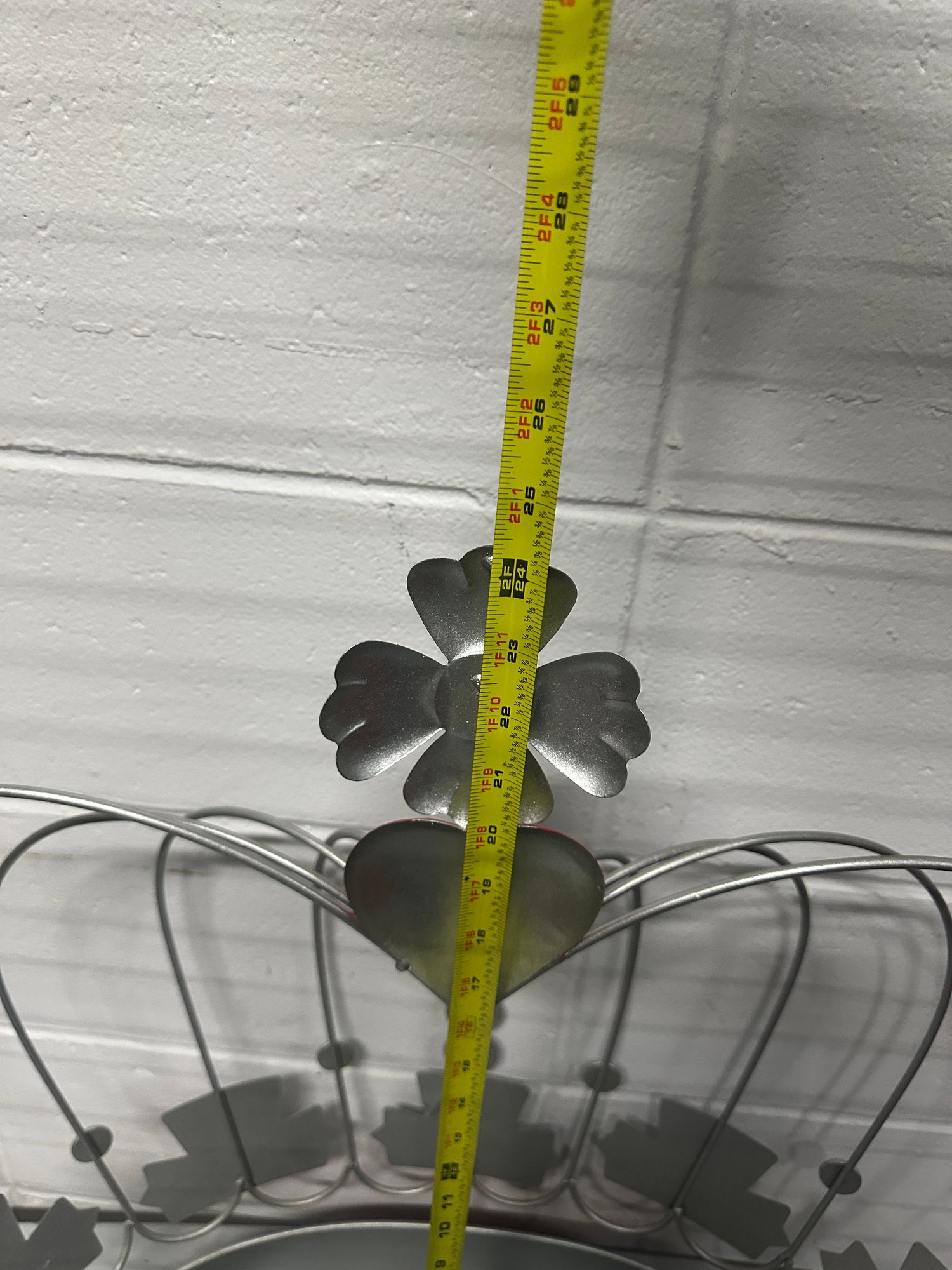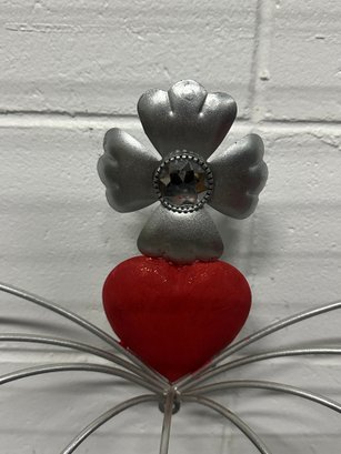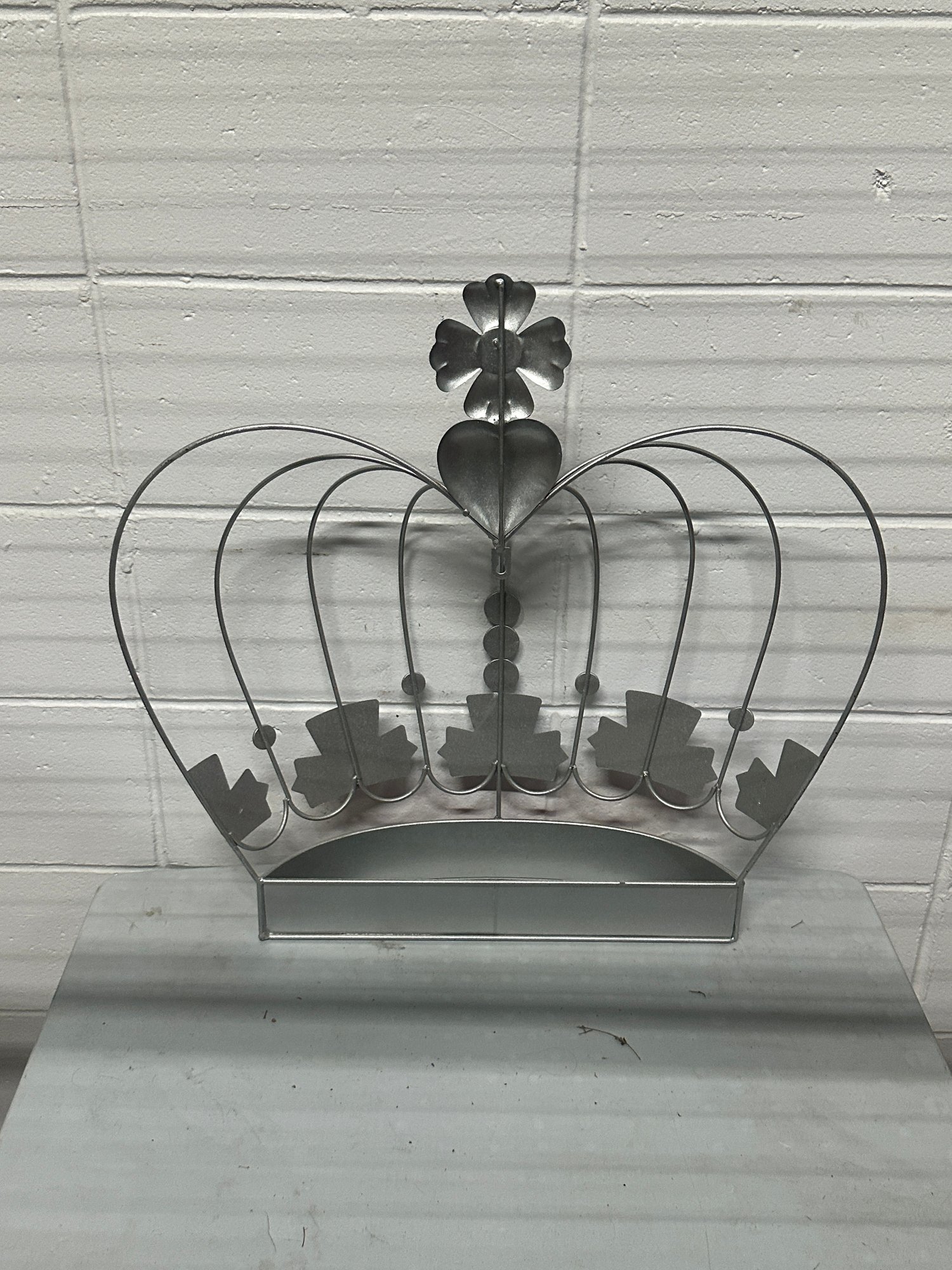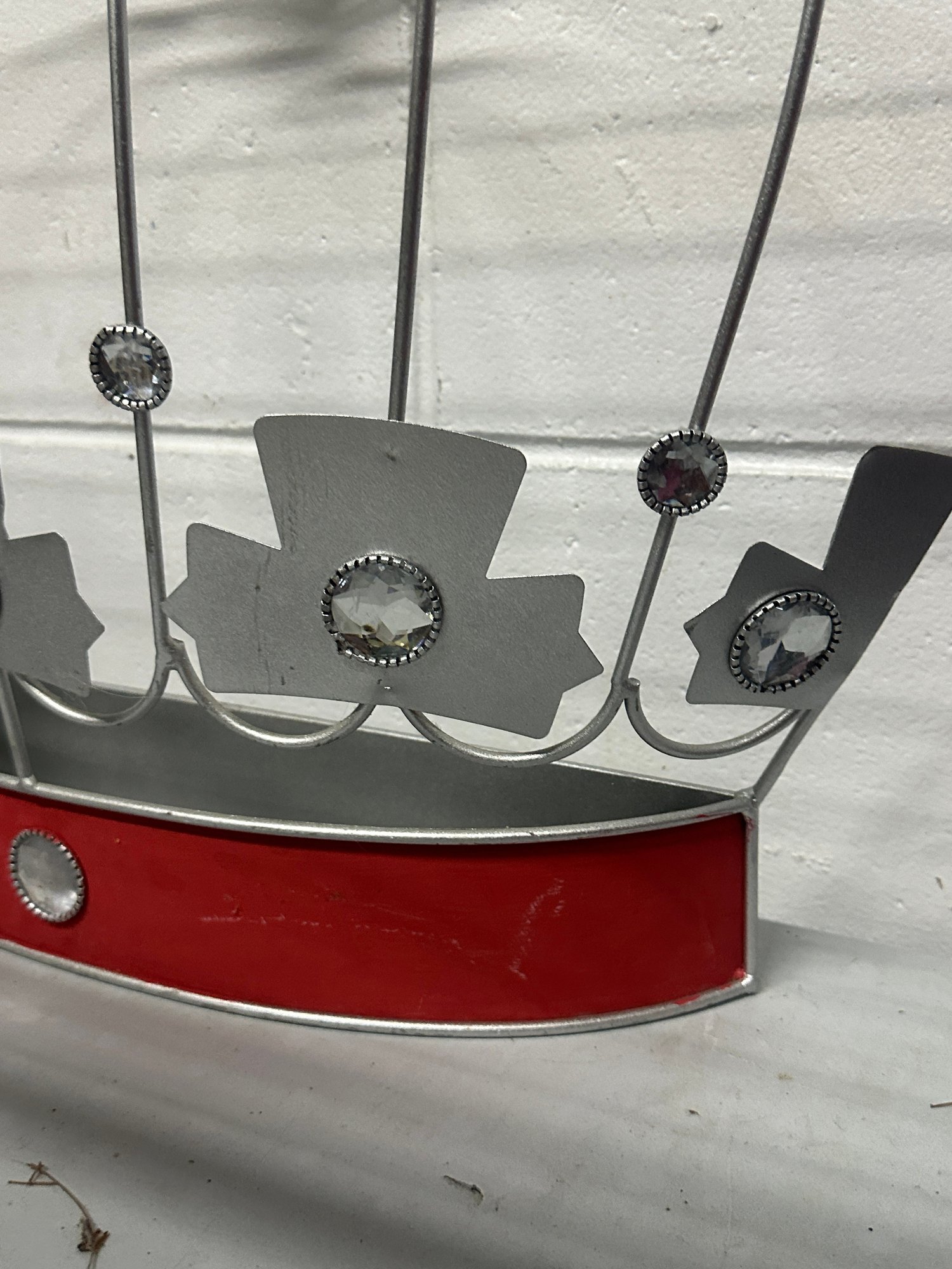 Unique vintage metal crown-shaped wall shelf / display rack featuring a whimsical royal design with faux gem accents and a red enamel-style base. This decorative piece adds a bold statement to any room and can be used as a small display shelf, wall décor, or themed accent piece.