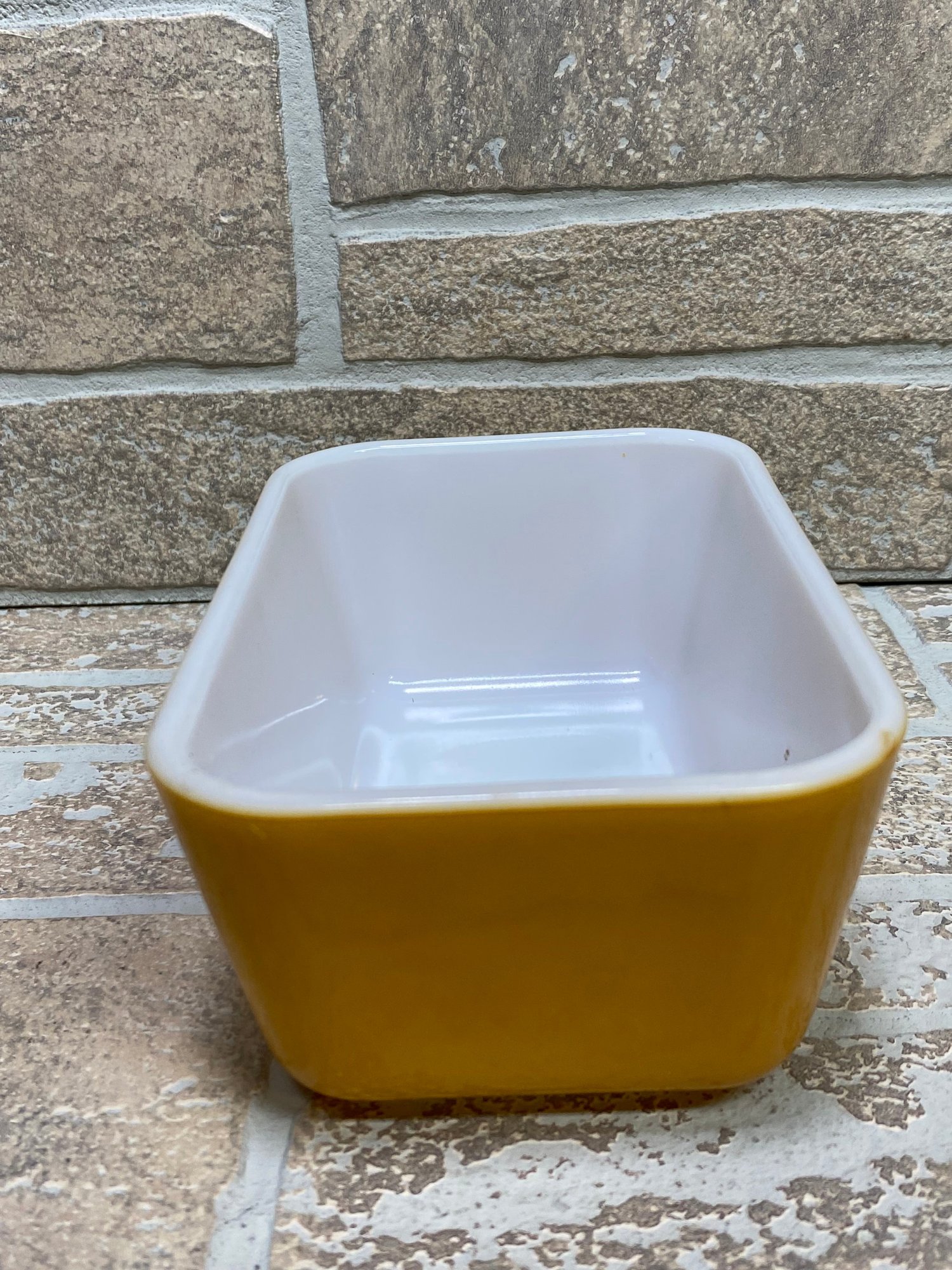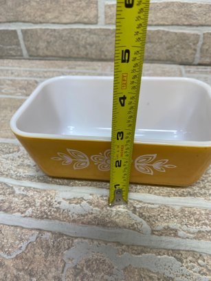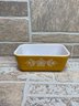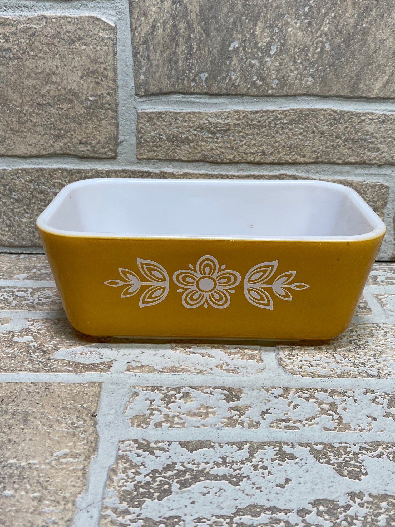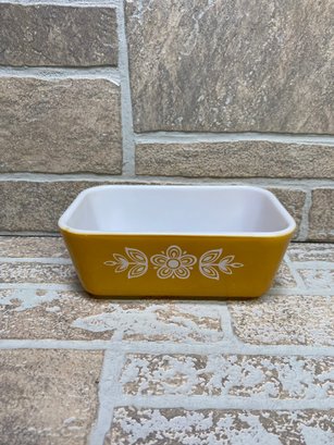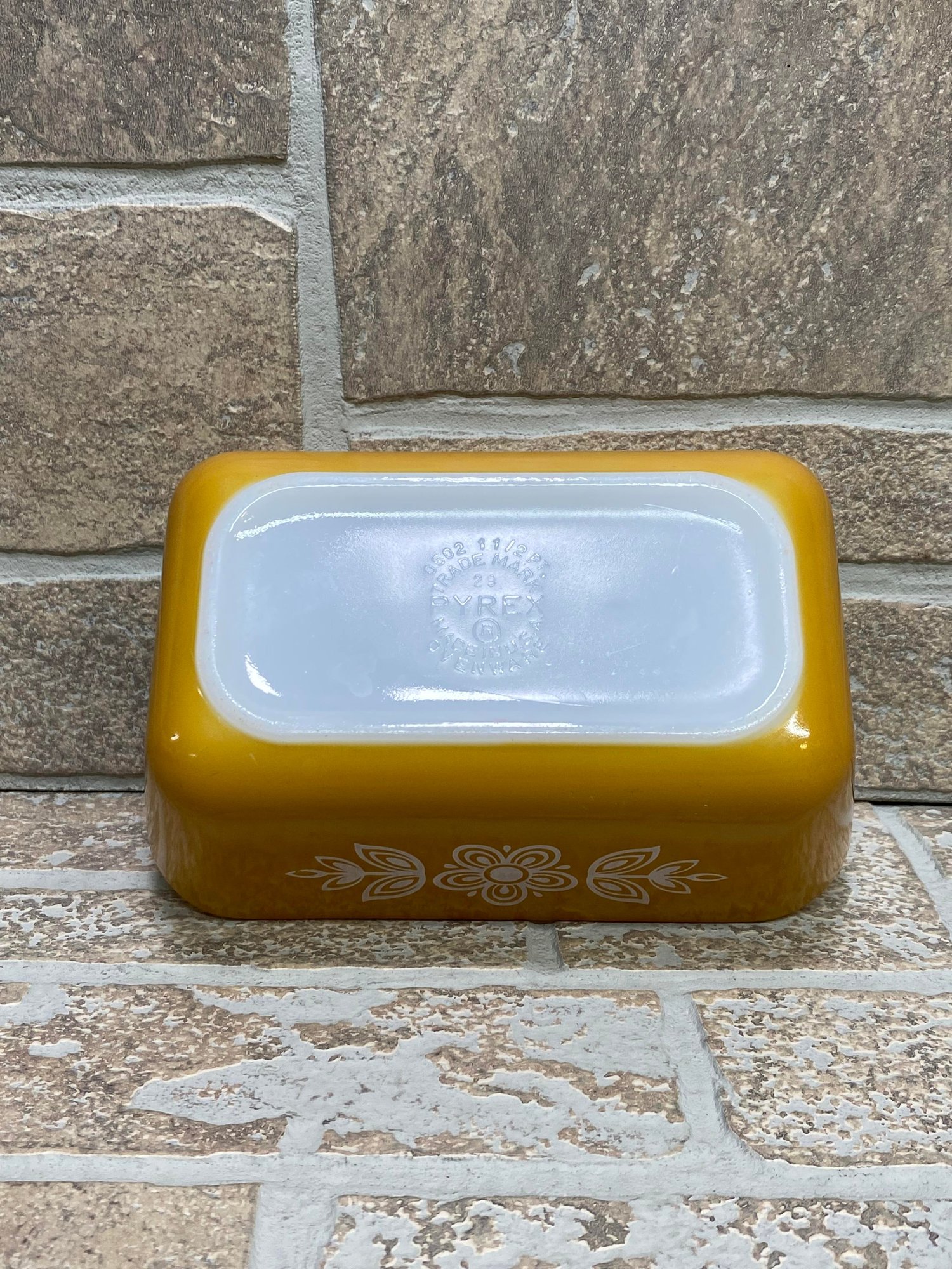 Classic vintage Pyrex refrigerator dish in the popular Butterfly Gold pattern, featuring a mustard yellow exterior with white floral design and white interior.