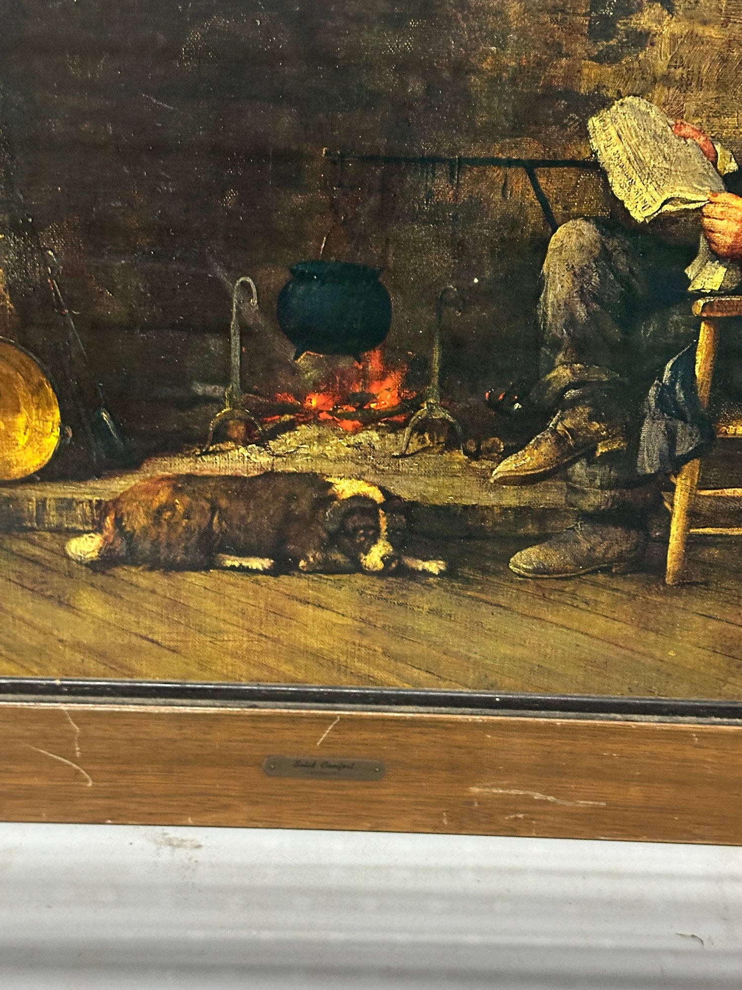 Vintage framed print titled “Solid Comfort” by Lippincott, featuring a warm fireside interior scene of a man reading by the hearth with a dog resting nearby.