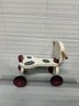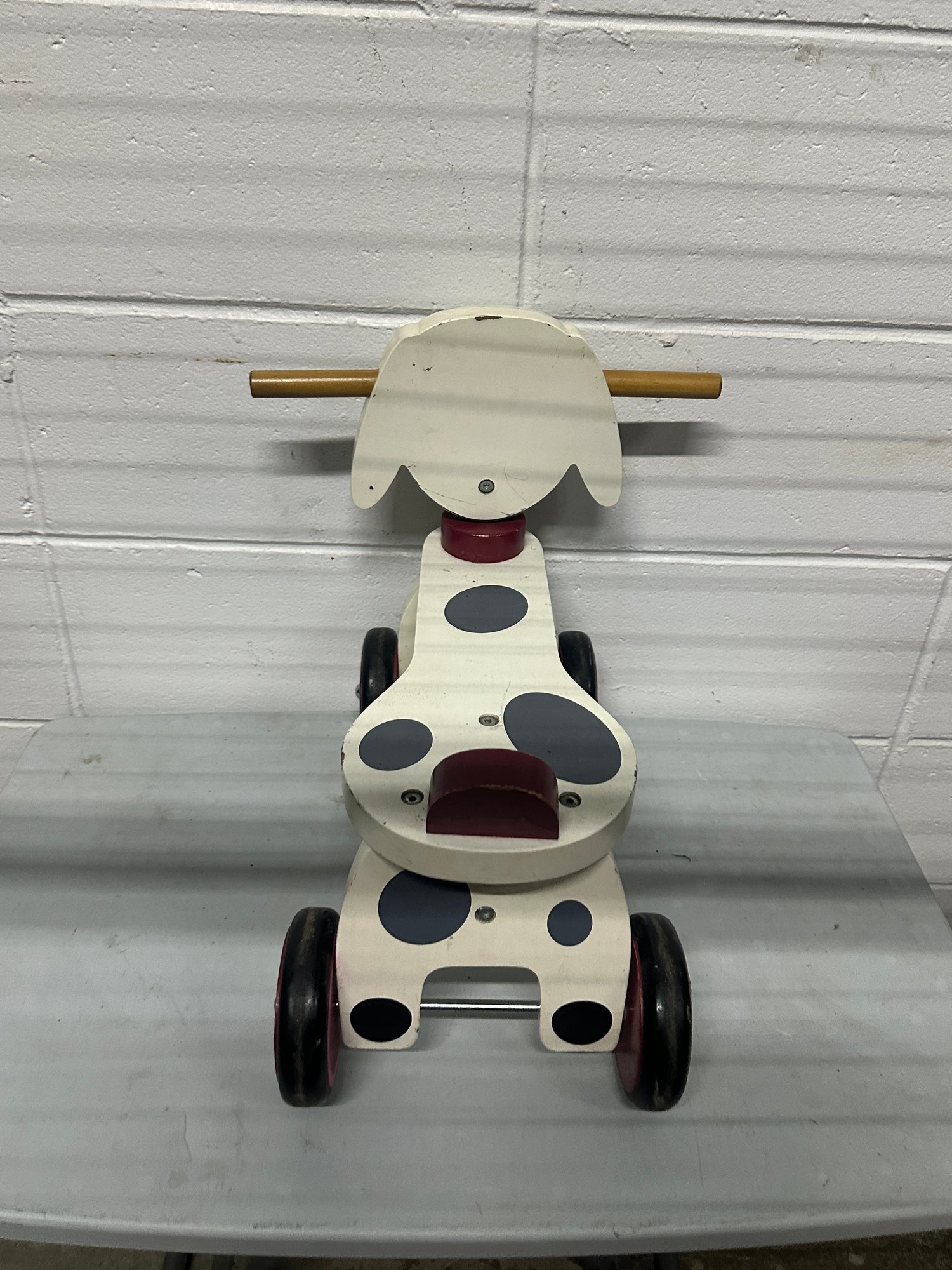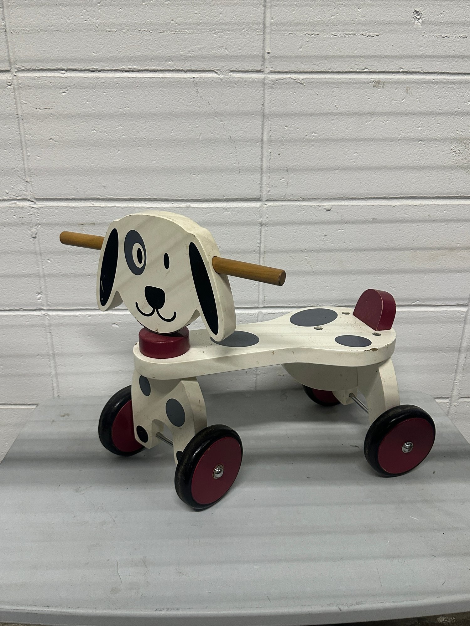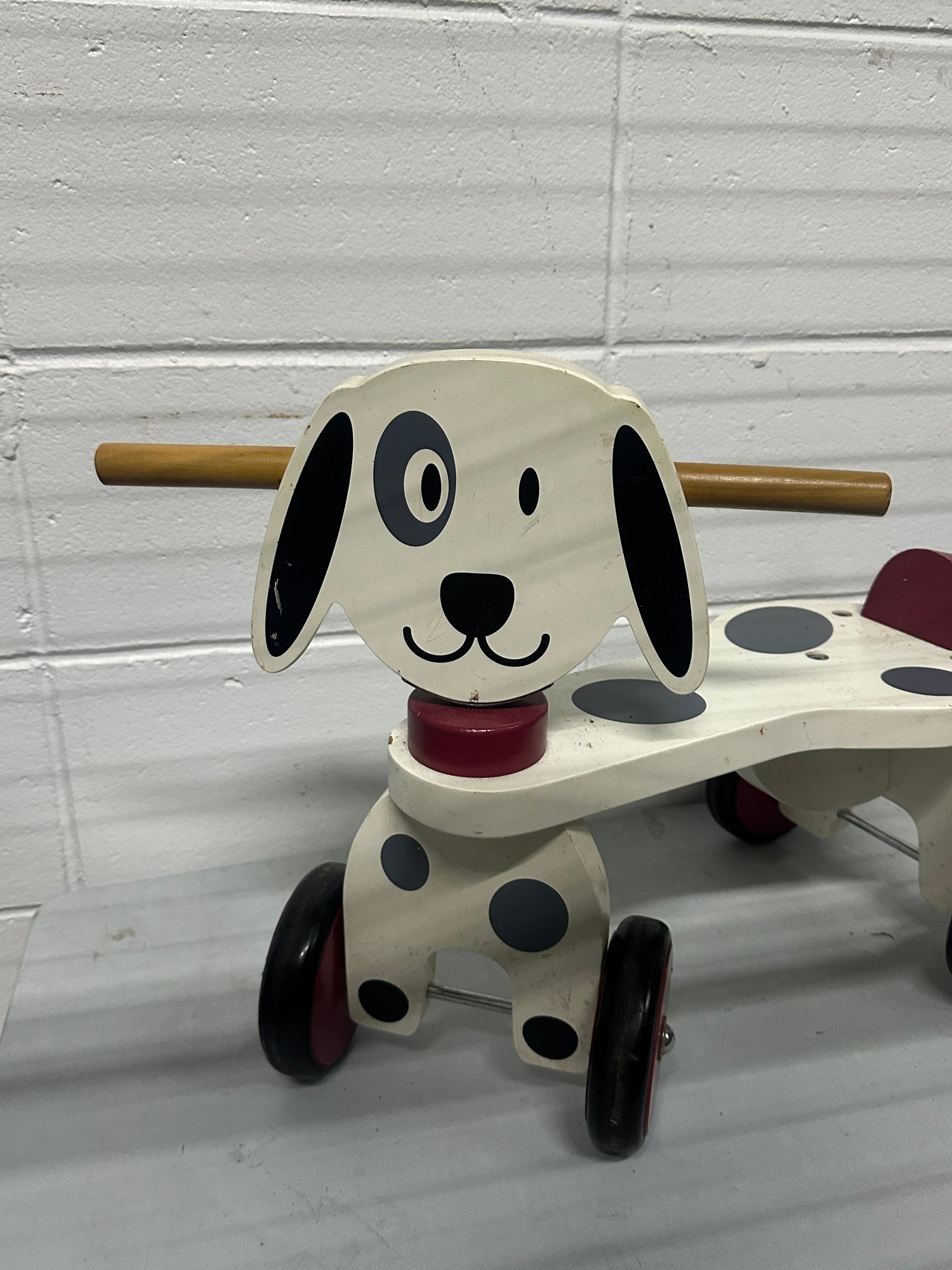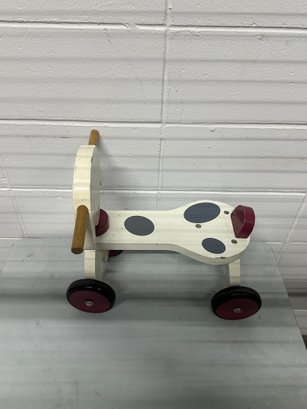 Adorable wooden dog-themed ride-on toy featuring a playful puppy design with rolling wheels and handlebar grips.