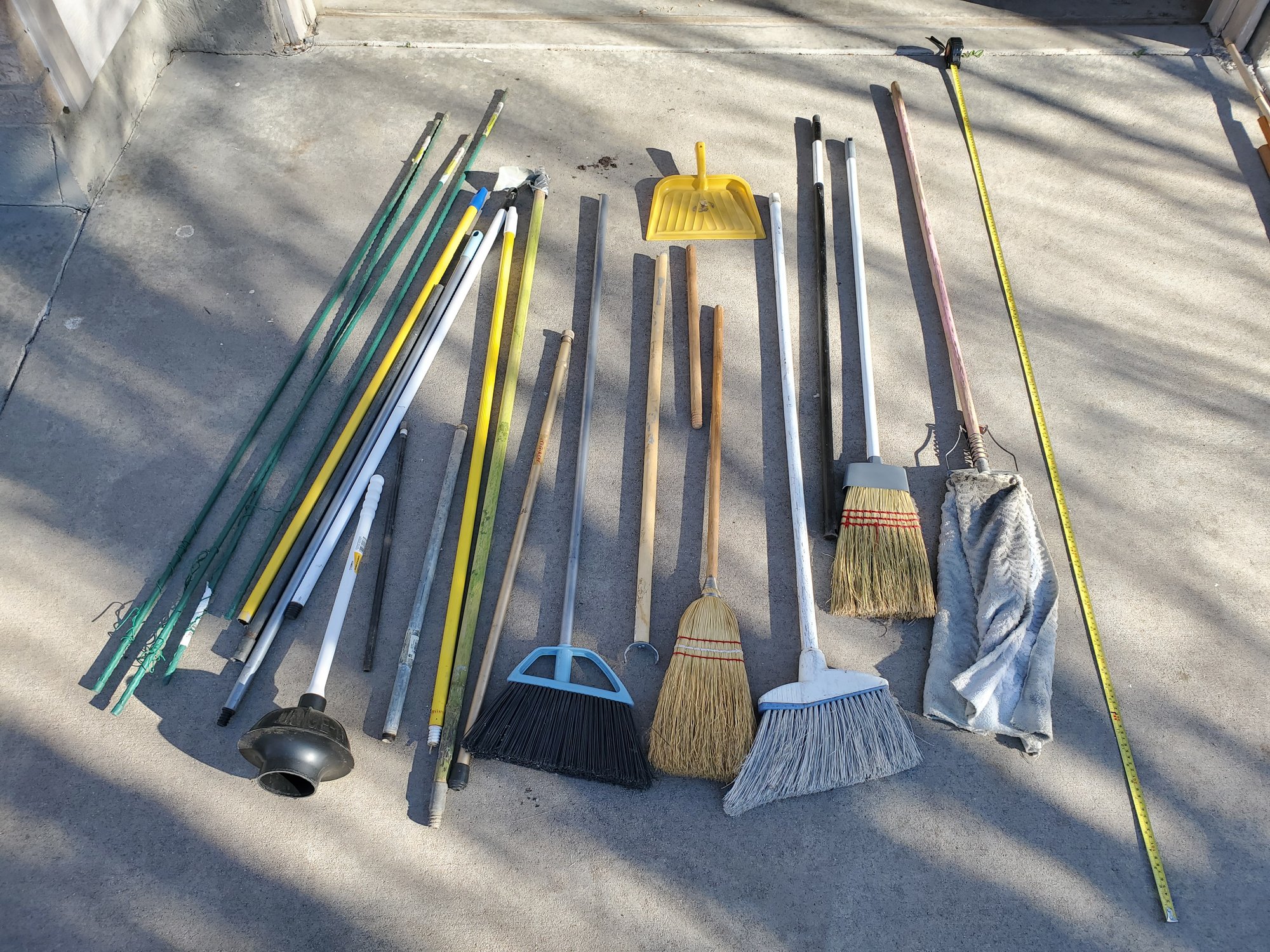 Lot Of Brooms, Dustpans, And Handles