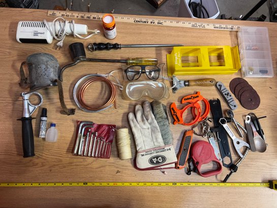 Lot Of Various Tools, Goggles, Gloves, Allen Wrenchs, Box Cutter Etc.