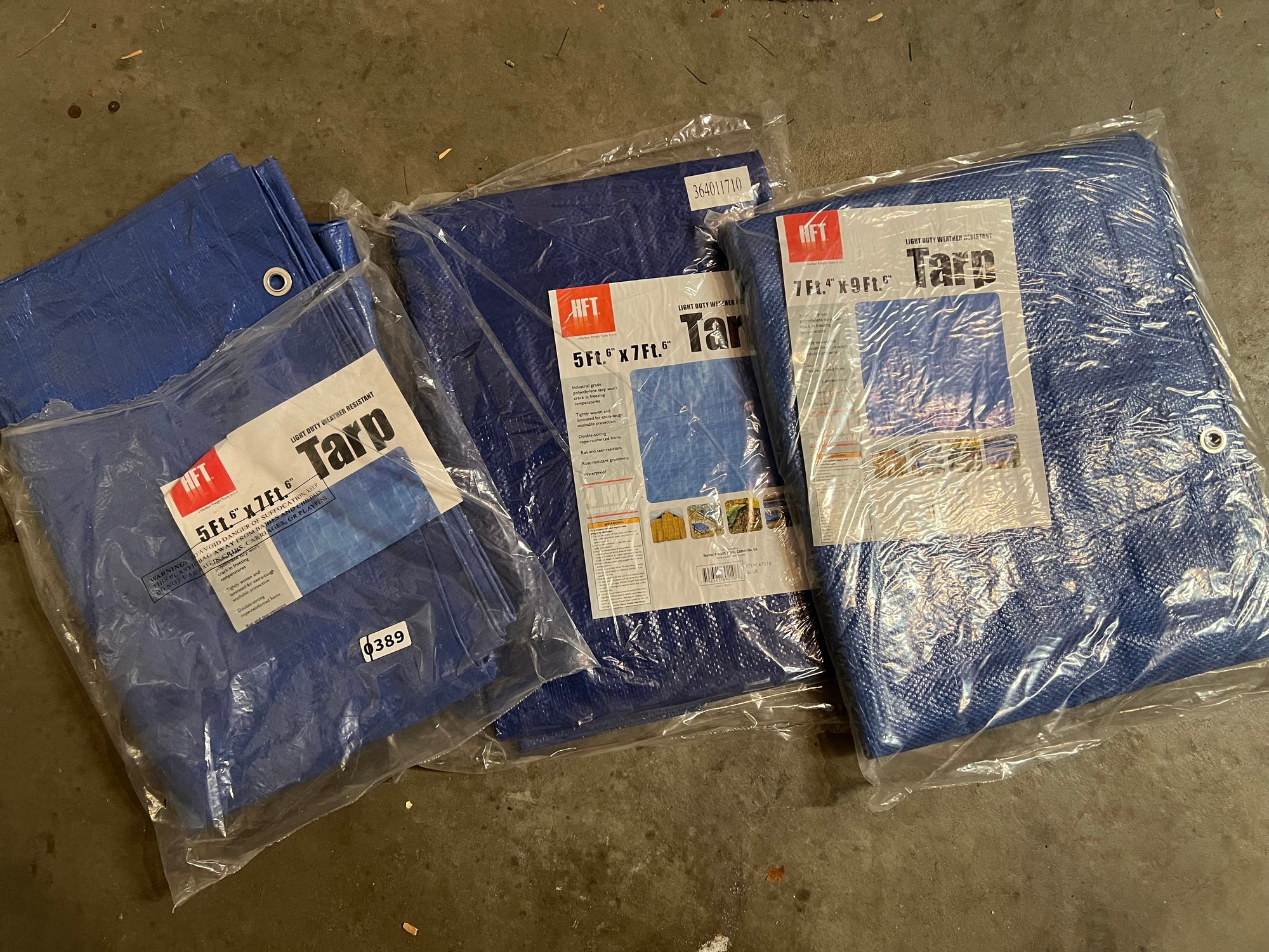 2 of the 3 tarps are brand new. One of the 5 foot tarps has been opened but it doesn't look like it's been used.