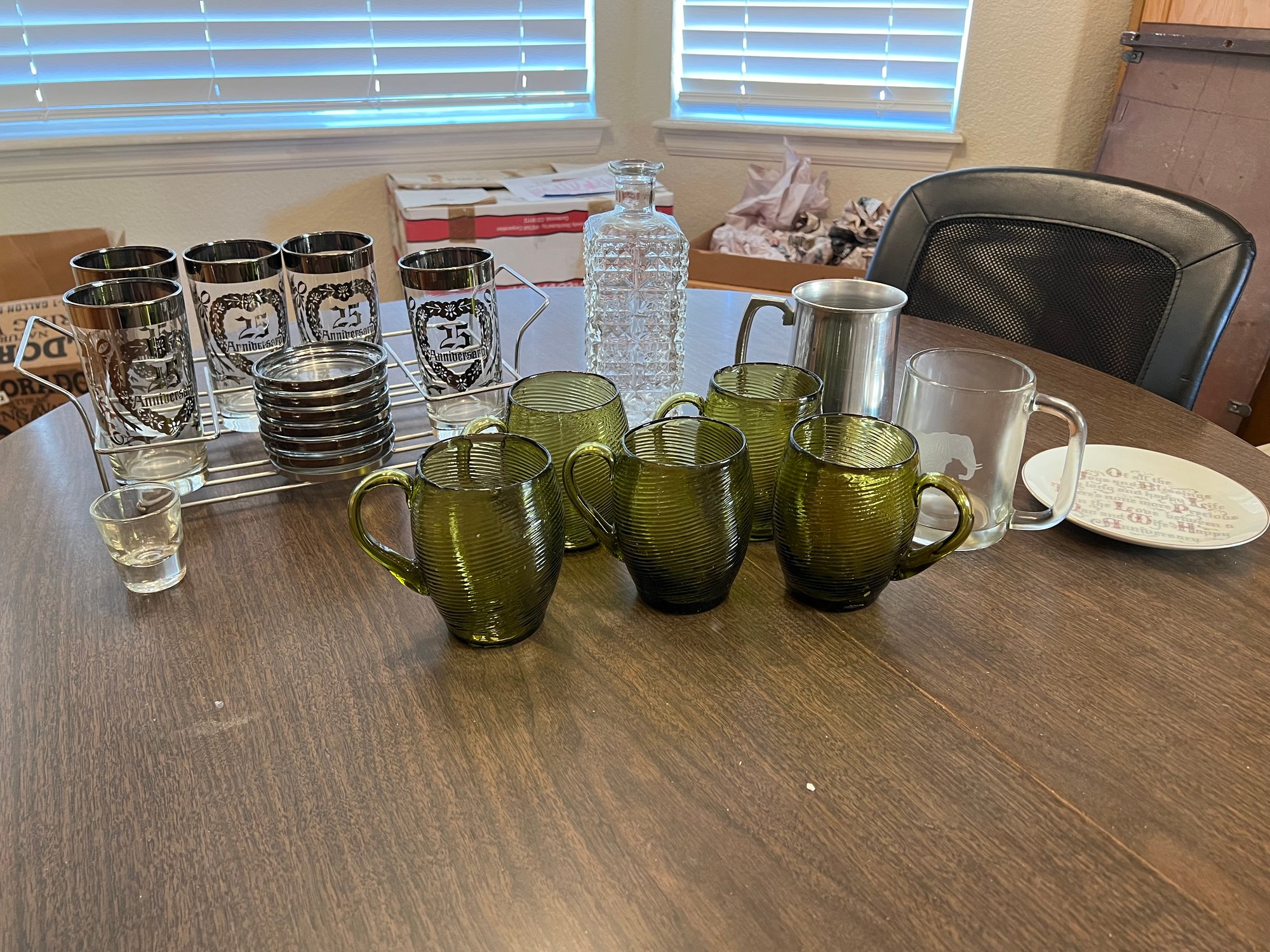 one of the green glasses has a chip on the rim, and one of the anniversary cups is missing.
