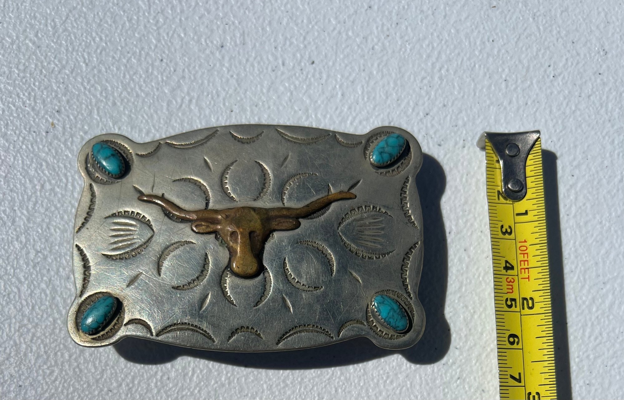 Vintage Steer Nickel Silver Frontier Belt Buckle With Turquoise