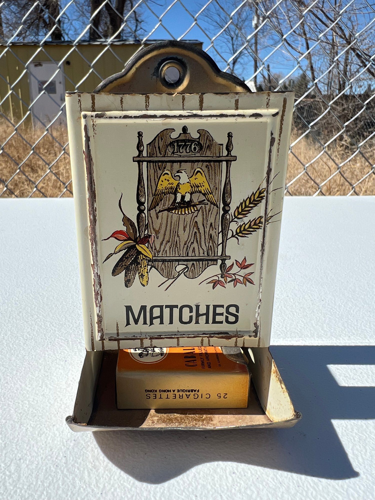 Vintage Wall Hanging Beige & Gold With Americana Eagle Metal Tin Matchbox Holder