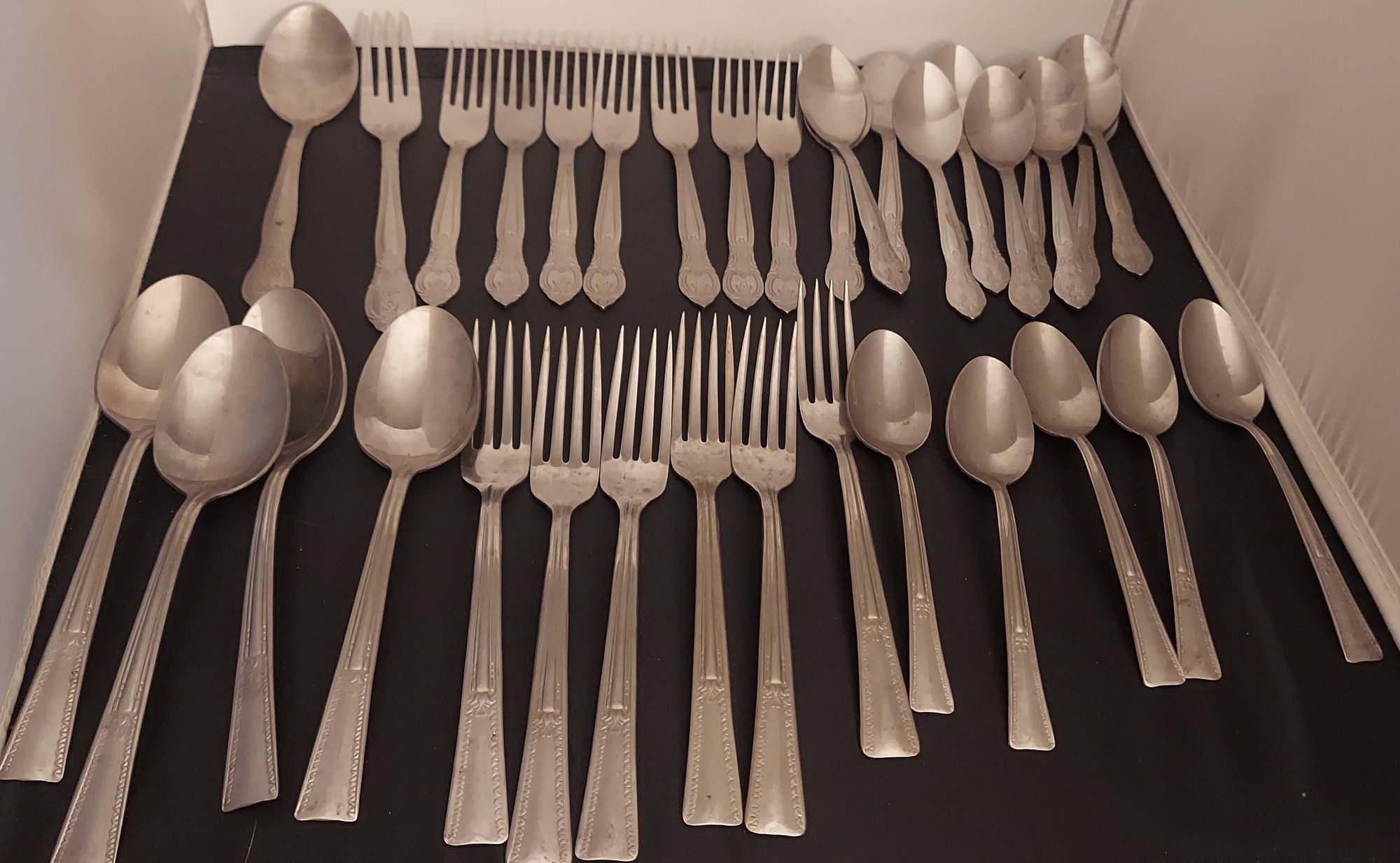 First pic-top row of forks and spoons smaller than bottom row. Both rows very light/thin. Top row great for little kids.