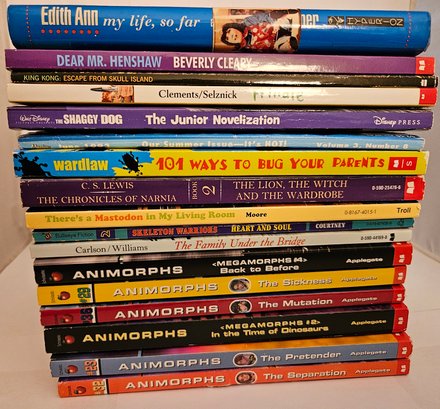 There's a Mastadon in my Living Room (grades 4-6, ages 10-12), The Family Under the Bridge (gr 3-7, ages 8-13), The Lion, the Witch and the Wardrobe (gr 5-6, customers say age 10-12 ), Shaggy Dog (gr 3-7, ages 8-12), 101 Ways to Bug your Parents (gr 4-6, ages 8-12), Frindle grades 4-7, ages 8-12, other two (Magazine and Edith Ann unknown Parental guidance)