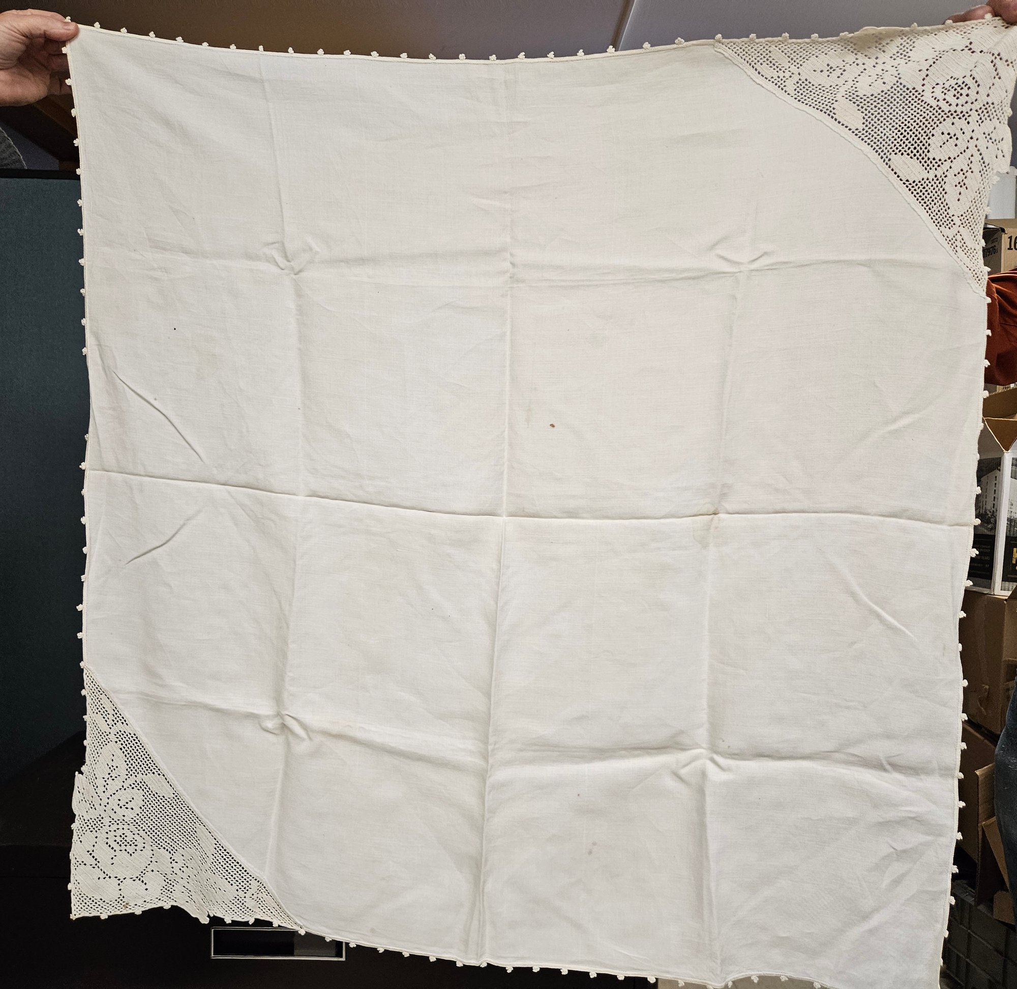 Lace corners are very nice with rose design measures approximately 36" x 37", 12 matching napkins, 3 of which are in great condition. There is one small hole (shown in pic) and a few small stains. Eyelet piece is very pretty. Yellowish stsin on bottom left (shown in pic). Measures approx 32" x 35". There are 3 non matching napkins plus 6 non matching napkins. Napkins well used, well loved with a varying amount of stains.