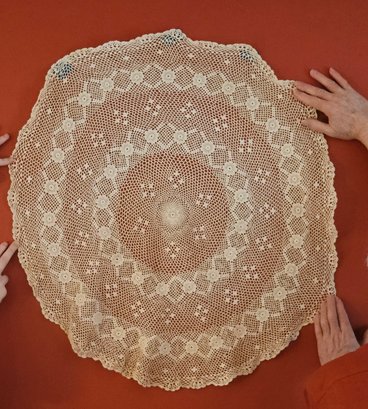 Doily approx 33" x 33". Doily very good condition. Tablecloth has a variety of stains, some shown in pics