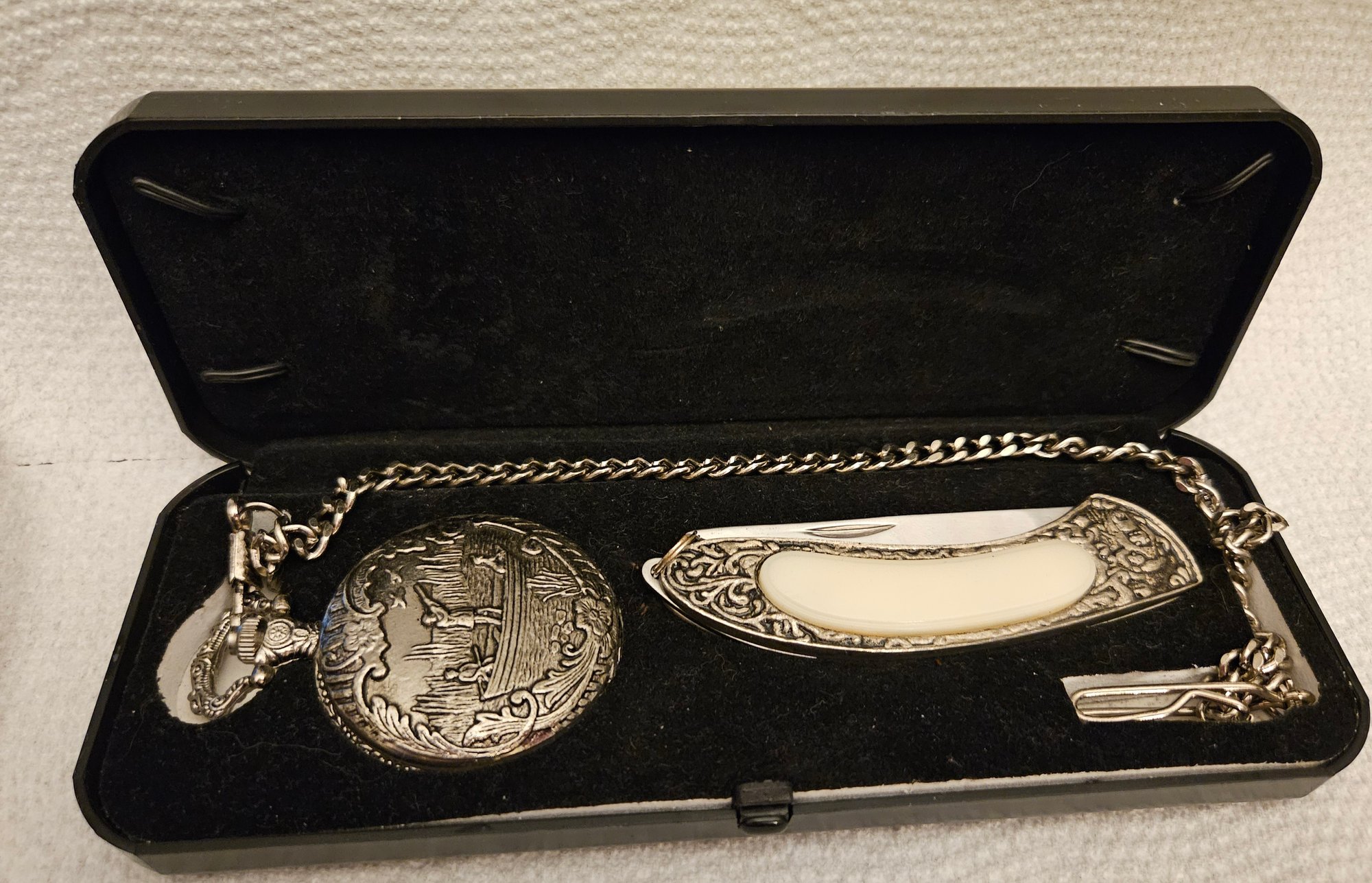 Geneva pocket watch and folding knife set.