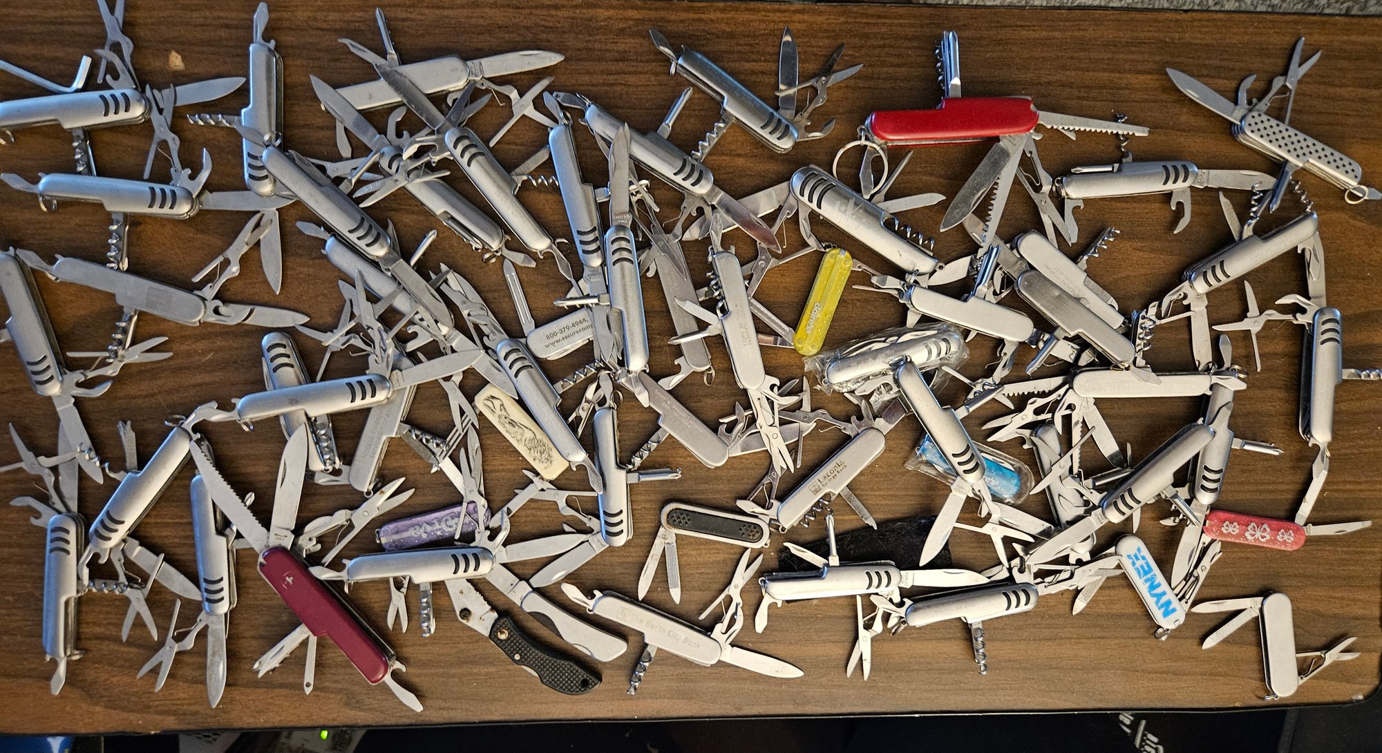 Table lot of pocket knives as shown. There are fifty-seven (57) in all.