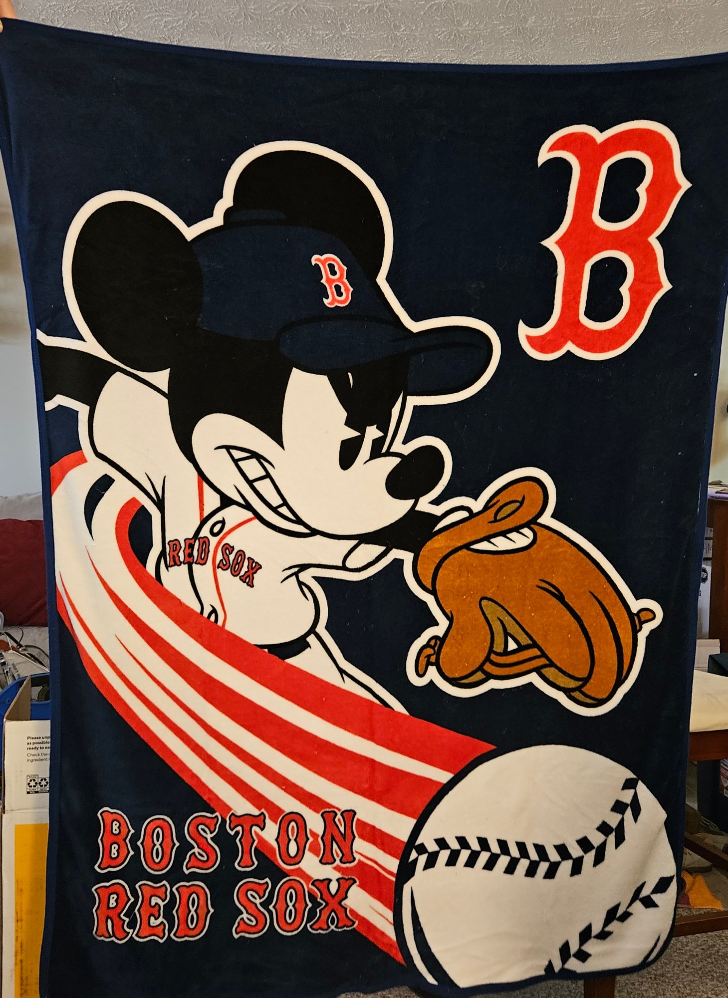There are 2 items in this lot. Boston Red Sox/Mickey Mouse Plush Throw measuring 4'x5' and a large Red Sox Beach Towel. Throw does have a few "pulls .