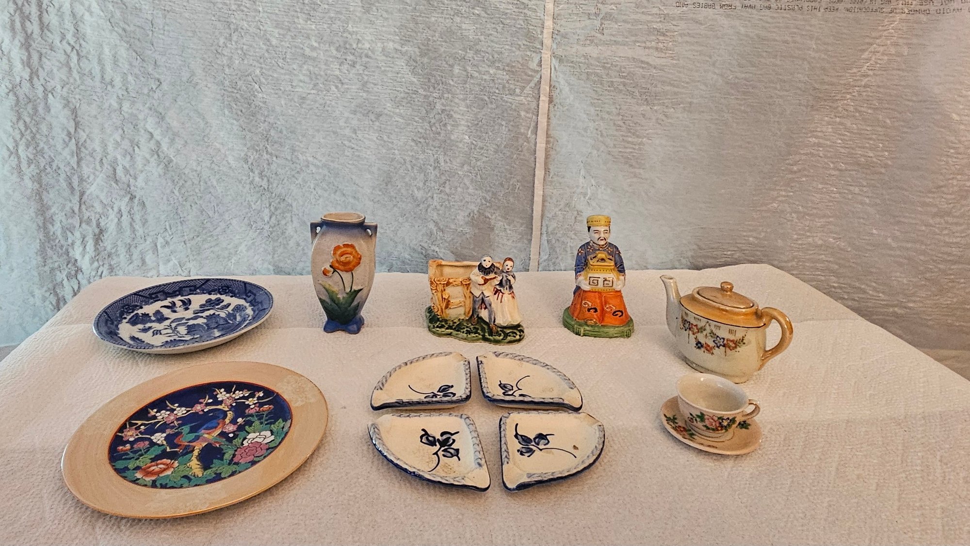 Vase. Incense burner. figurines, dollhouse size teapot and cup and saucer, blue saucer, small plate, ash trays.