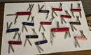 In 3rd picture, first two columns are perfect. Last column has pink shows some wear on outside and face of blade stained, one missing cross, one has blade that stained on end from fire and one has initials with DOB worn off. The above 4 described all usable, have all parts. Lot includes one medium size and one large.
