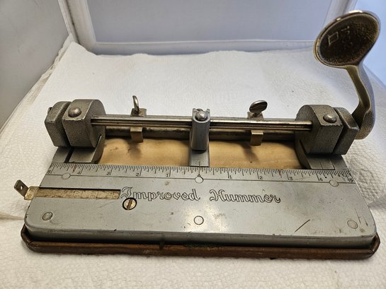 Three hole punch nice vintage item, has weight to it-heavy when picking up. Plastic rack does have a crack in back.