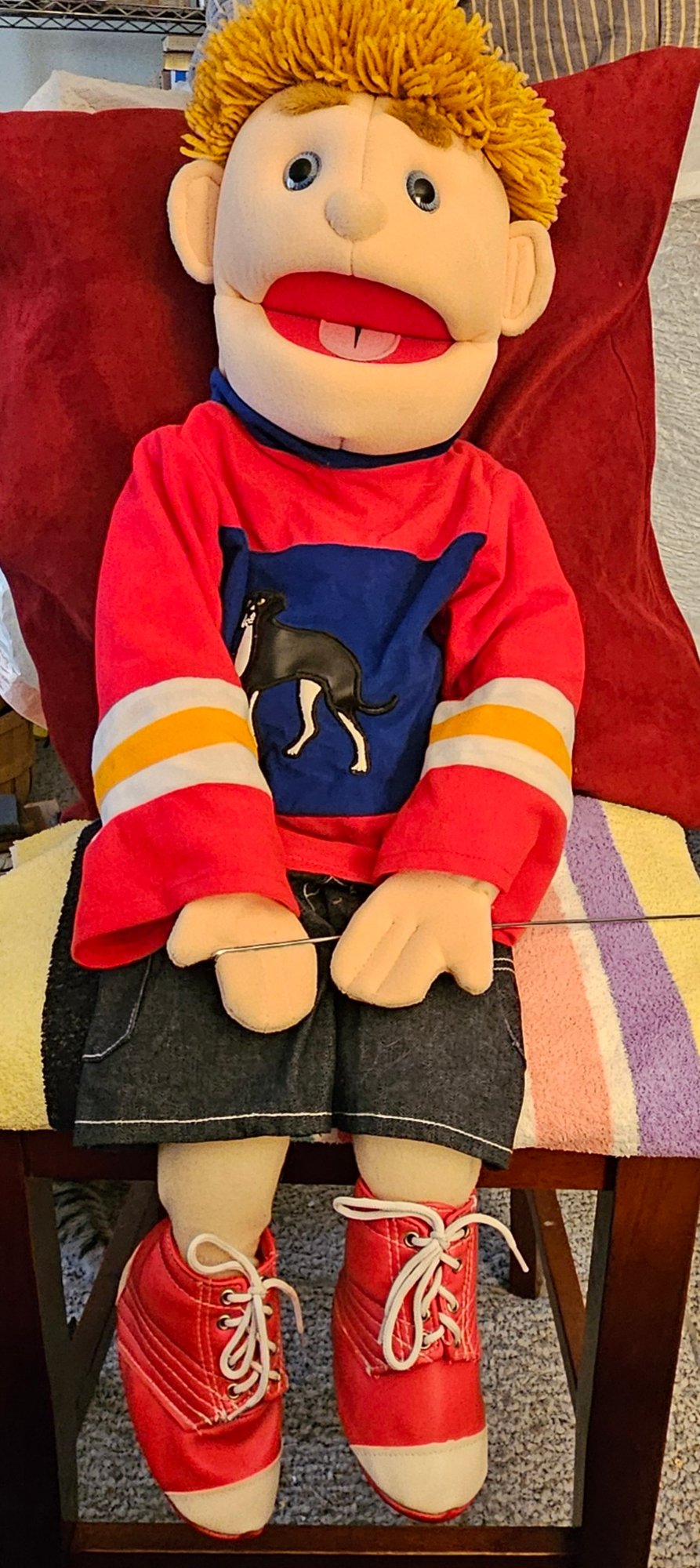 One gand makes mouth move, other hand works wand for hand movements.