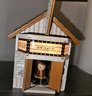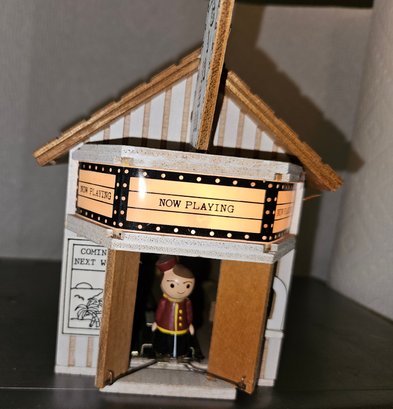 Winds for music. Music a bit sluggish so far. Little person comes through doors. Two double AA batteries light up sign.