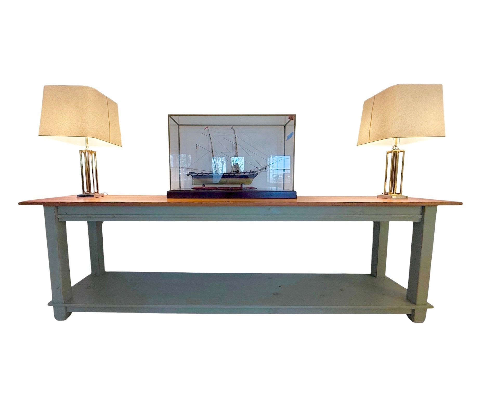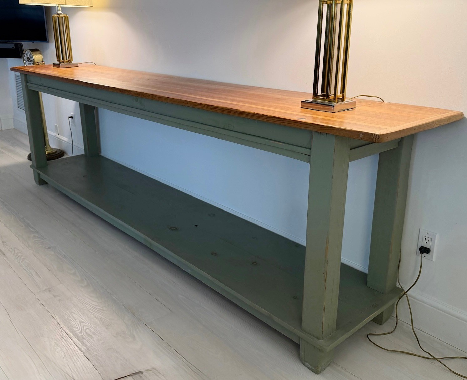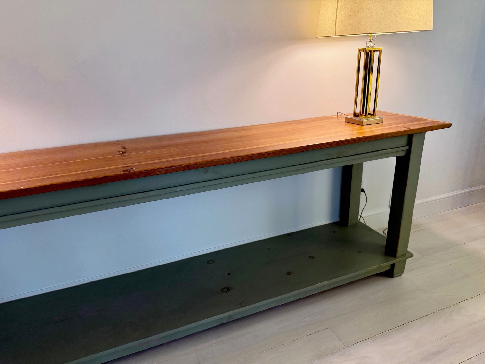 Natural finish on top with Green painted legs