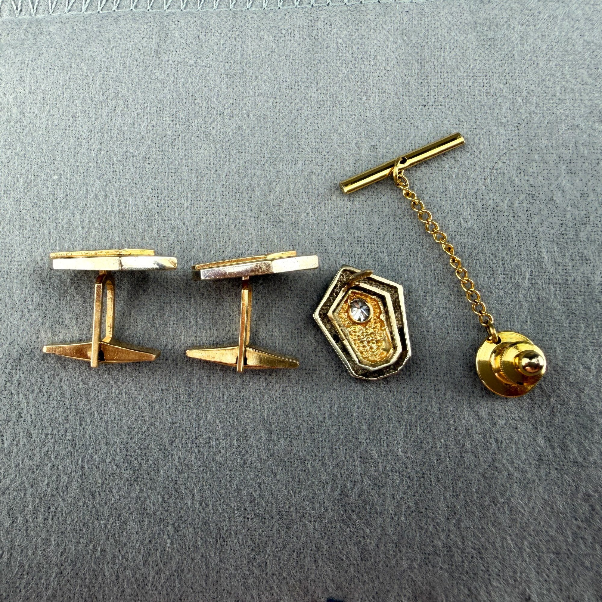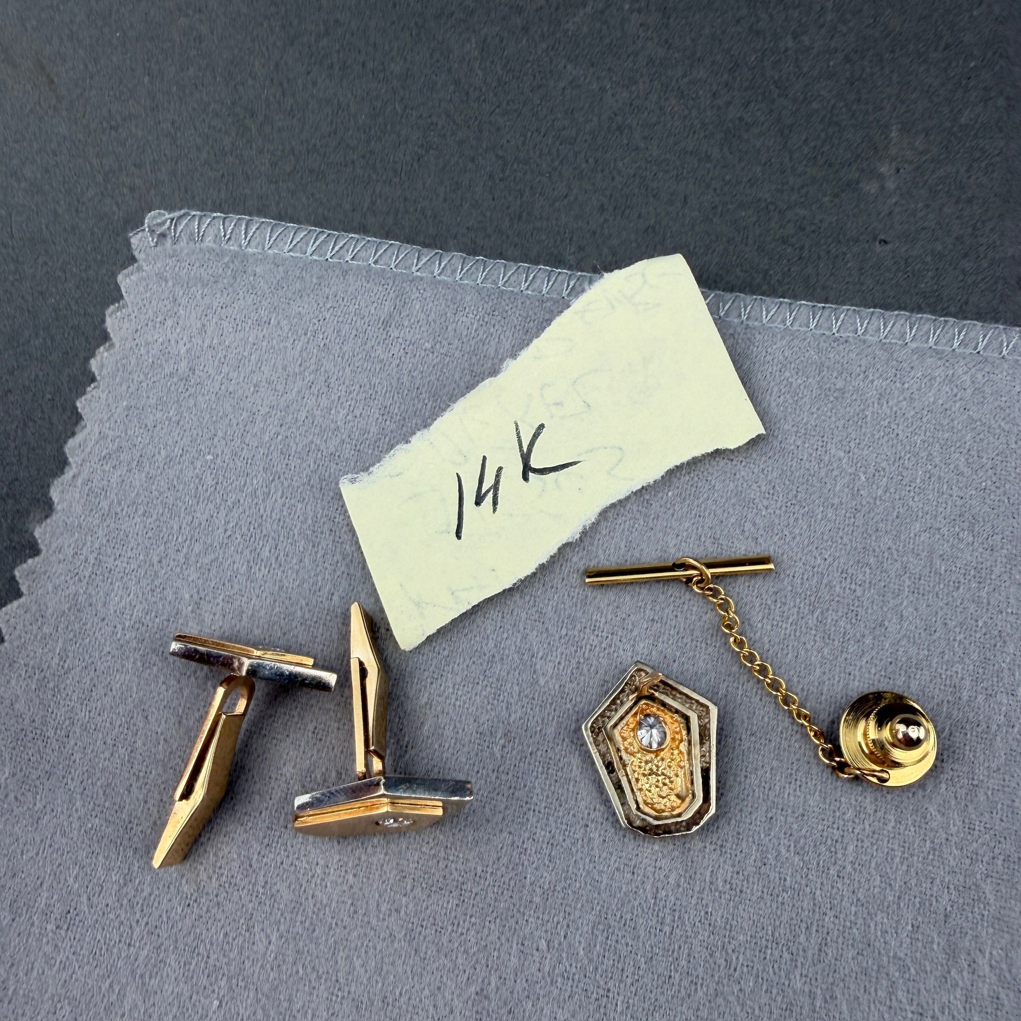 Vintage two tone, 14kt brushed yellow and white gold, set of cufflinks and tie bar.