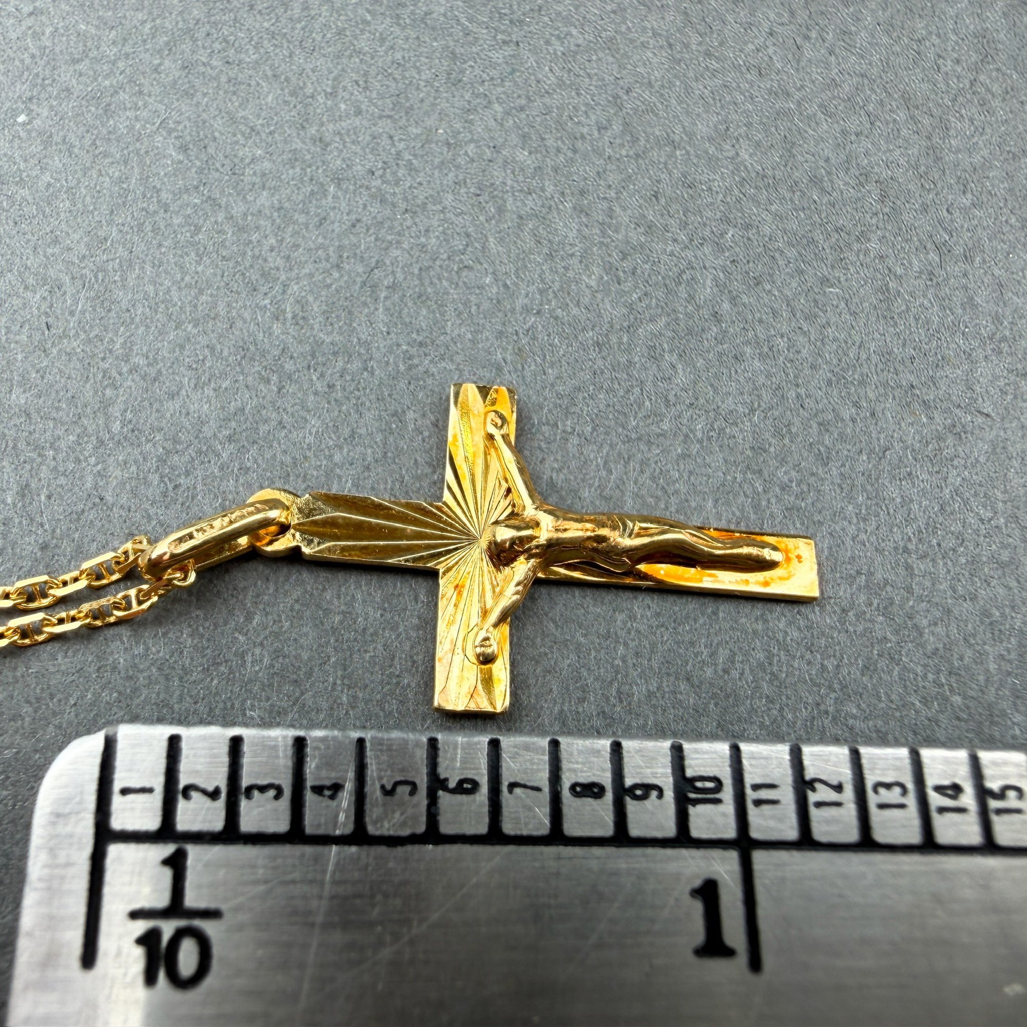 14kt yellow gold crucifix pendant on 14kt yellow gold mariner link chain.