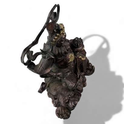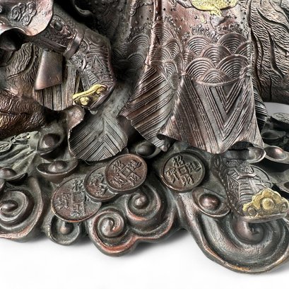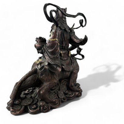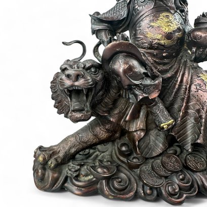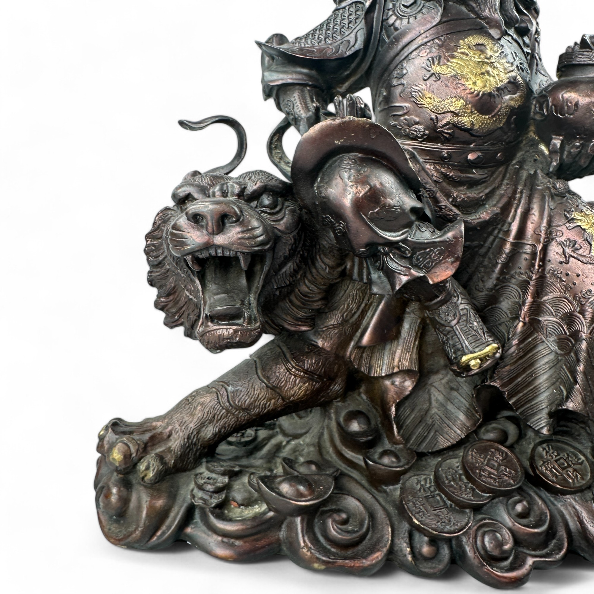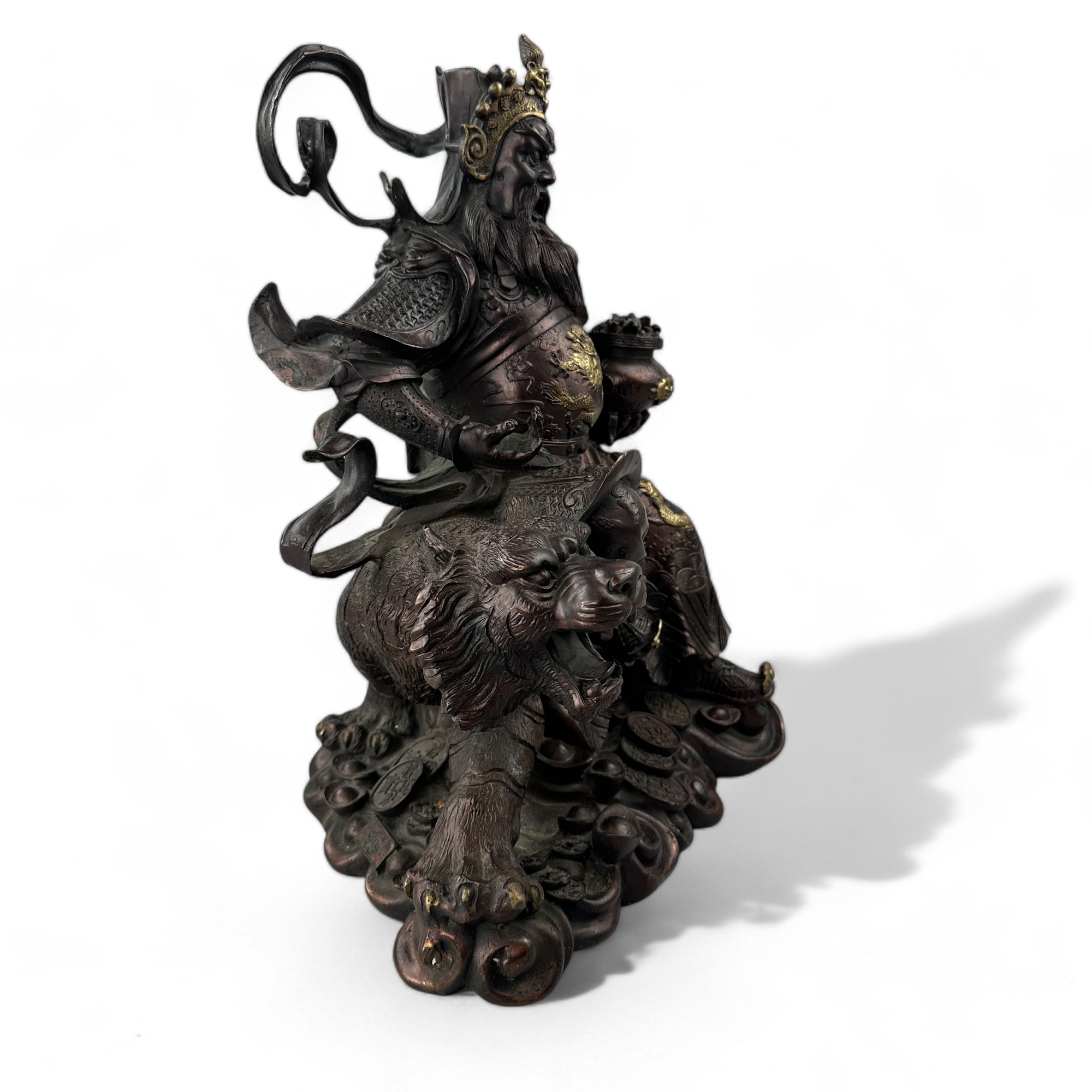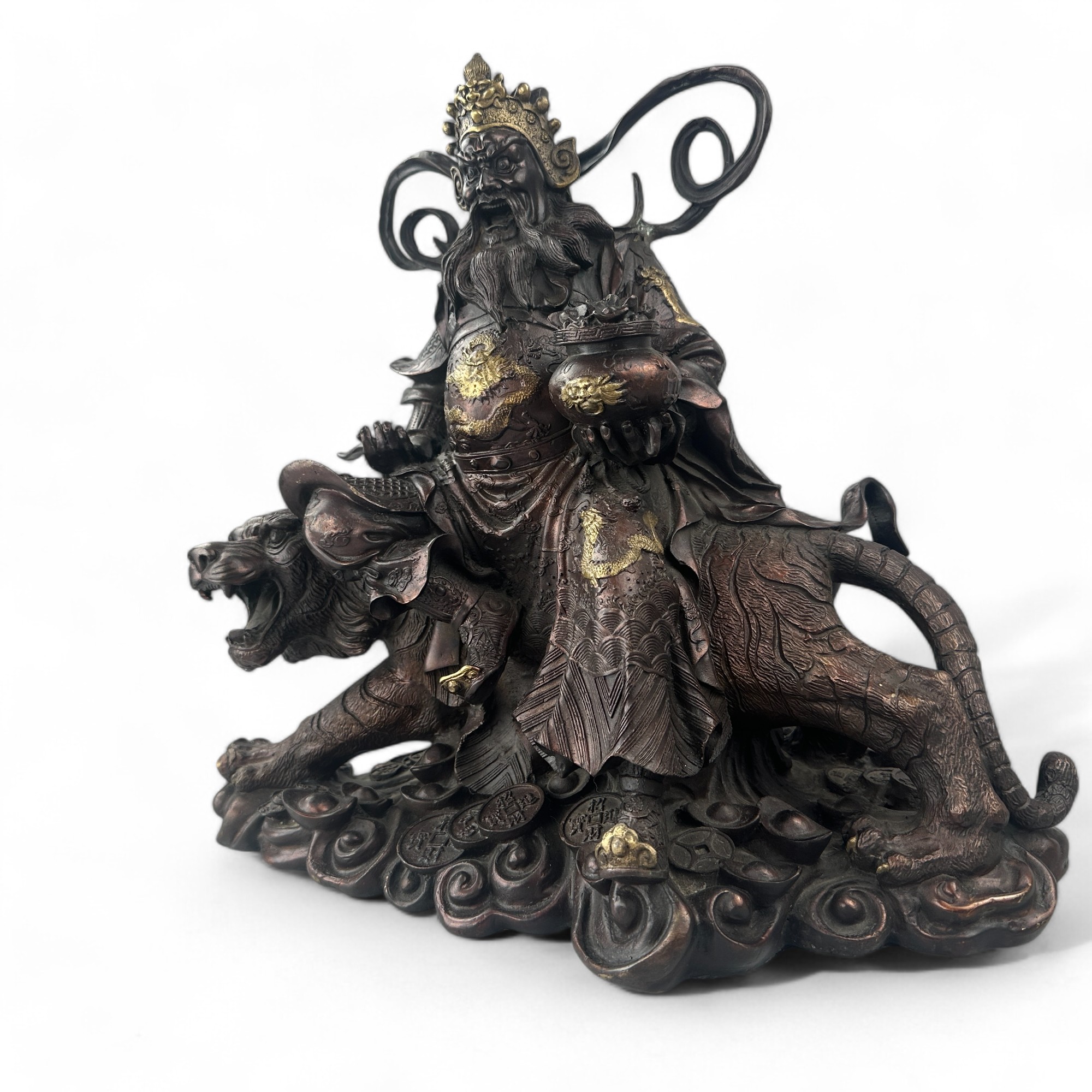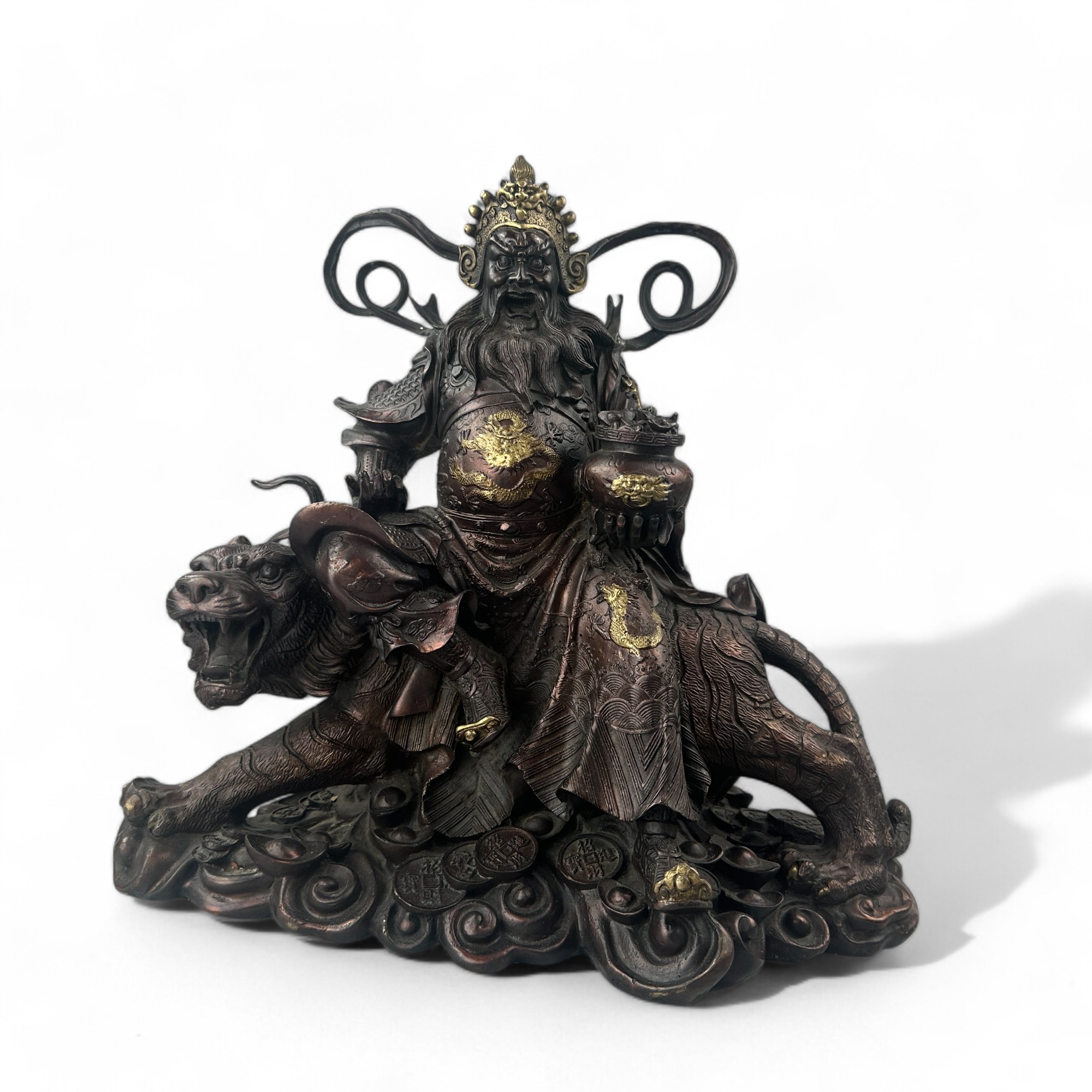 A late 19th / early 20th century Asian bronze model of a deity seated on a tiger, possibly showing the god of wealth Tsai Shen Yeh.