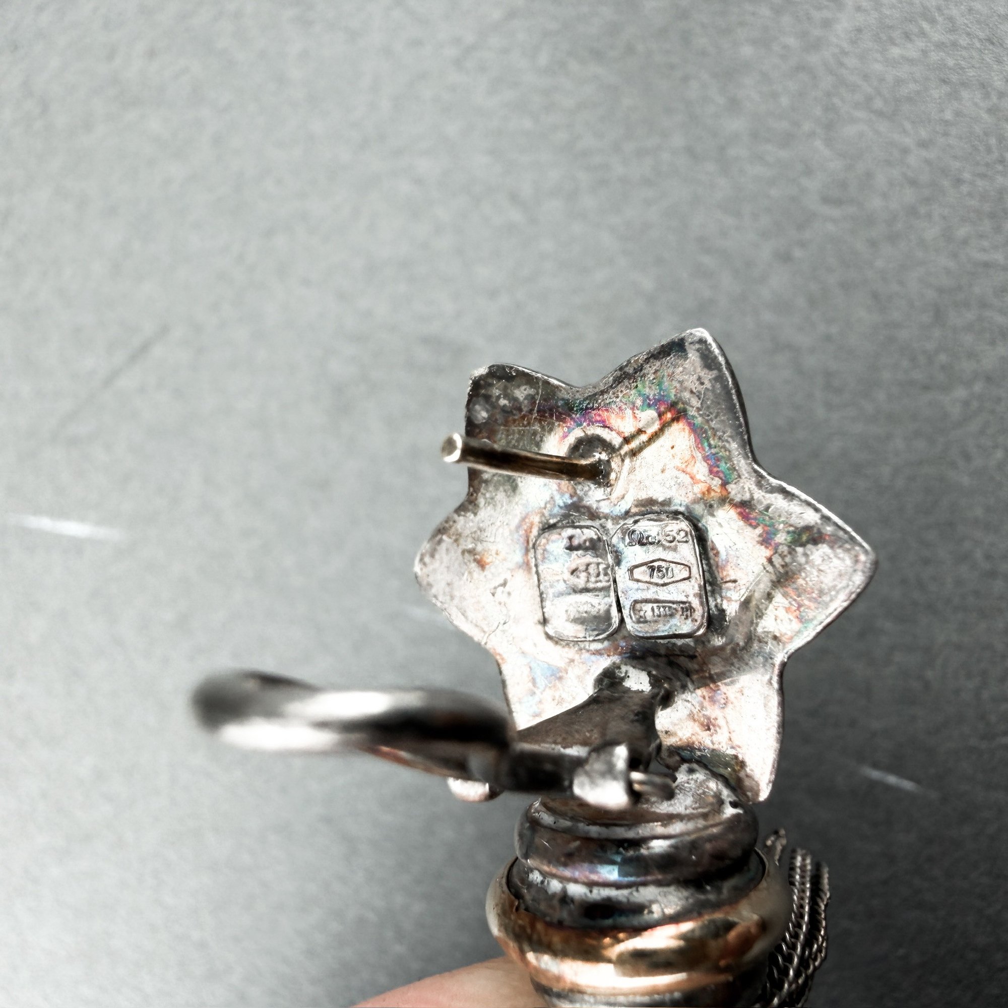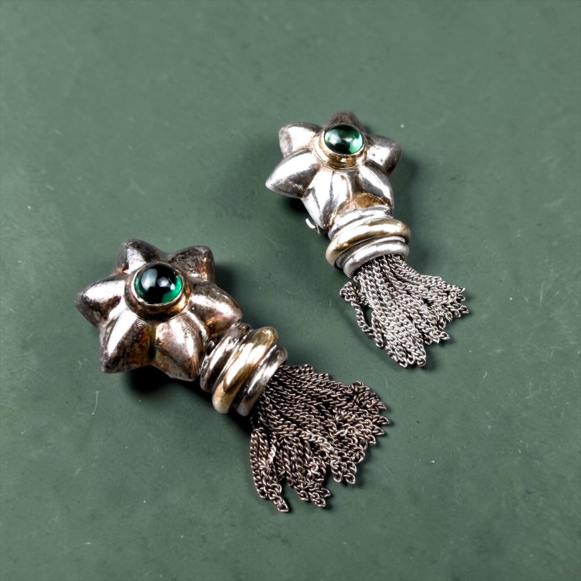 14kt gold and sterling silver star shape with green cabochon stone and tassel chains