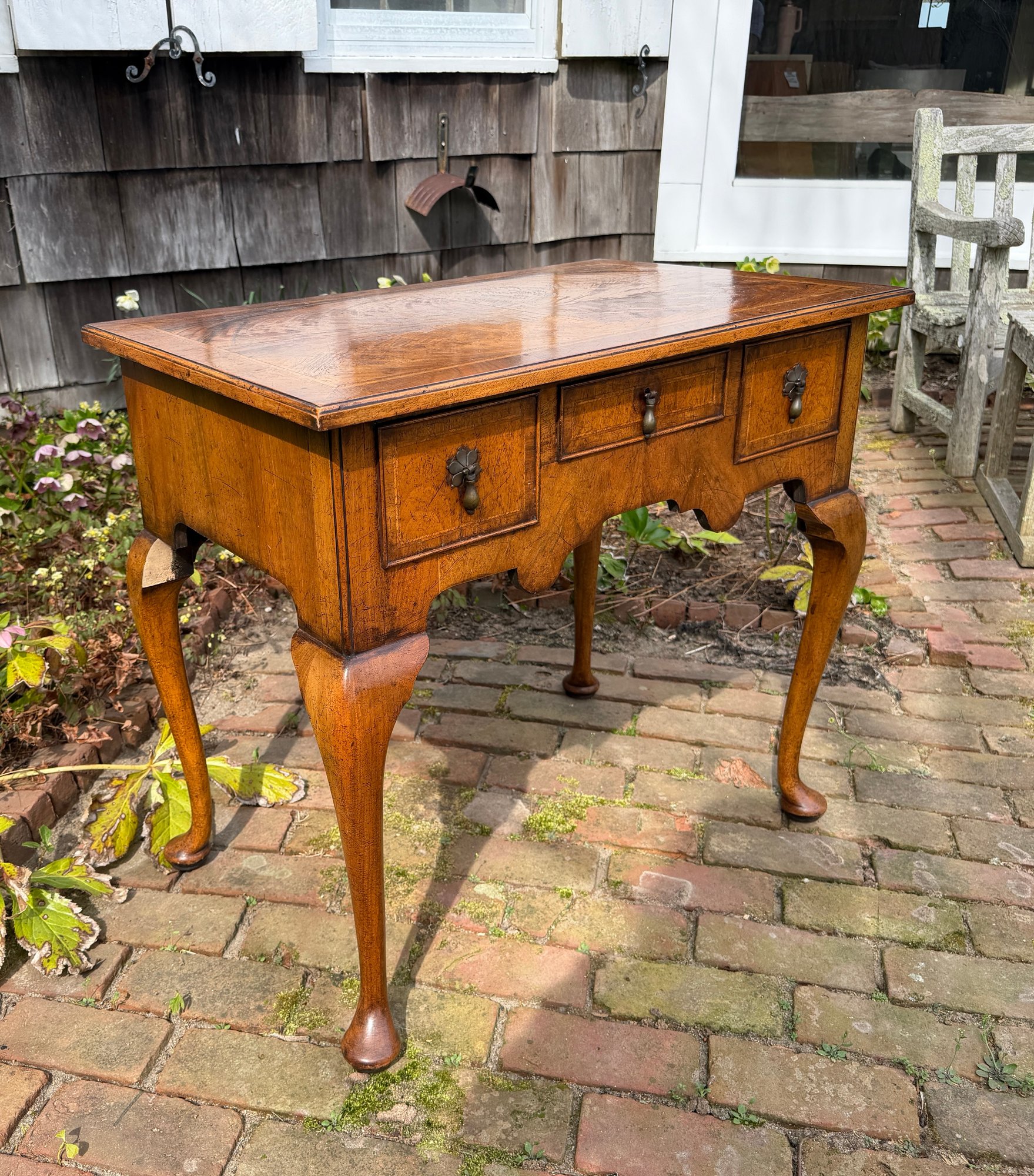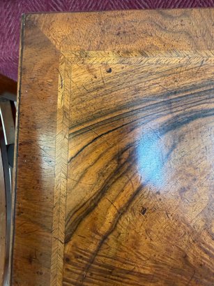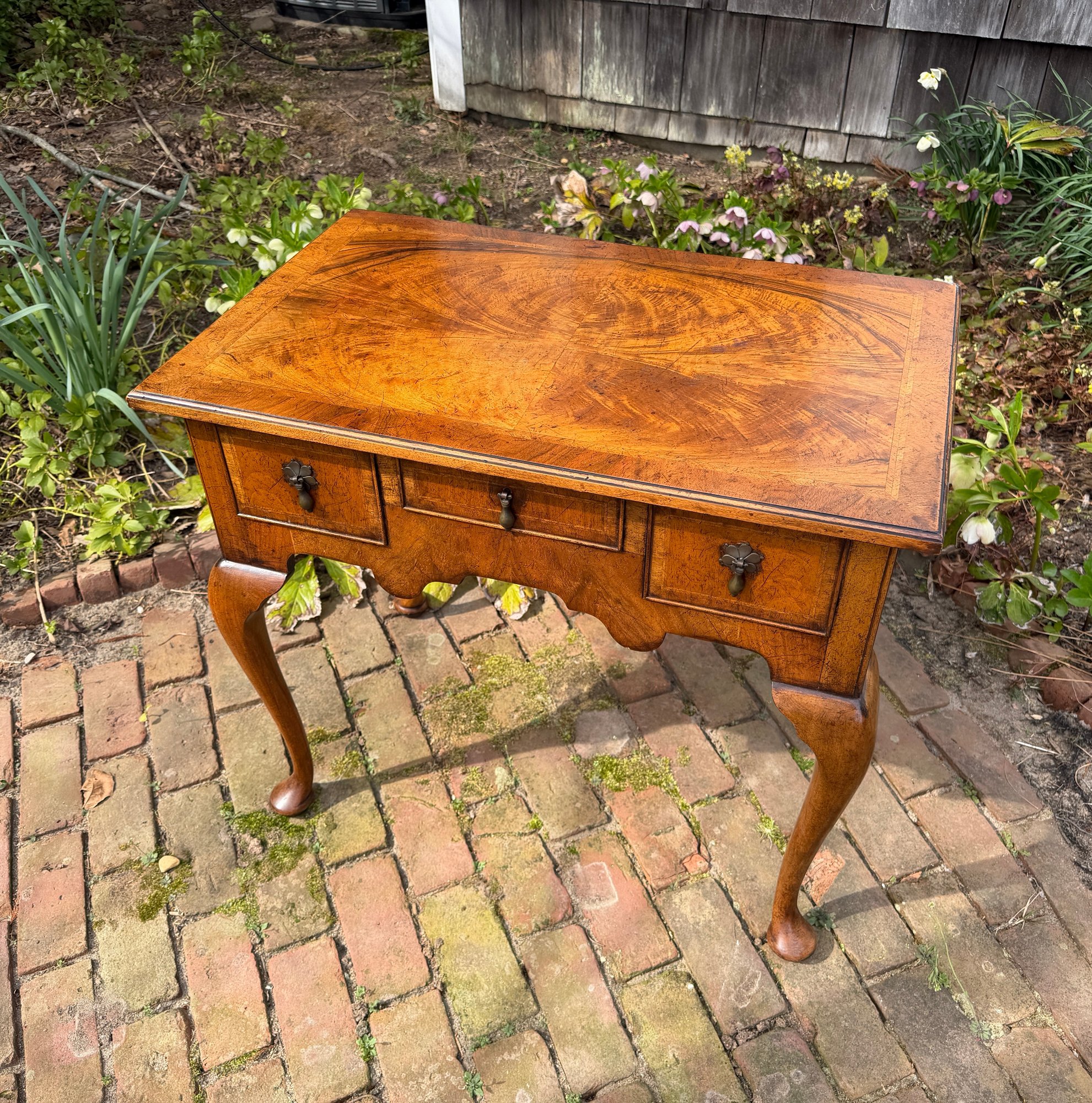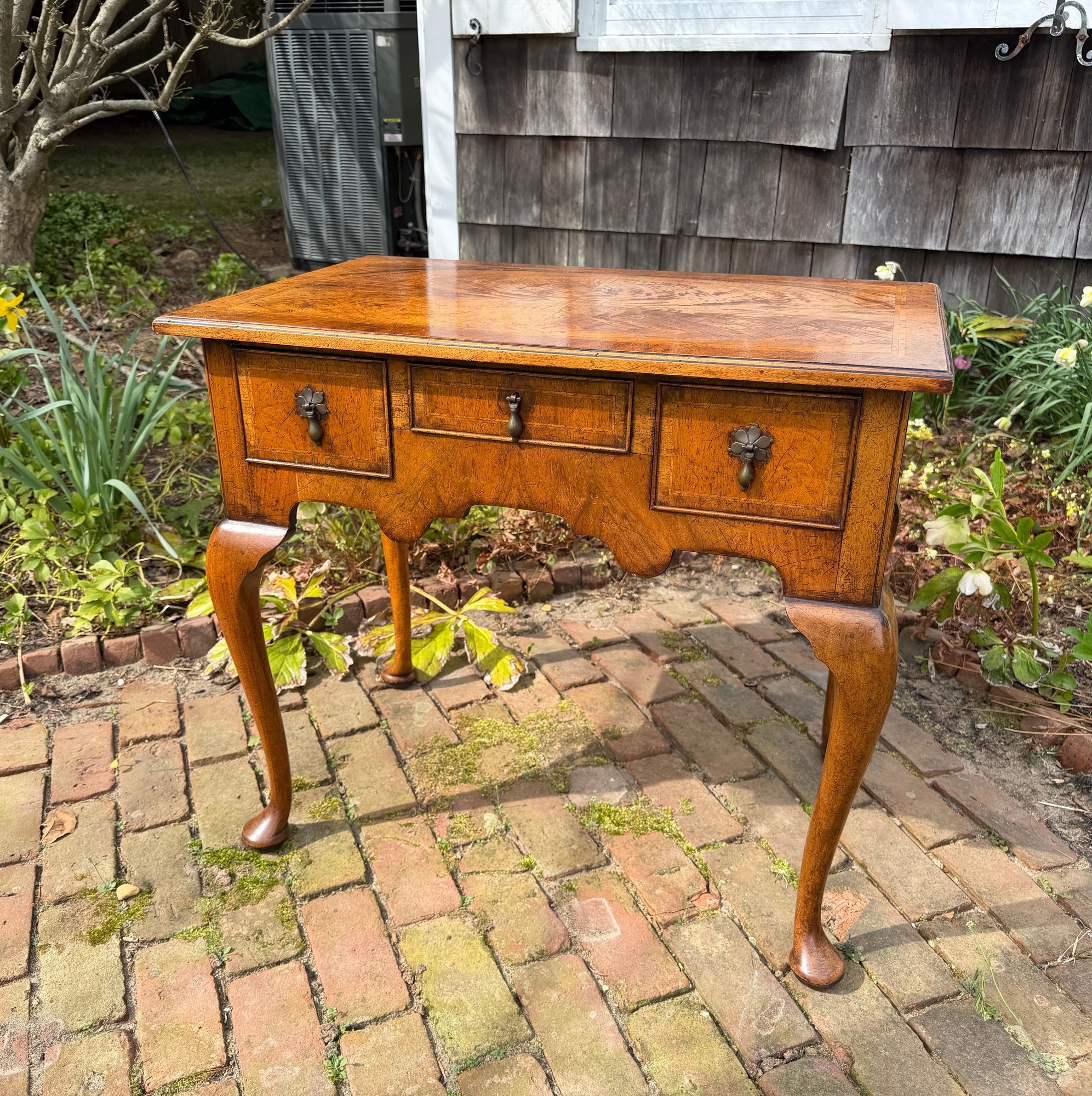 Banded cockbeaded drawers, shaped apron and cabriole legs raised on pad feet