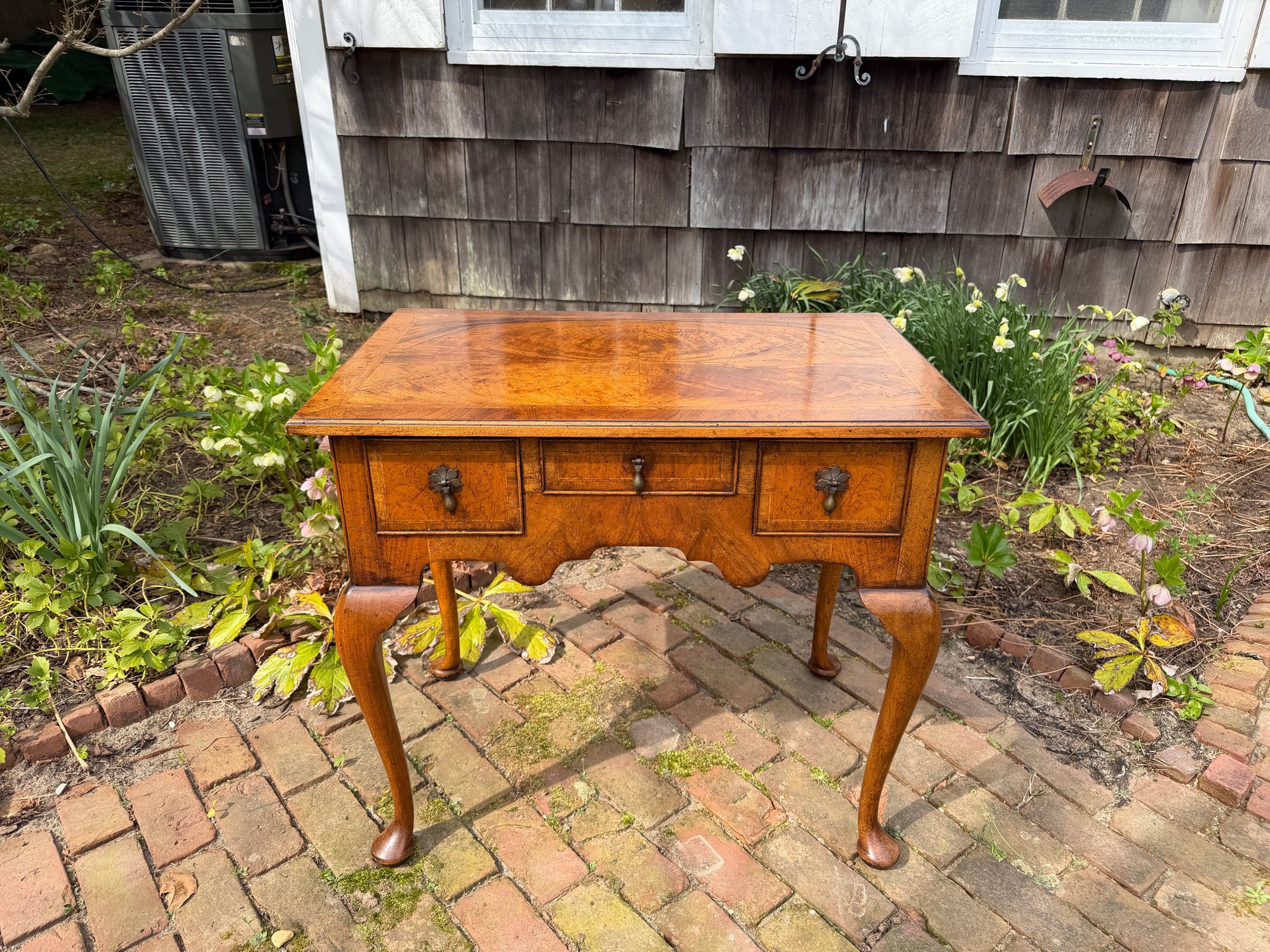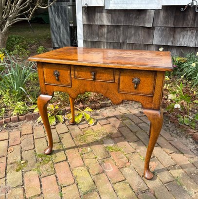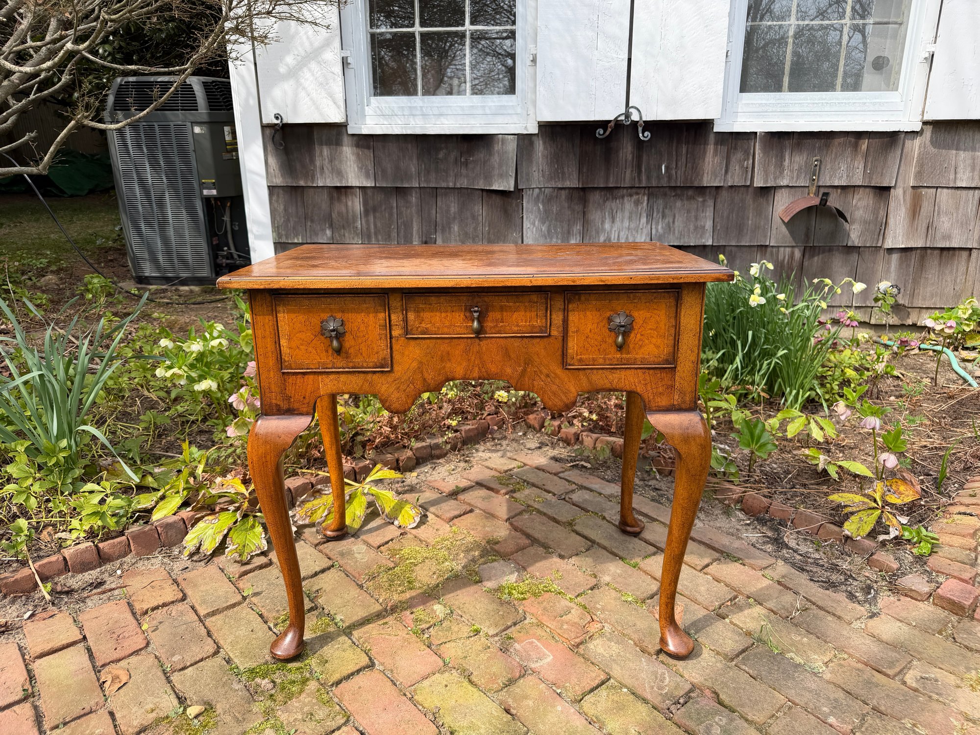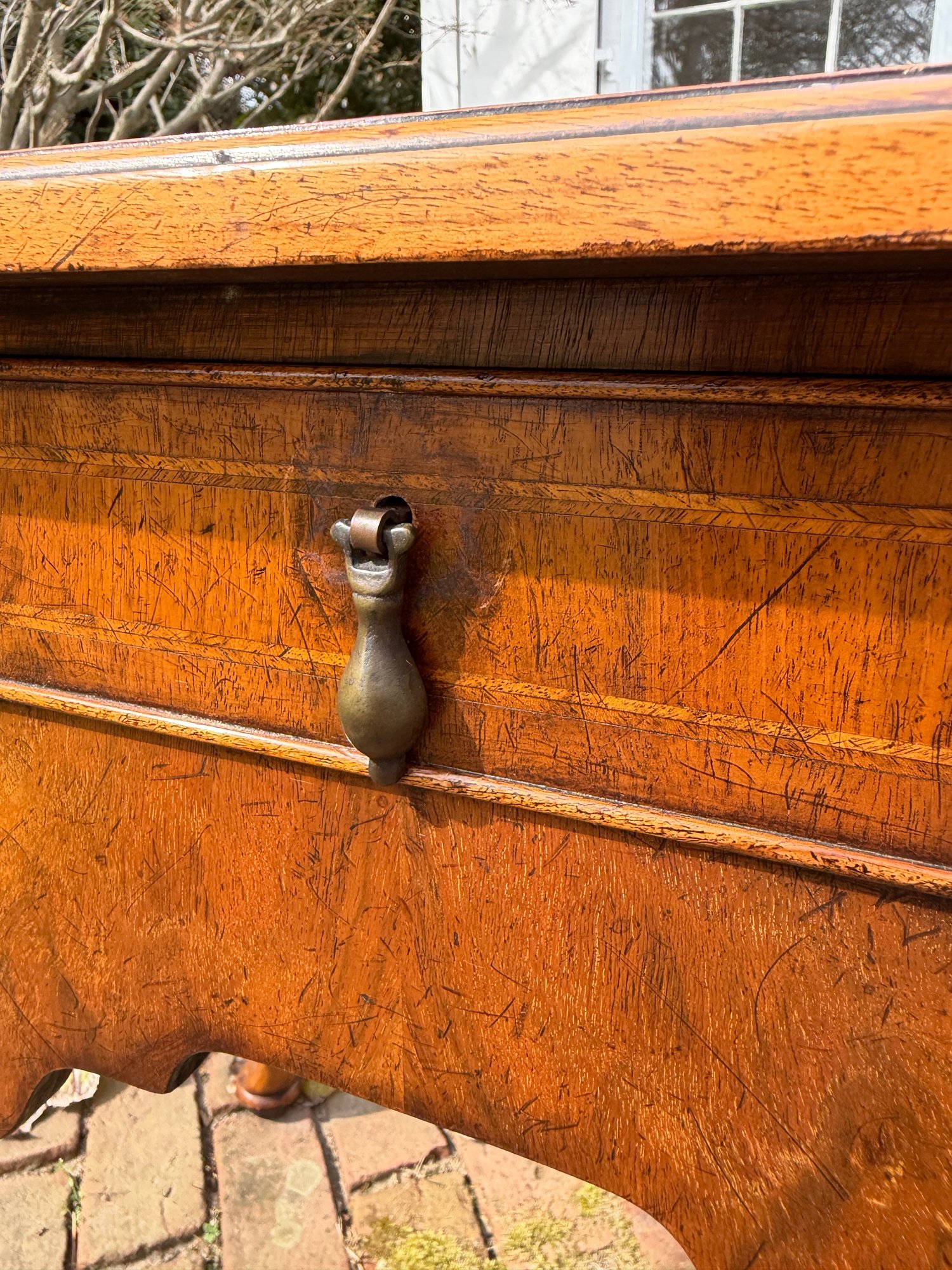 Banded cockbeaded drawers, shaped apron and cabriole legs raised on pad feet