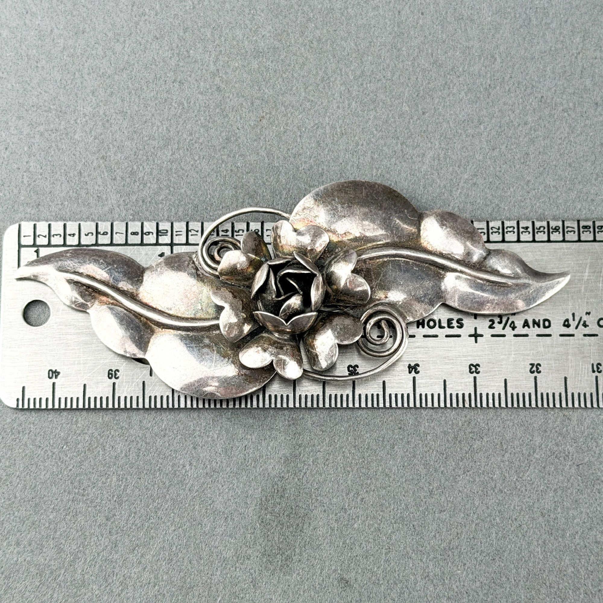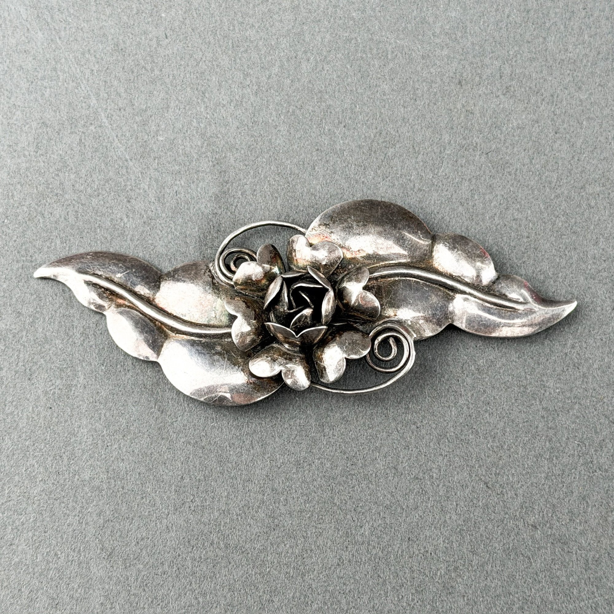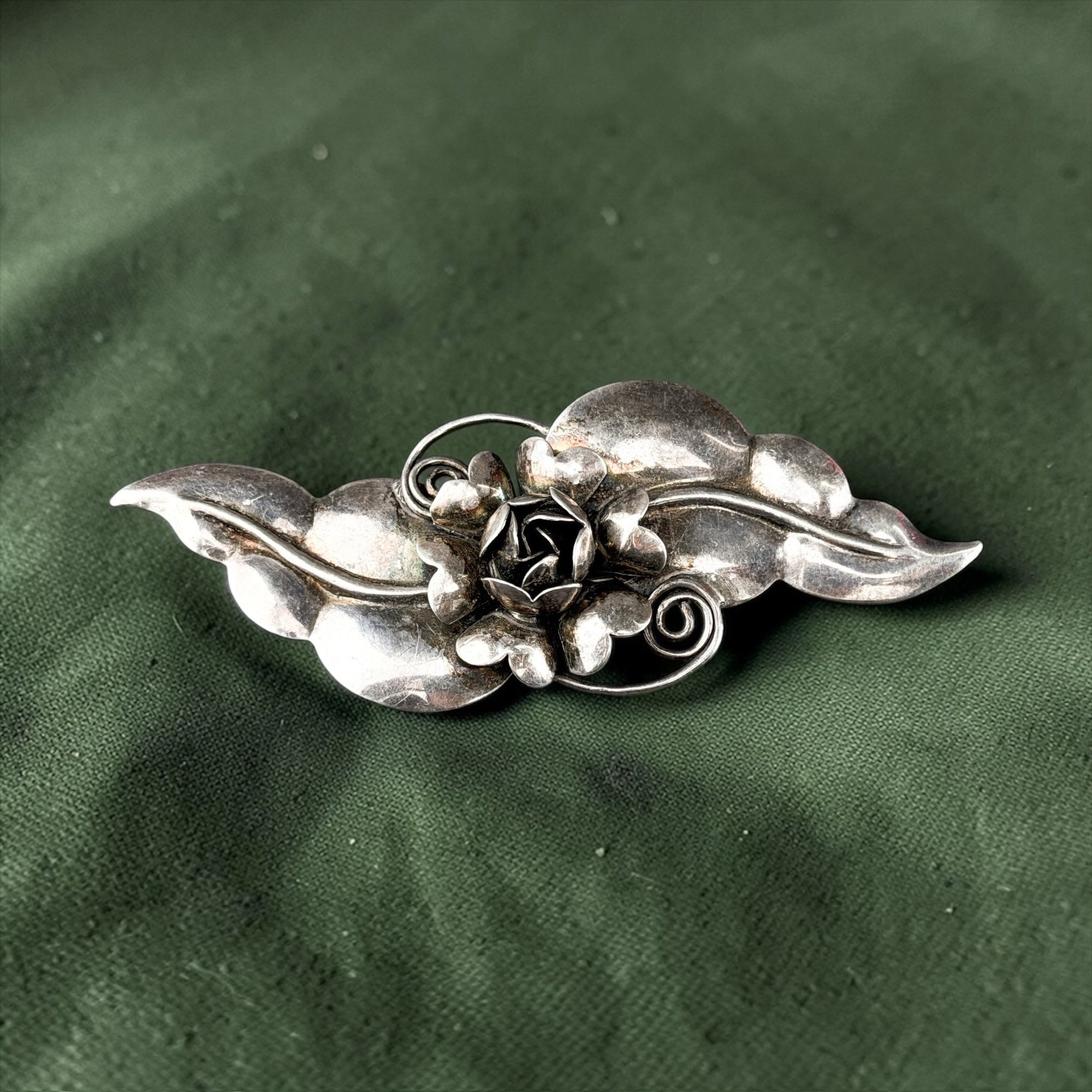 c. 1942-44, coro Sterling silver craft floral link bracelet and an antique and sterling silver floral pin.