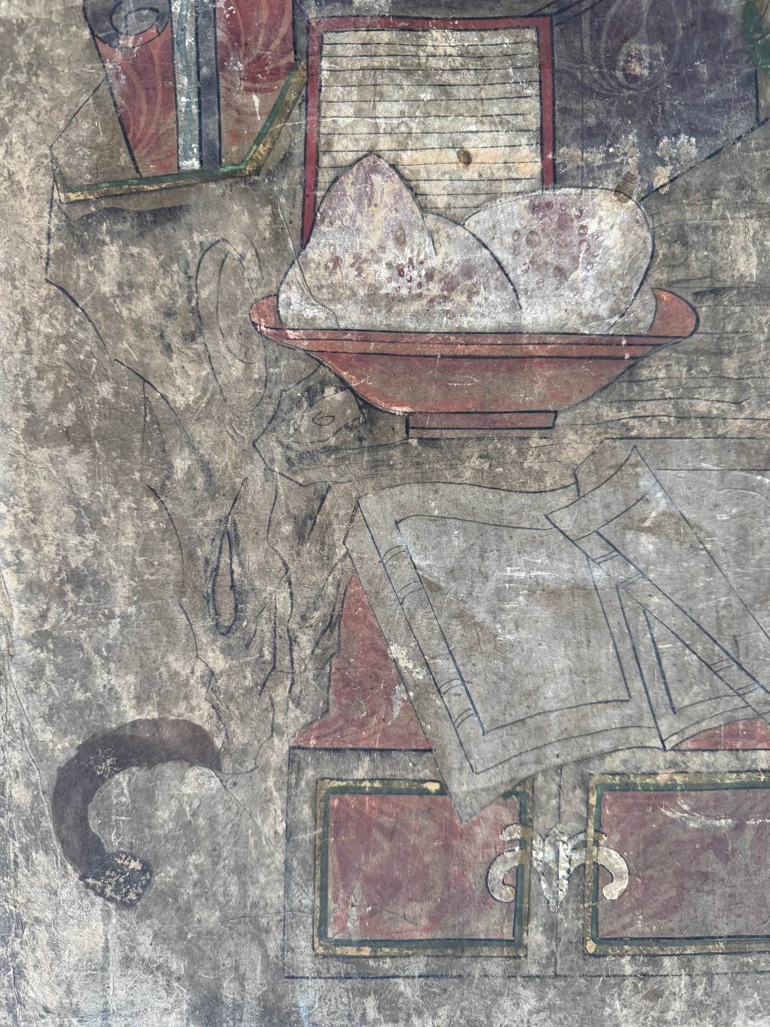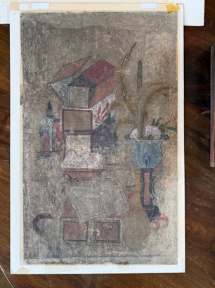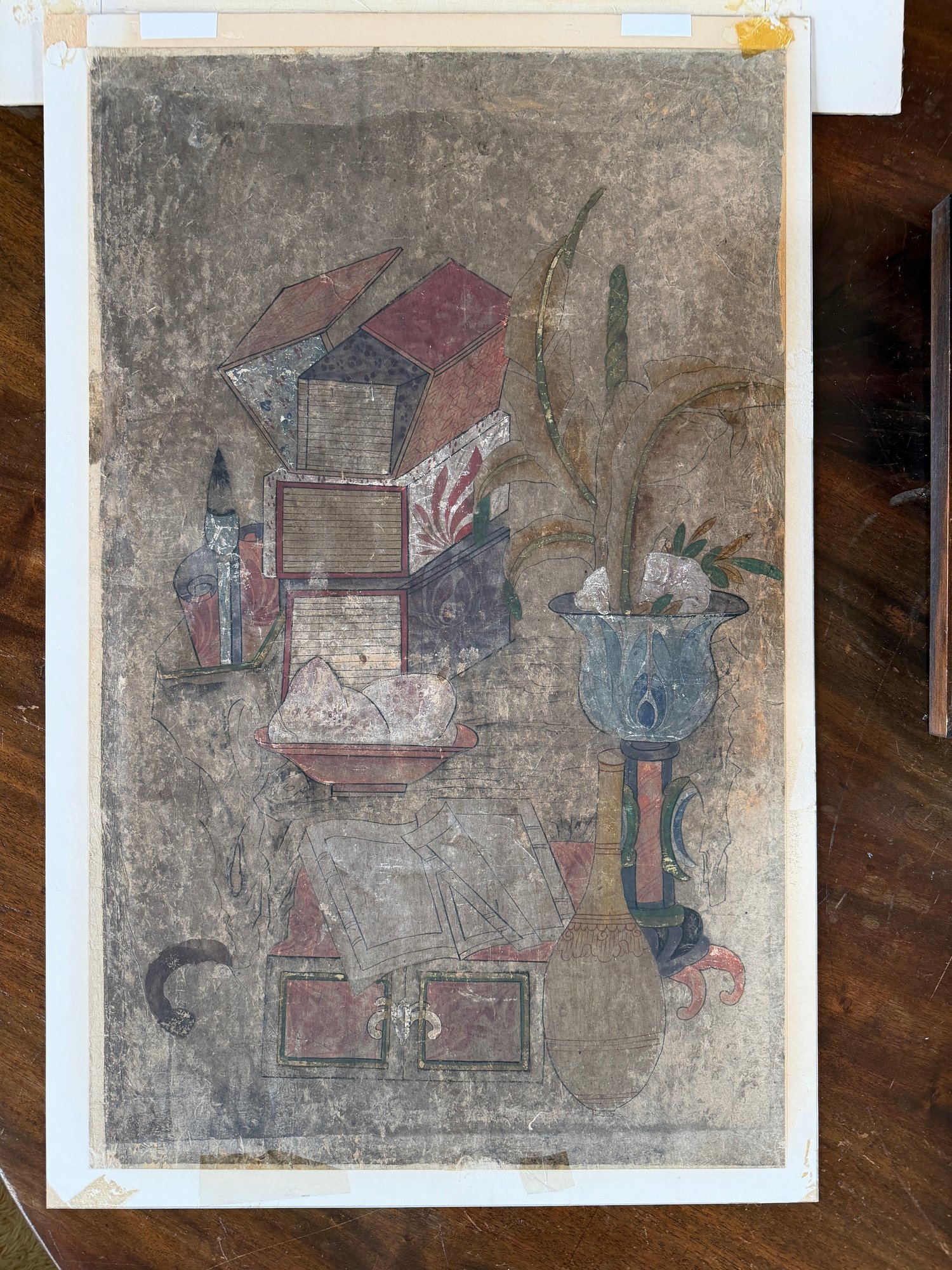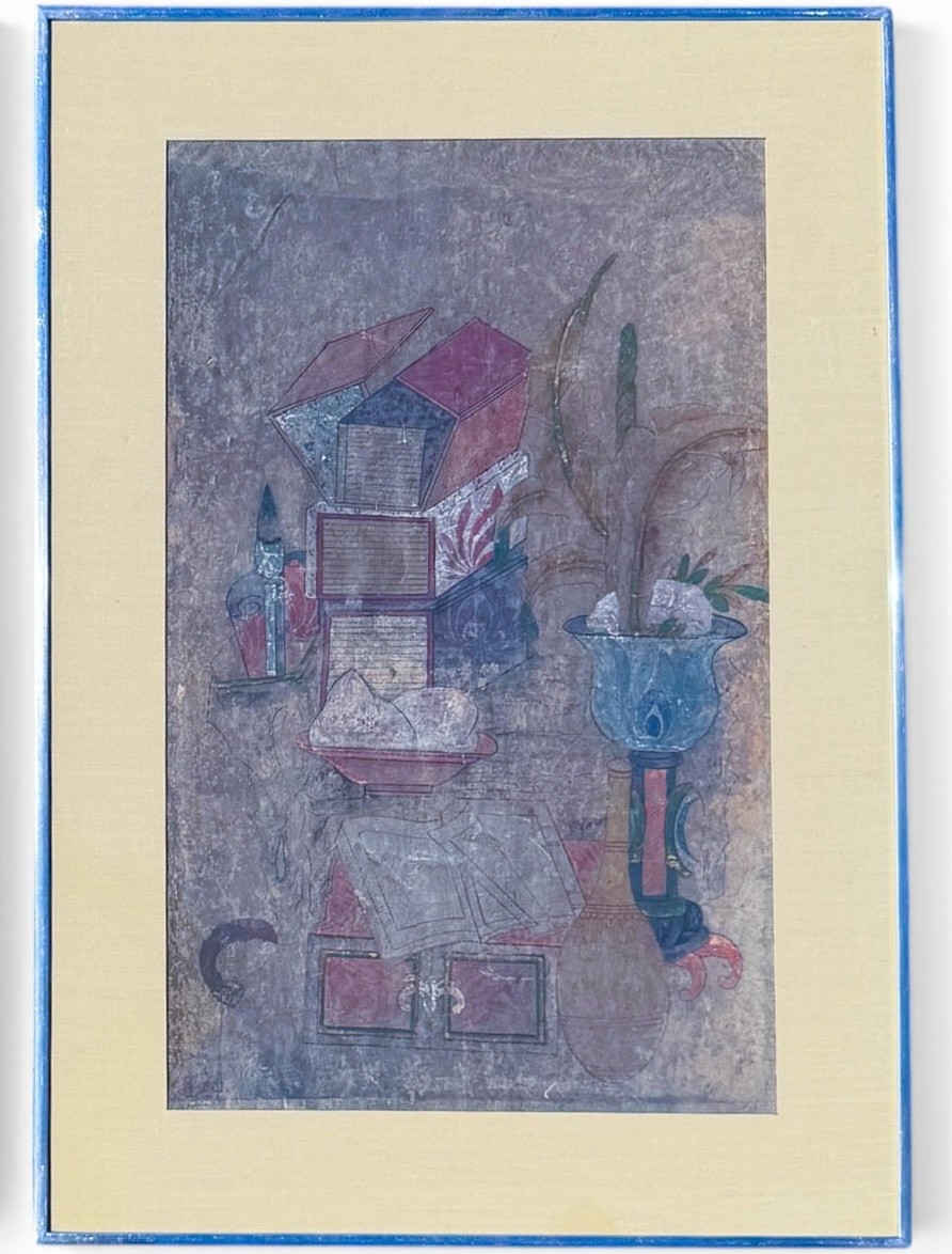 Books and Scholarly Objects. Gouache 24 x 15 inches. framed 29.5 x 21 inches (overall)