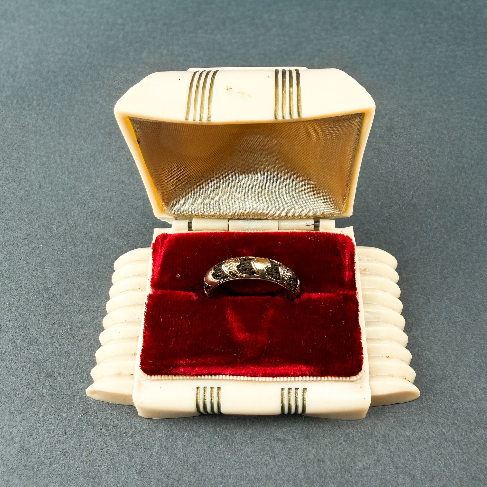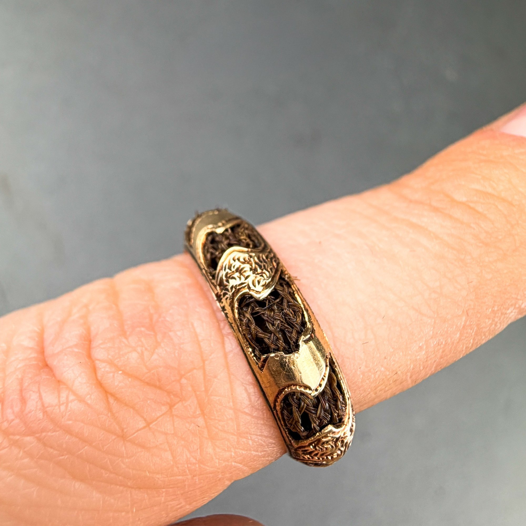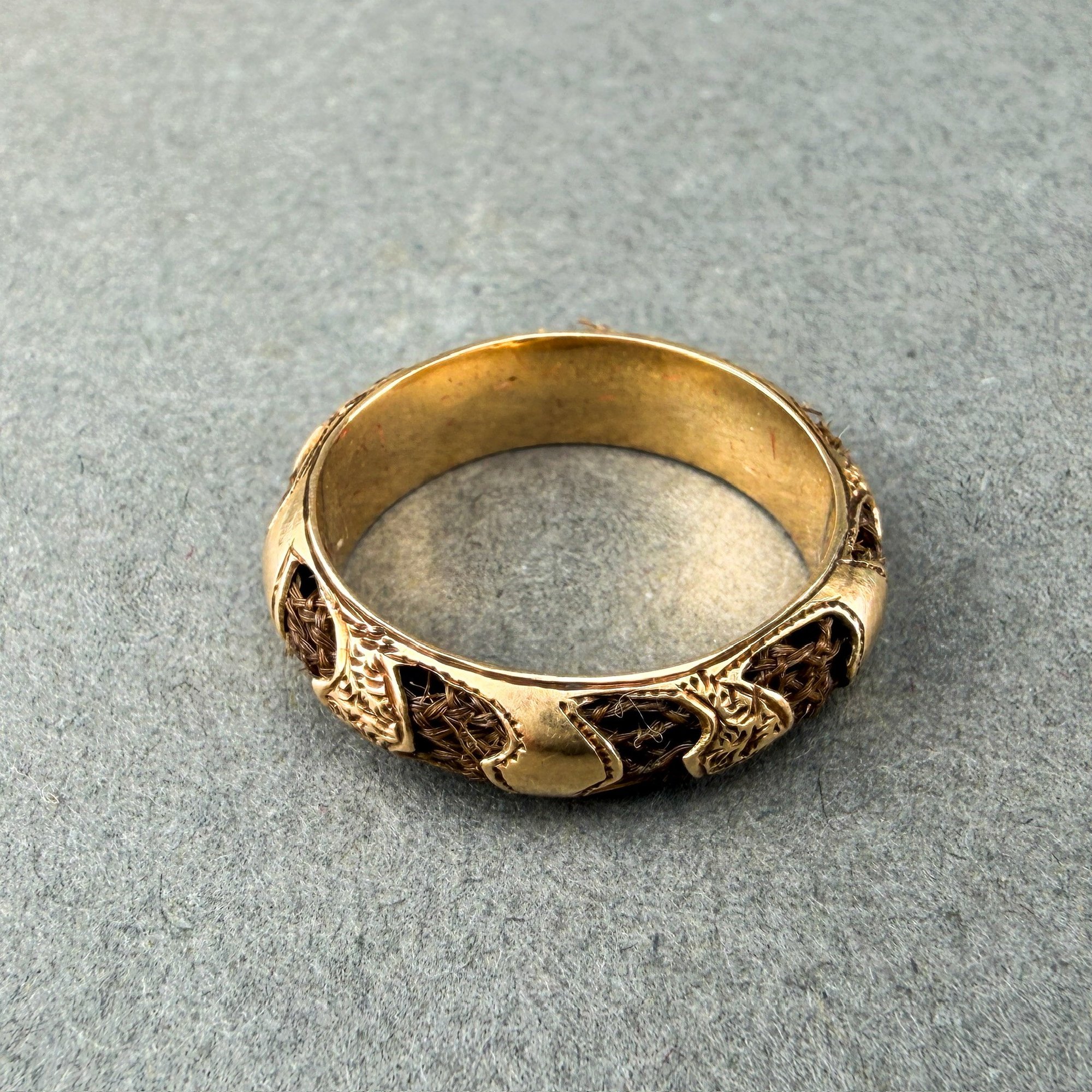 Victorian 9-10 kt gold and woven hair mourning ring.