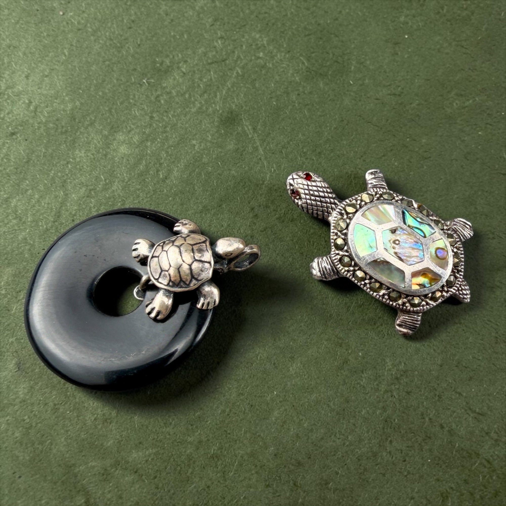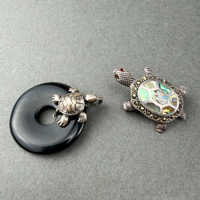 Sterling silver and onyx disc pendant and an abalone, garnet and marcasite pin.
