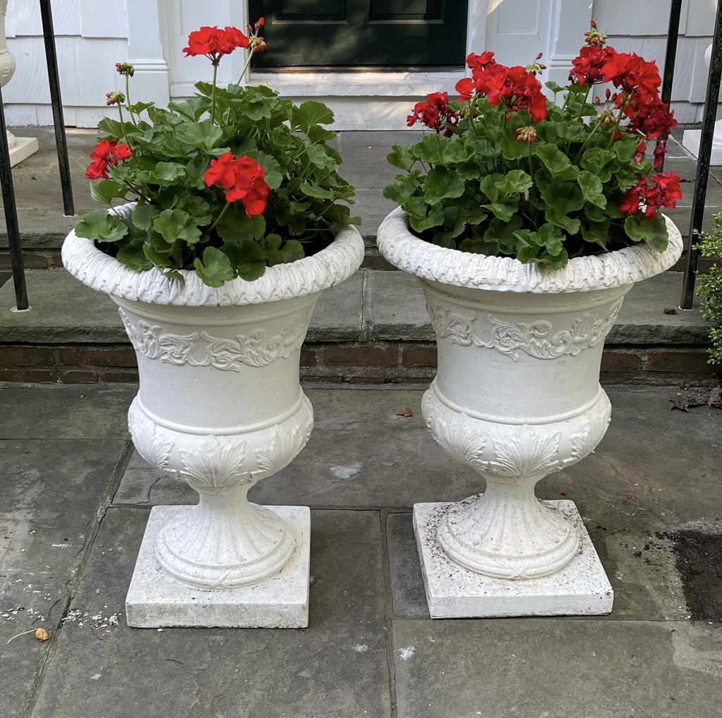 Decorative large white urn planters made from resin. Handcrafted and beautifully detailed in mixed white composite. Weather resistant.
